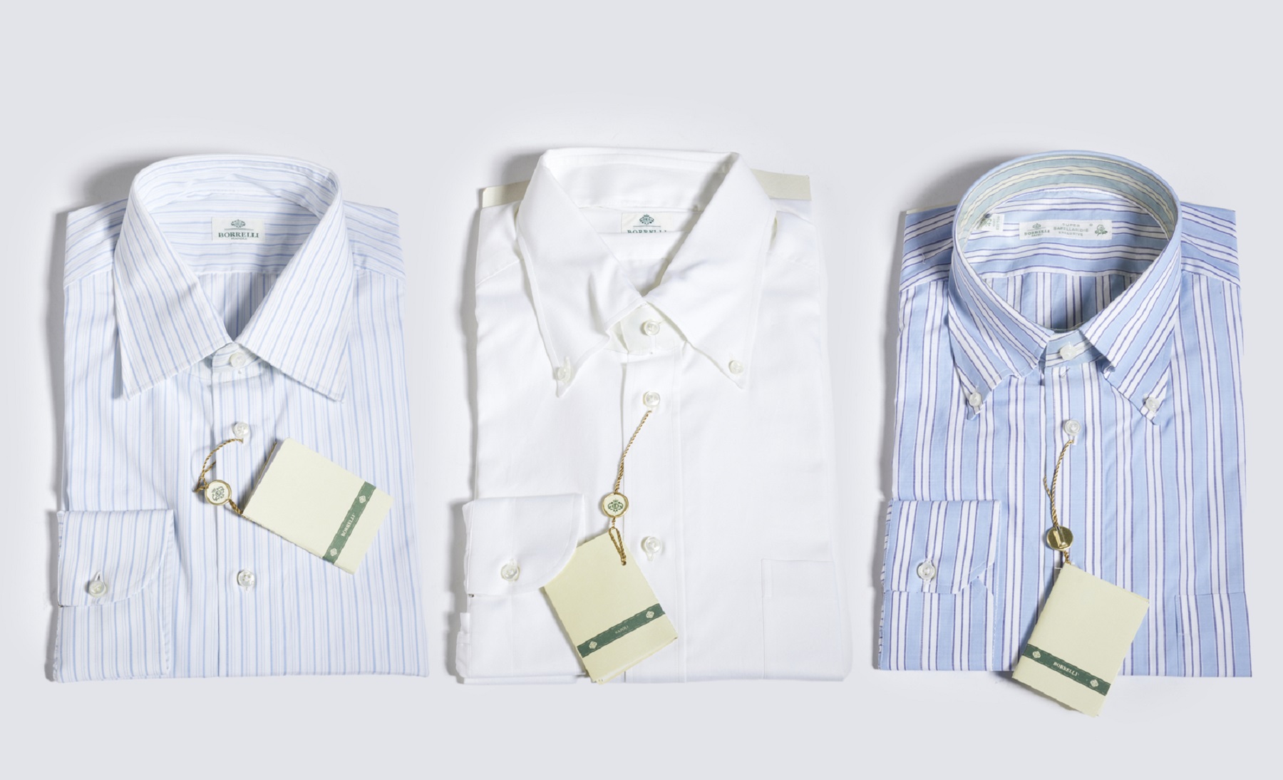 BORRELLI Lotto composto da tre camicie. Cotone. . Lotto composto da tre camicie Borrelli. Una camicia bianca a righe sottili azzurre; una camicia azzurra a righe bianche e una camicia bianca, entrambe con collo button down. Taglia 17/43. Nuove con cartellino.