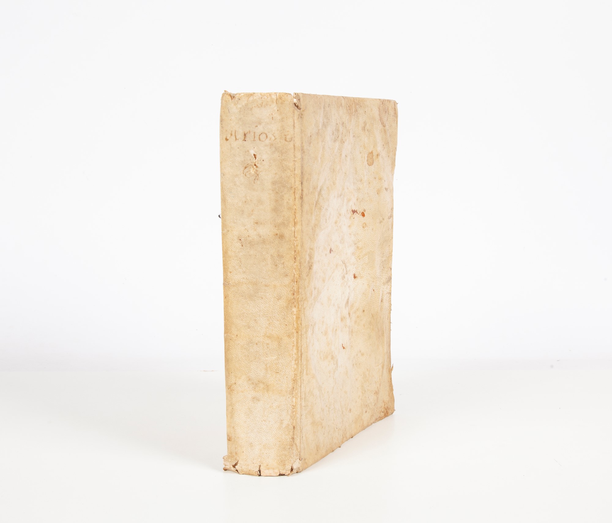 Orlando Furioso di M. Lodovico Ariosto, Tutto ricorretto, et di nuove figure adornato. Con le Annotationi, gli Argomenti, & le Dichiarationi di Ieronimo Ruscelli. In 4° (16), 654, (32) pagine. Frontespizio figurato inciso in xilografia con ritratto dell'Ariosto entro ovale. Opera iIllustrata con 51 magnifiche tavole xilografiche a piena pagina, probabilmente opera di Dosso Dossi (46 per i canti del dell'Orlando Furioso e 5 per i Cinque Canti).Piena pergamena coeva con titolo manoscritto al dorso. Restauro professionale in basso e a destra del frontespizio e all'angolo inferiore delle Carte A1-A2. Vincenzo Valgrisi, Venezia 1565 cm 25x18