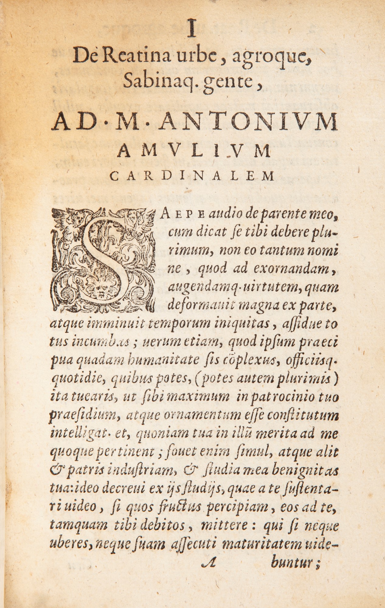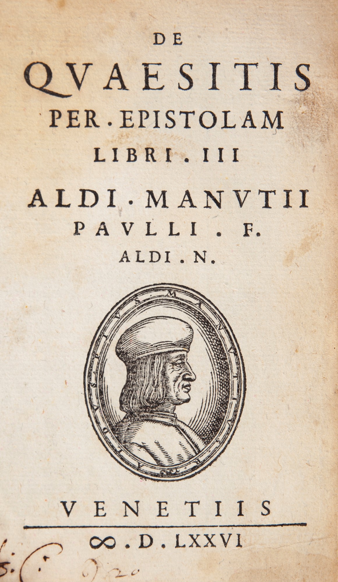 (ALDINA) Aldo Manuzio il Giovane - De Qaesitis per. epistolam Libri. III. Aldi Manutij Paulli F. Aldi. N. 3 parti in una. In 8°. Con ritratto di Aldo Manuzio il Vecchio sul frontespizio. Testo in corsivo tondo. Rara prima edizione di quest'opera antiquaria scritta da Aldo il Giovane sotto forma di raccolta, dove questioni erudite vengono trattate ed illustrate in forma di epistole indirizzate ad amici e sodali quali Mureto, Sigonio e Pinelli, ma anche cardinali come G. Sirleto e A. Farneseche; tratta di arti liberali, di astronomia e questioni tolemaiche. Erudito della seconda generazione dell'Umanesimo italiano, fu l'ultimo membro della celebre famiglia attivo come stampatore a Venezia, figlio di Paolo Manuzio e nipote dell'omonimo famoso tipografo veneziano. Legatura del XIX in piena pelle. Leggere fioriture ad alcune pagine. Aldo Manuzio, Venezia 1576 cm 17x11