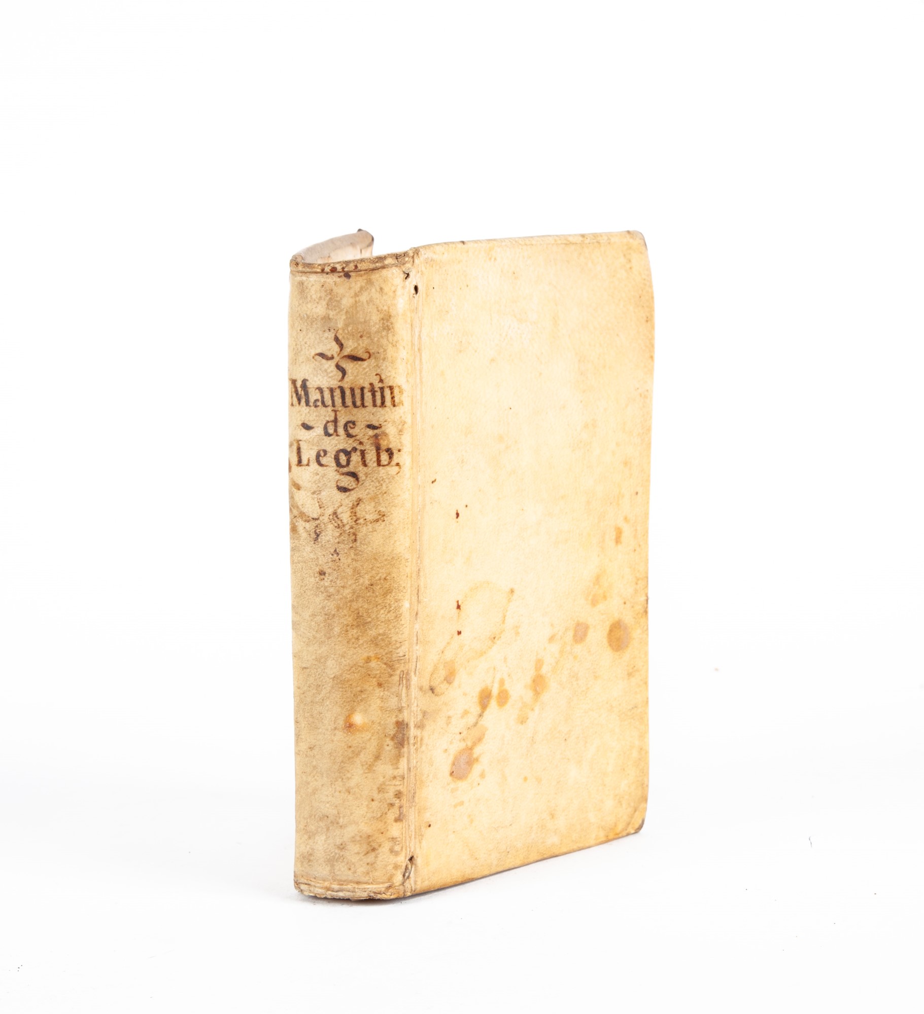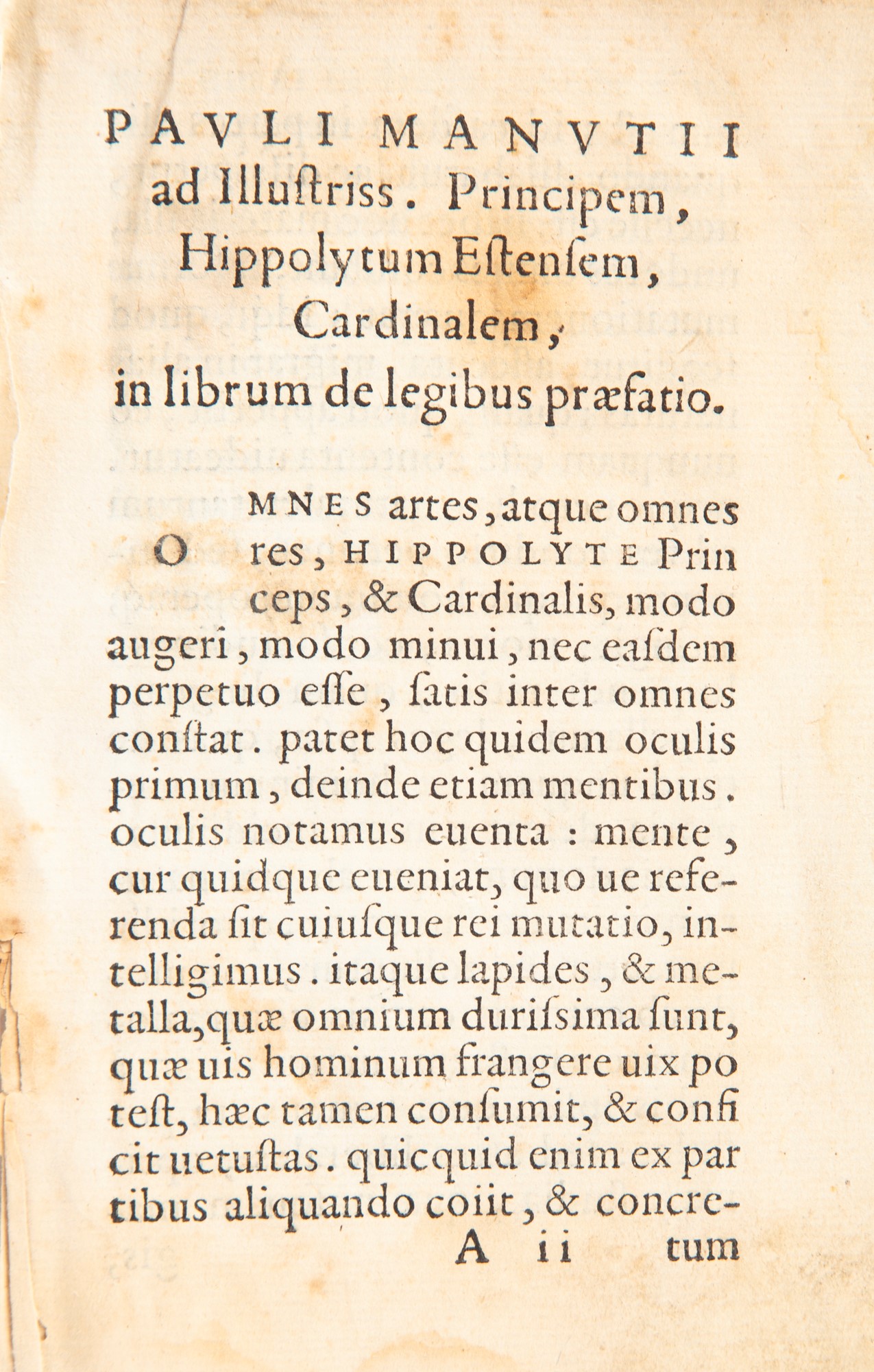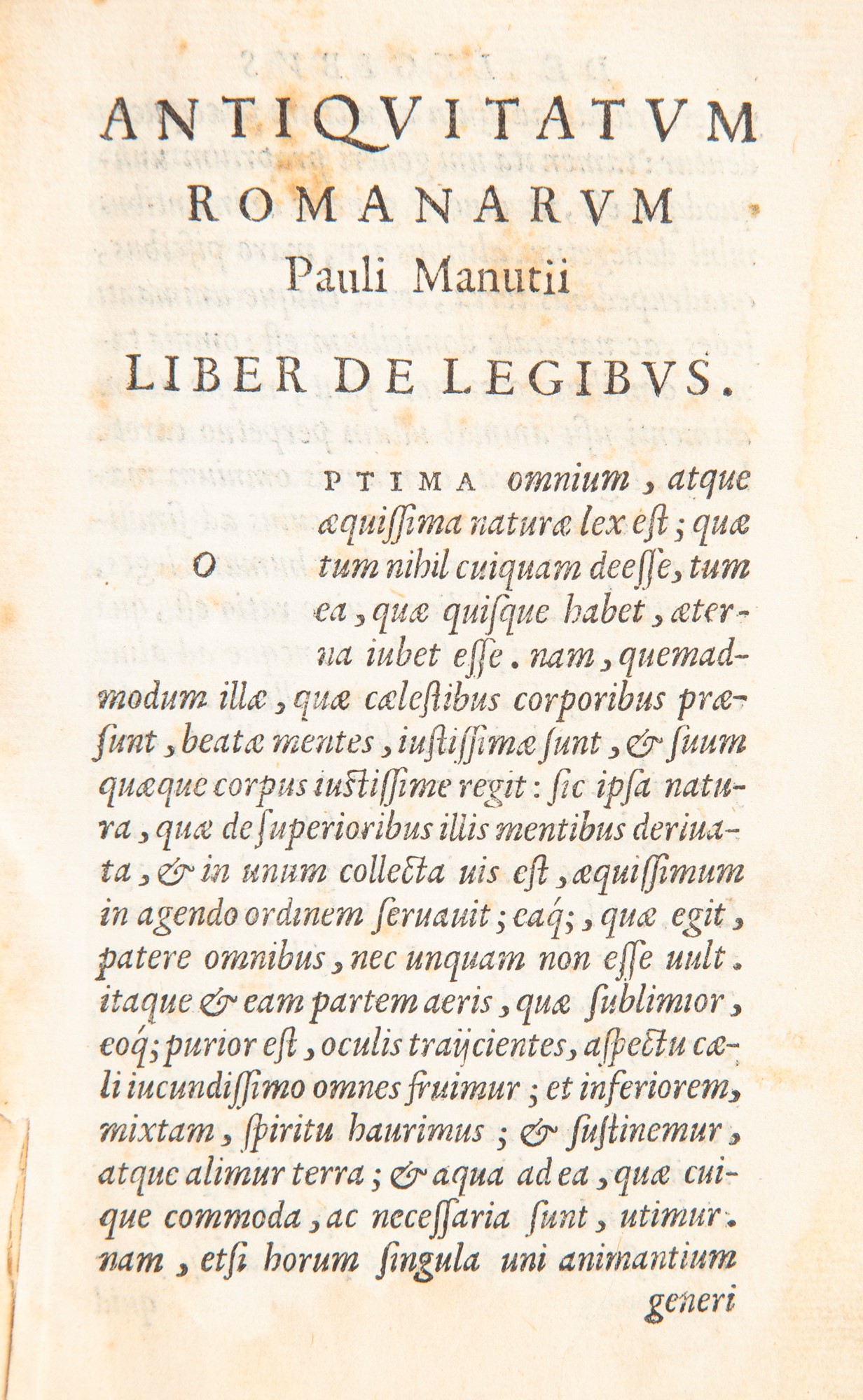 Antiquitatum Romanarum Pauli Manutii liber de legibus. Index rerum memorabilium In 8°. Mancante del frontespizio. Celebre opera di Paolo Manuzio figlio di Aldo, stampata in prima edizione a Venezia nel 1557 e concepita in quattro parti sulle Antichità romane. Solo la presente, dedicata alla legislazione, vide la luce prima della morte dell'autore, i "De Senatu", "De Comitiis" e "De Civitate Romana" furono pubblicati solo in seguito. Legatura in piena pergamena settecentesca con titolo manoscritto al dorso. Tagli spruzzati. Esemplare parzialmente slegato con alcune antiche annotazioni manoscritte ai margini di alcune carte. Tracce di gore e macchie, qualche piccolo strappo. Antico restauro che non lede il testo. Paolo Manuzio, Venezia 1559 Cm 16x11