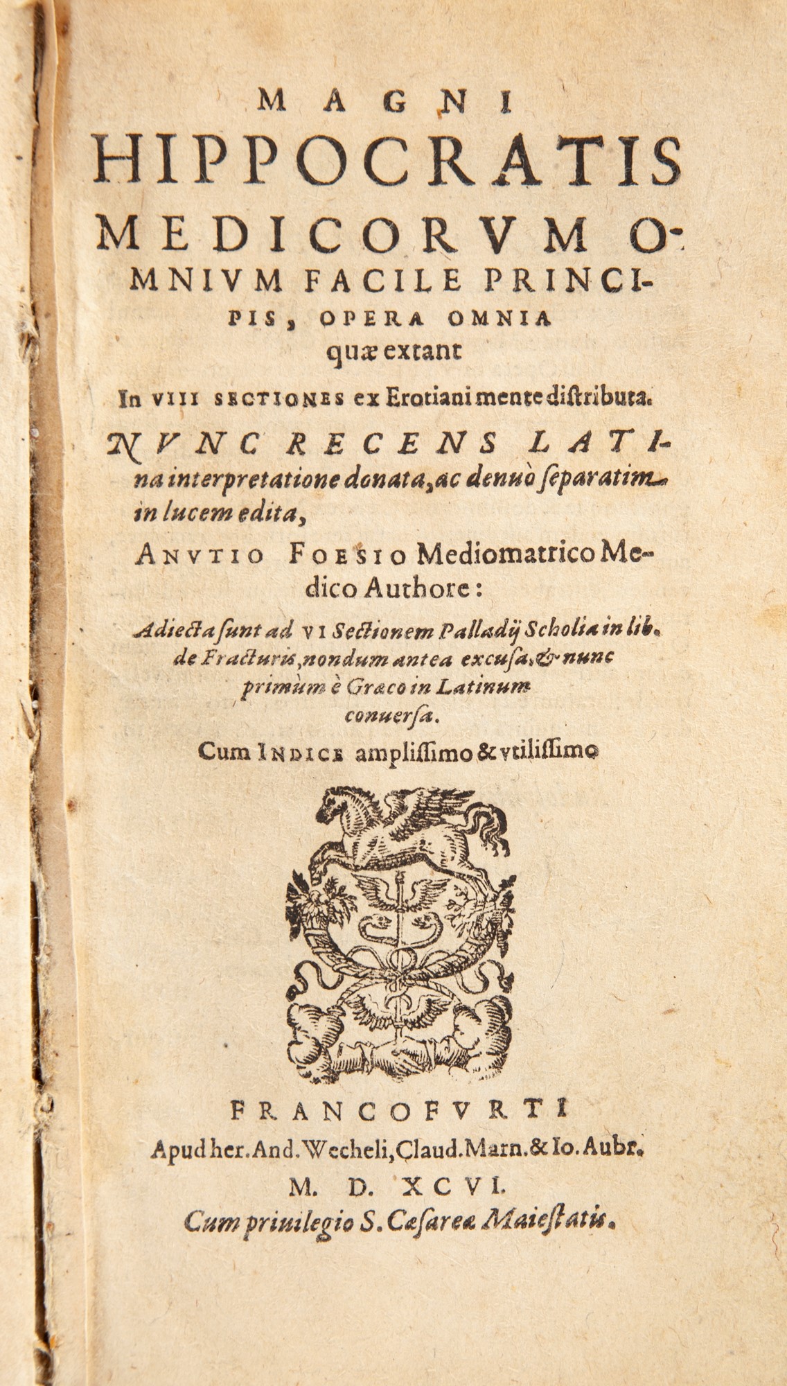 In 8°. Edizione in latino successiva a quella in folio (1595) della traduzione dal greco al latino dell'opera completa di Ippocrate nella versione con annotazioni del medico Anuzio Foesio Mediomatrico (Anuce Foes). Le opere di Ippocrate sono in realtà un insieme di una sessantina di scritti composti tra il 450 e il 350 a.C. che costituiscono la principale fonte di informazioni sulla medicina greca prima dell'epoca alessandrina. Fu nel corso del XVI secolo che gli studiosi diedero gradualmente vita a un corpus ippocratico in latino la cui traduzione rimase attuale per circa 250 anni fino alla sua sostituzione con l'edizione francese di Littré (1839-1861). Le edizioni che permisero questo risultato furono la prima in latino (1525 Roma) e poi in greco (1526 Aldo Manuzio), che permisero la scoperta di manoscritti fino ad allora praticamente sconosciuti. Seguirono poi le edizioni Balois del 1538 e Froben del 1546 che effettuarono la correzione sistematica delle edizioni originali. Nel 1595 il medico di Metz Anuce Foes (1528-1595) stampò questa edizione bilingue greco/latino "esatta e completa delle opere di Ippocrate, opere tanto desiderate, quanto invano a lungo attese". Legatura in piena pergamena coeva rigida con titolo manoscritto al dorso.