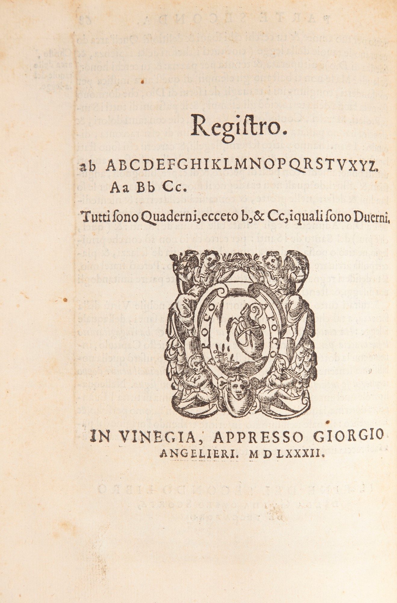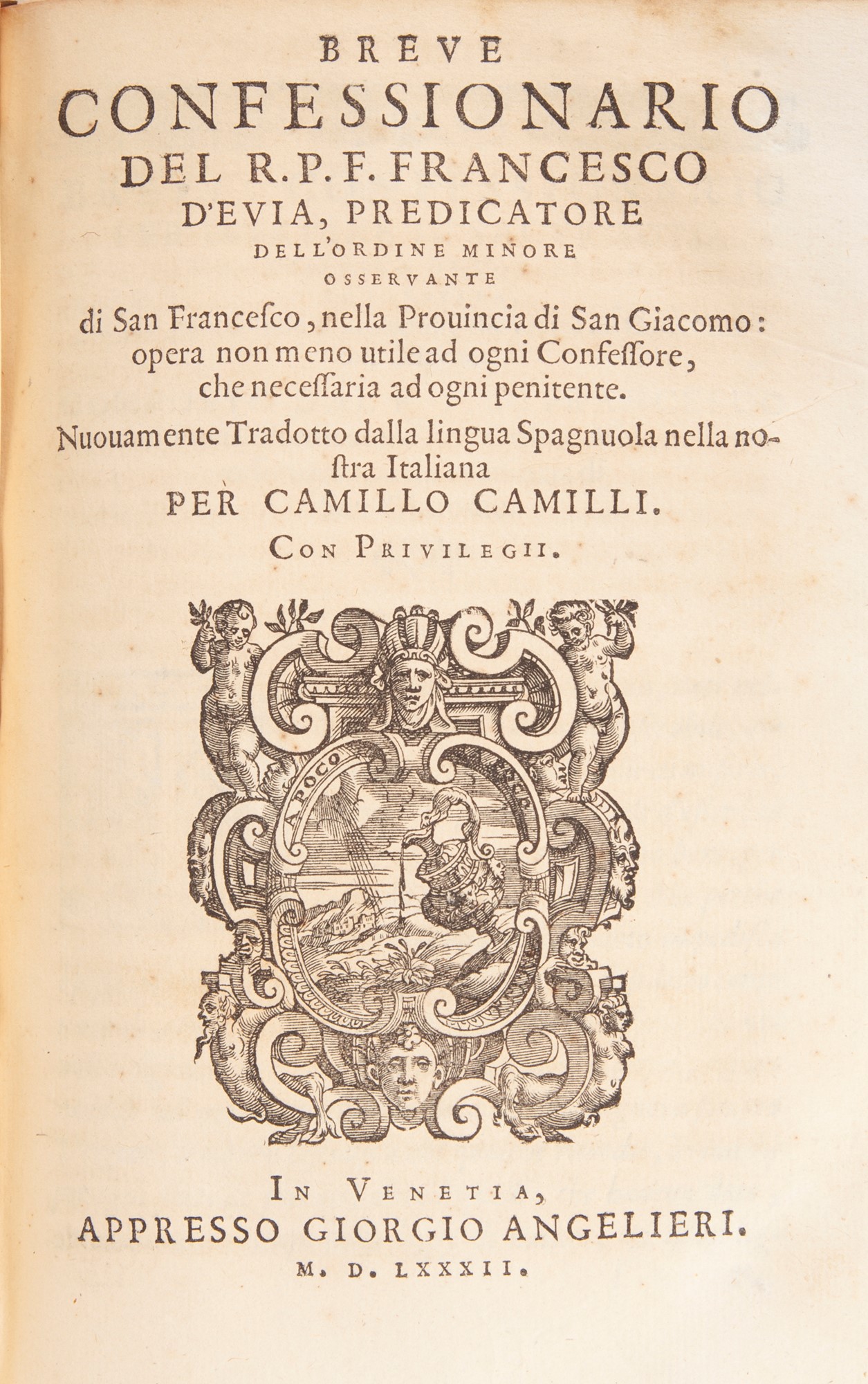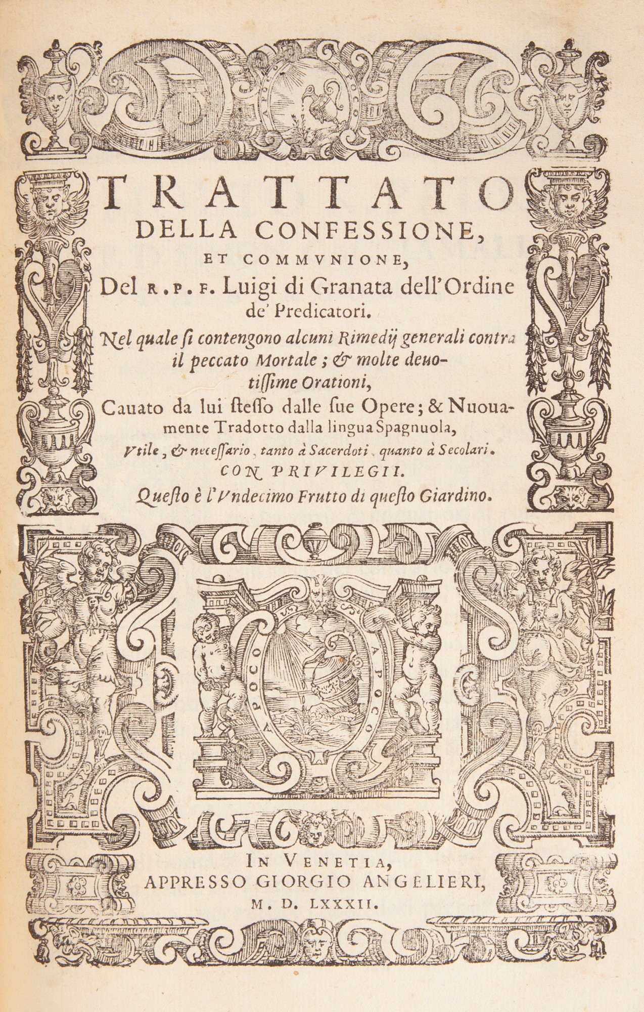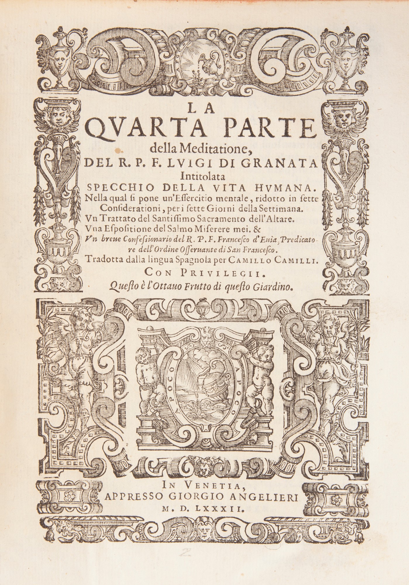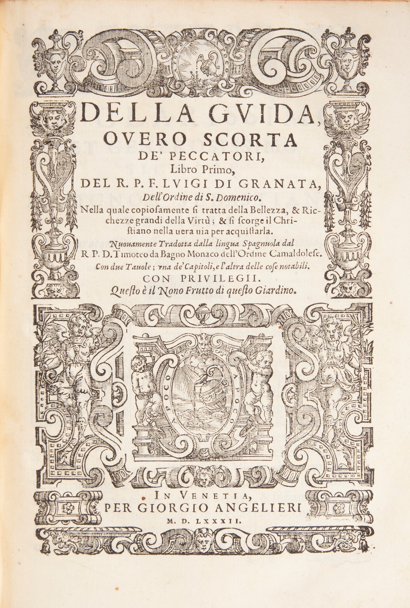 Fra' Luigi di Granada - La Quarta parte della Meditazione; Della Guida overo Scorta de' Peccatori (Libro Primo e Libro Secondo); Trattato della Confessione et Communione; Unito: Francesco d'Evia - Breve Confessionario In 4° La prima opera fa parte di La Prima (Quarta) parte dell'Oratione et Meditatione per li giorni della settimana, & per altro tempo, del R.P.F. Luigi di Granata dell'Ordine de' Predicatori. Opera del celebre teologo e frate domenicano spagnolo, al secolo Luis de Sarria (1504-1588), Grande inquisitore di Spagna, predicatore di prestigio altamente riconosciuto. Legato assieme ad altre 2 opere del frate spagnolo con stesse marche tipografiche, editore, luogo e date di stampa. Legatura in mezza pergamena con angoli del XIX secolo. Tagli rubricati. Giorgio Angelieri, Venezia 1582 cm 21,5x16