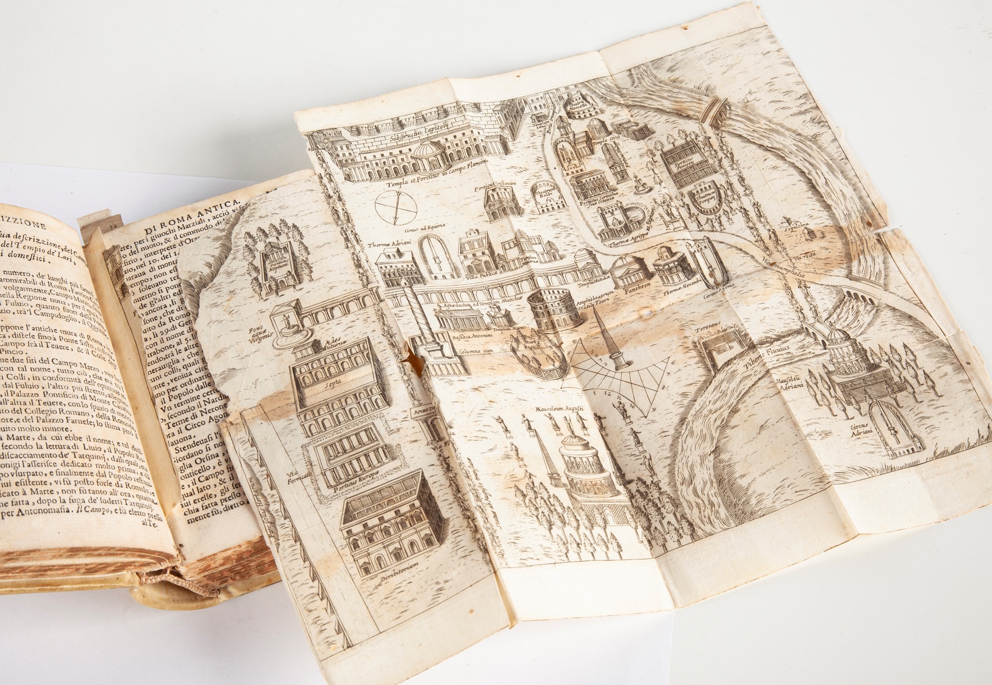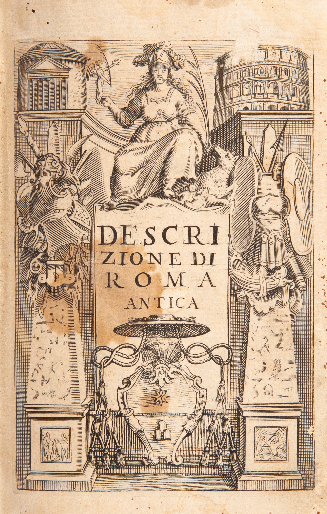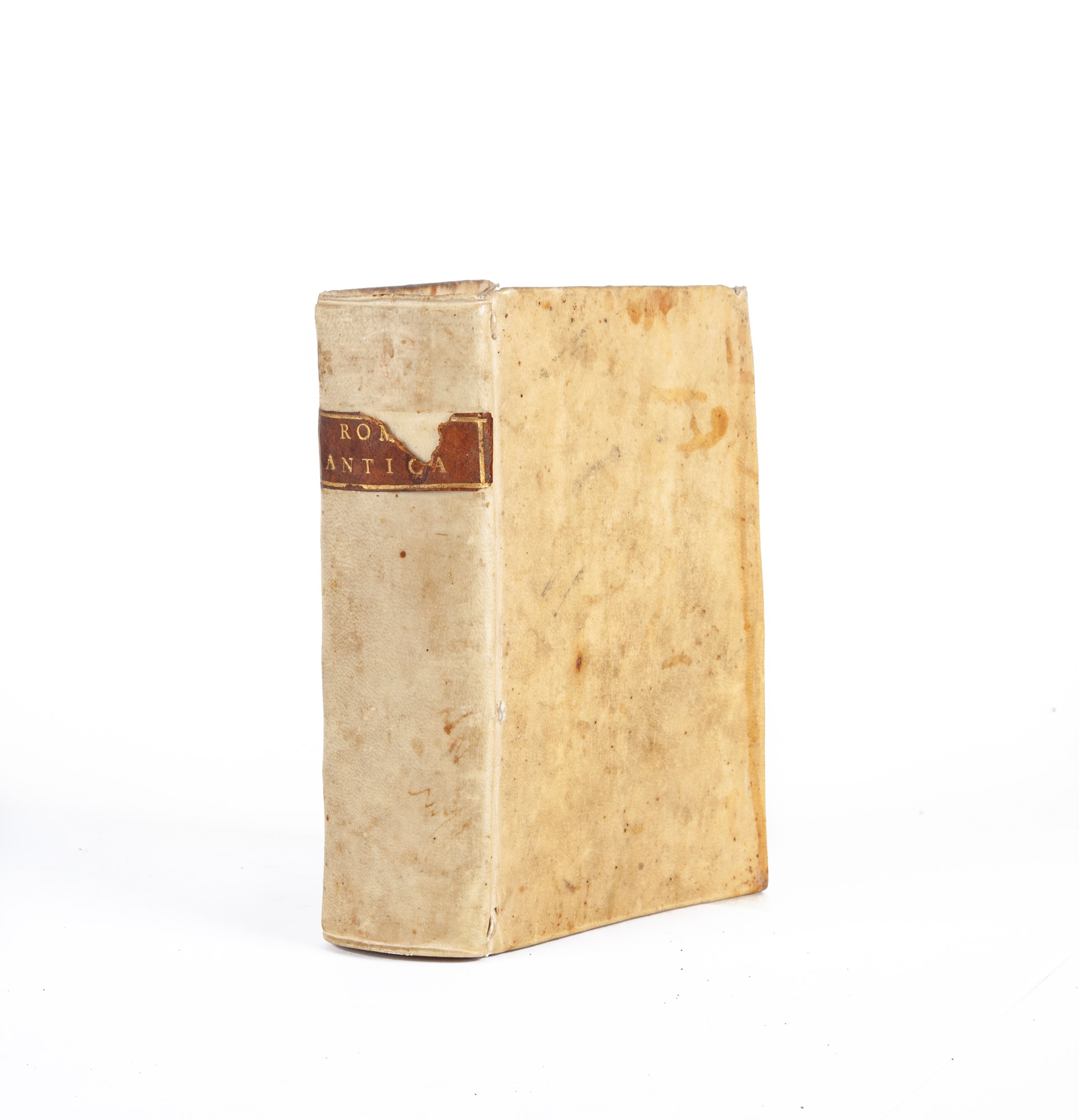 Descrizione di Roma Antica formata nuovamente con le Autorita Bartolomeo Marliani, di Onofrio Panvinio, Alessandro Donati, Famiano Nardini, e d'altri celebri Scrittori antichi, & Antiquari moderni. Accresciuta di moltissime Figure in Rame, di varie Medaglie, e di curiose Notizie Istoriche. Riccamente illustrata con 124 incisioni e 2 grandi piante, in fine la cronologia degli Imperatori Romani. Legatura coeva in piena pergamena con tassello di pelle al dorso. Tagli marmorizzati. Le piante con alcuni strappi e piccole mancanze. Michelangelo Rossi, Roma 1697 cm 17x11,5