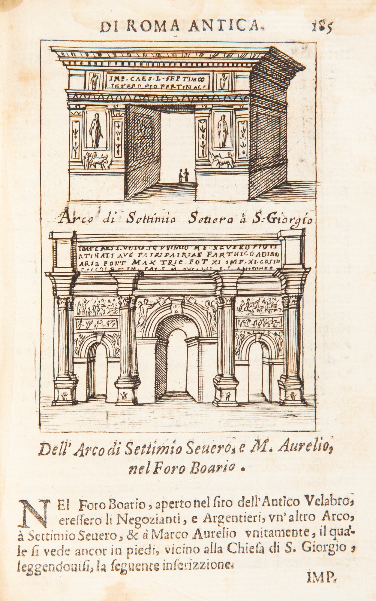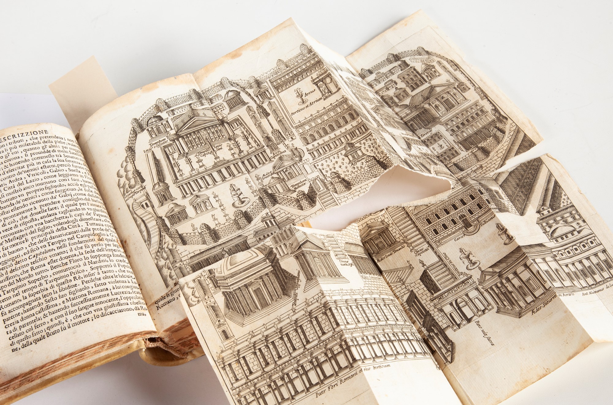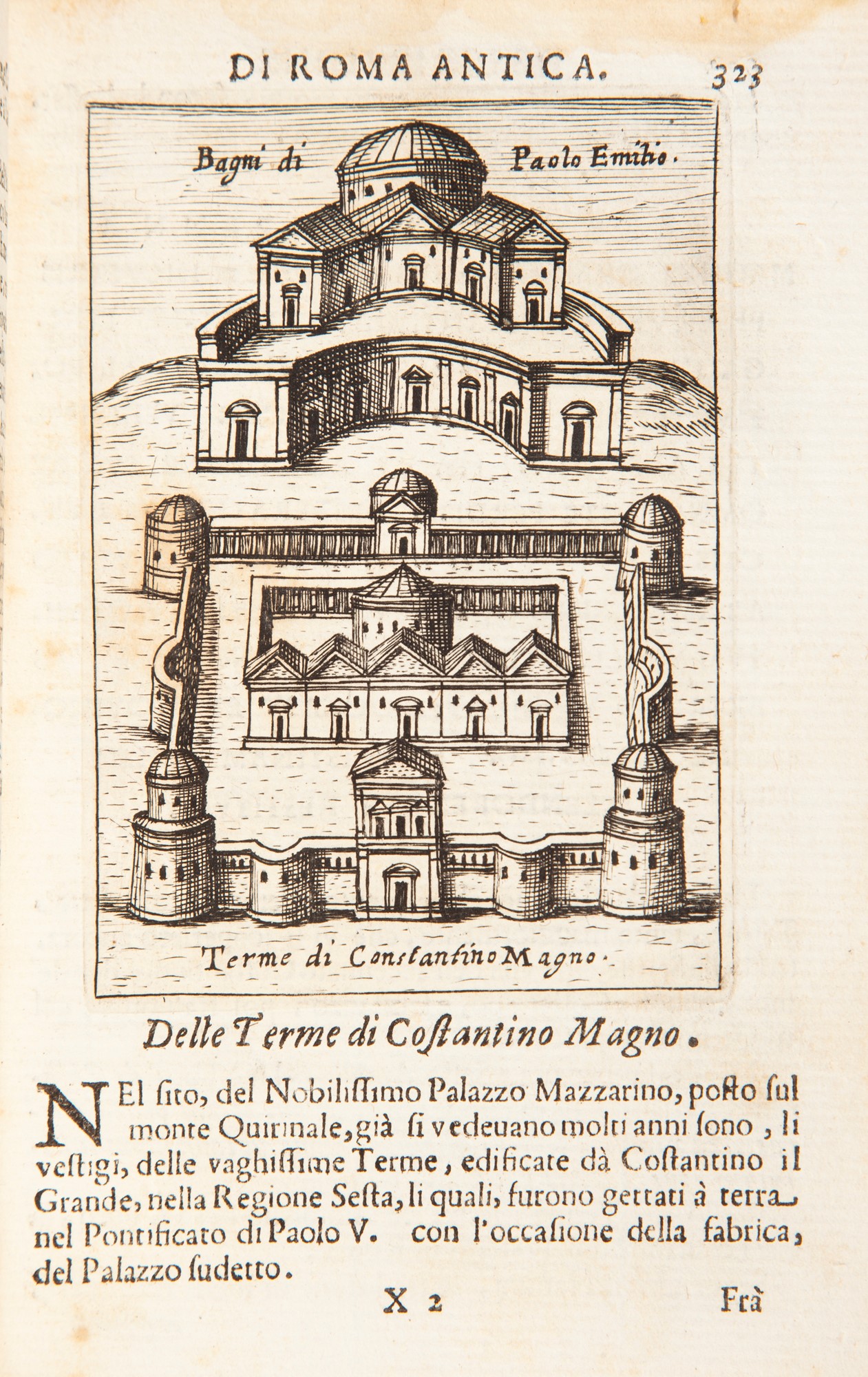 Descrizione di Roma Antica formata nuovamente con le Autorita Bartolomeo Marliani, di Onofrio Panvinio, Alessandro Donati, Famiano Nardini, e d'altri celebri Scrittori antichi, & Antiquari moderni. Accresciuta di moltissime Figure in Rame, di varie Medaglie, e di curiose Notizie Istoriche. Riccamente illustrata con 124 incisioni e 2 grandi piante, in fine la cronologia degli Imperatori Romani. Legatura coeva in piena pergamena con tassello di pelle al dorso. Tagli marmorizzati. Le piante con alcuni strappi e piccole mancanze. Michelangelo Rossi, Roma 1697 cm 17x11,5