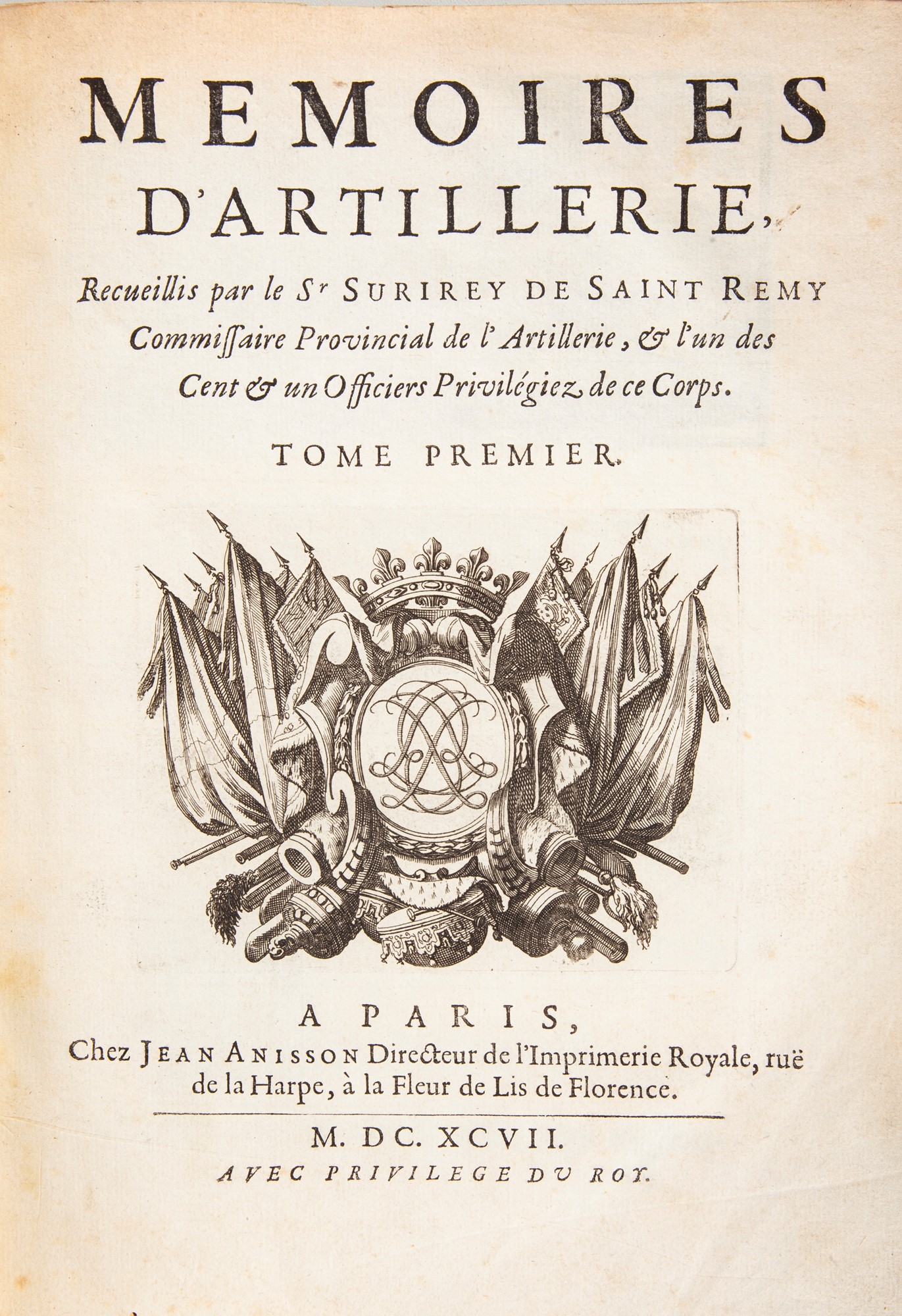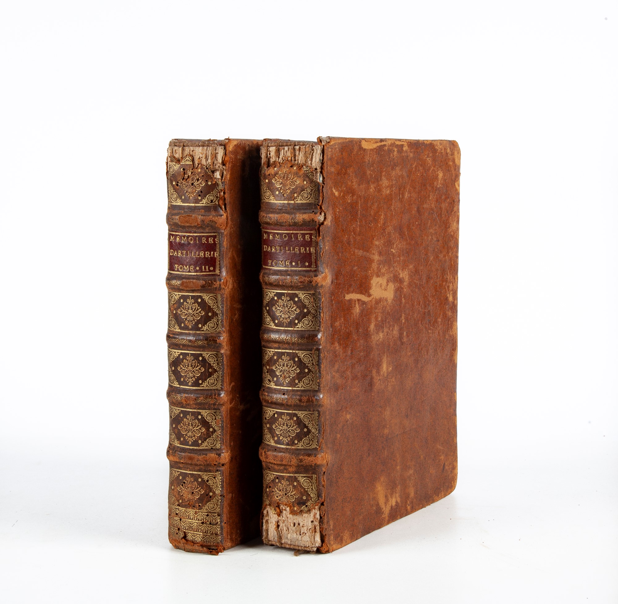 Pierre Surirey de Saint-Remy - Mémoires d'artillerie (Vol. I-II) In 4° 2 Volumi Prima edizione riccamente illustrata con tavole più volte rilegate. Doppio antiporta con Frontespizio allegorico di Dieu e ritratto dell'autore di Rigault. Legature a 5 nervi coeve in vitello spruzzato con titoli e fregi in oro ai dorsi (lievi difetti e mancanze, lavori di tarlo che non interessano l'interno tranne che le carte del primo volume fino ad E ij). Jean Anisson, Parigi 1697 cm 25x19,5