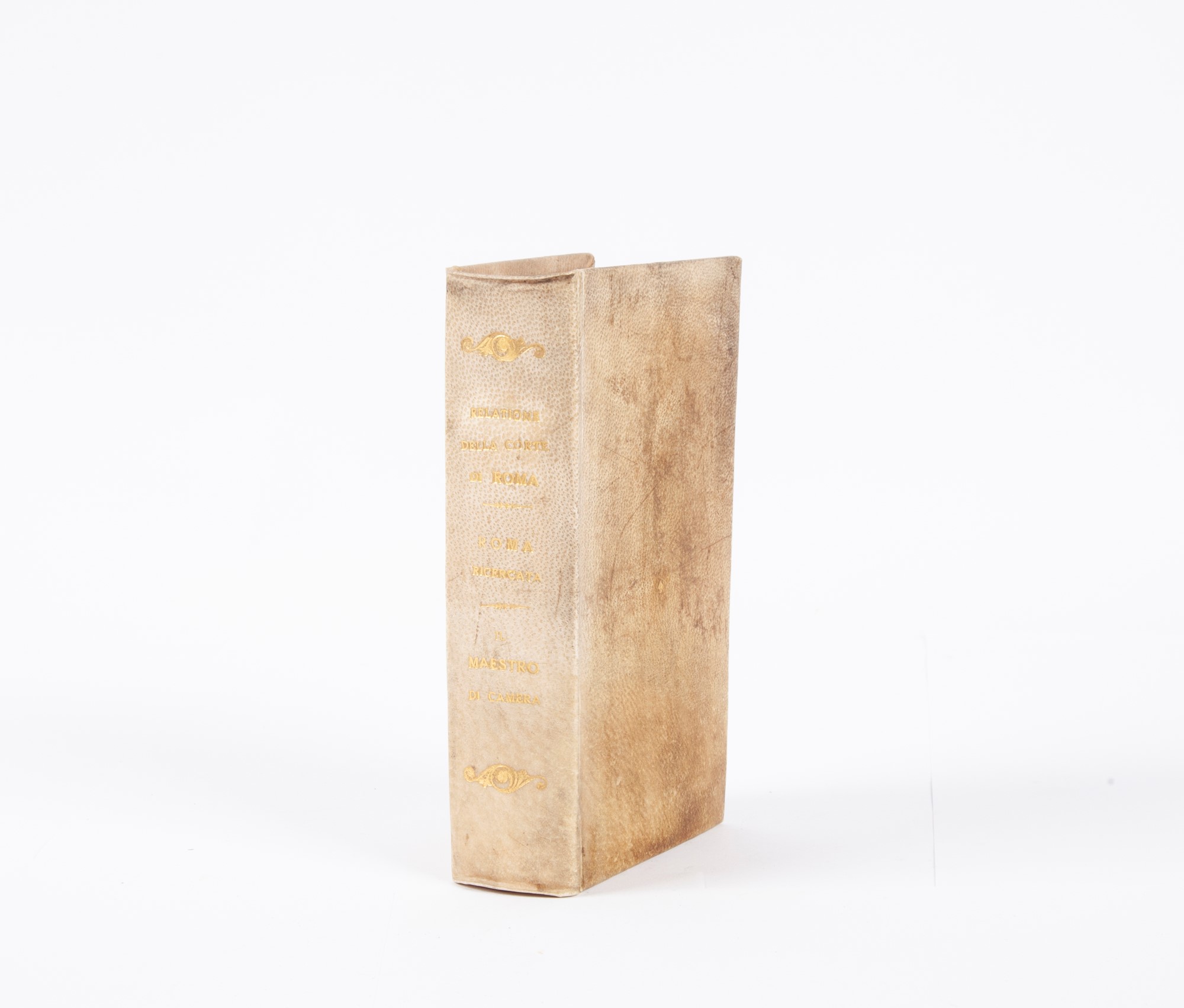 Girolamo Lunardo - Relatione della corte di Roma; Francesco Sestini - Il Maestro di Camera; Fioravante Martinelli - Roma Ricercata nel suo sito, et nella Scuola di tutti gli Antiquarij Quinta Impressione In 12° 3 Volumi in uno. Ogni opera ha un proprio frontespizio con la propria marca tipografica. Legatura del XX secolo in piena pergamena con titoli in oro al dorso. Antonio Tiuanni, Venezia 1689 cm 14,5x8
