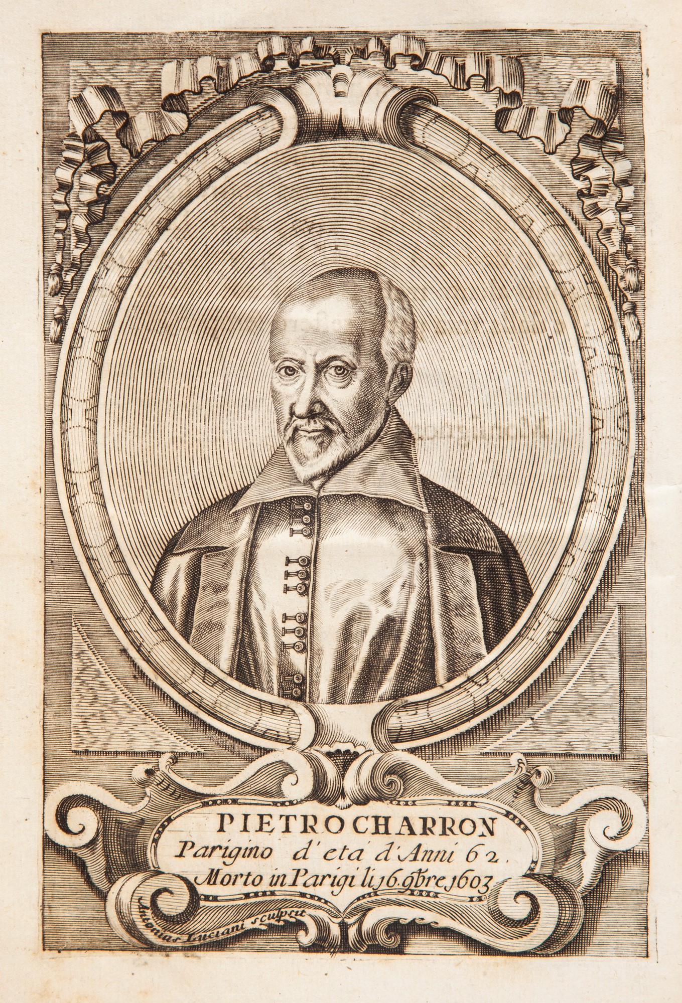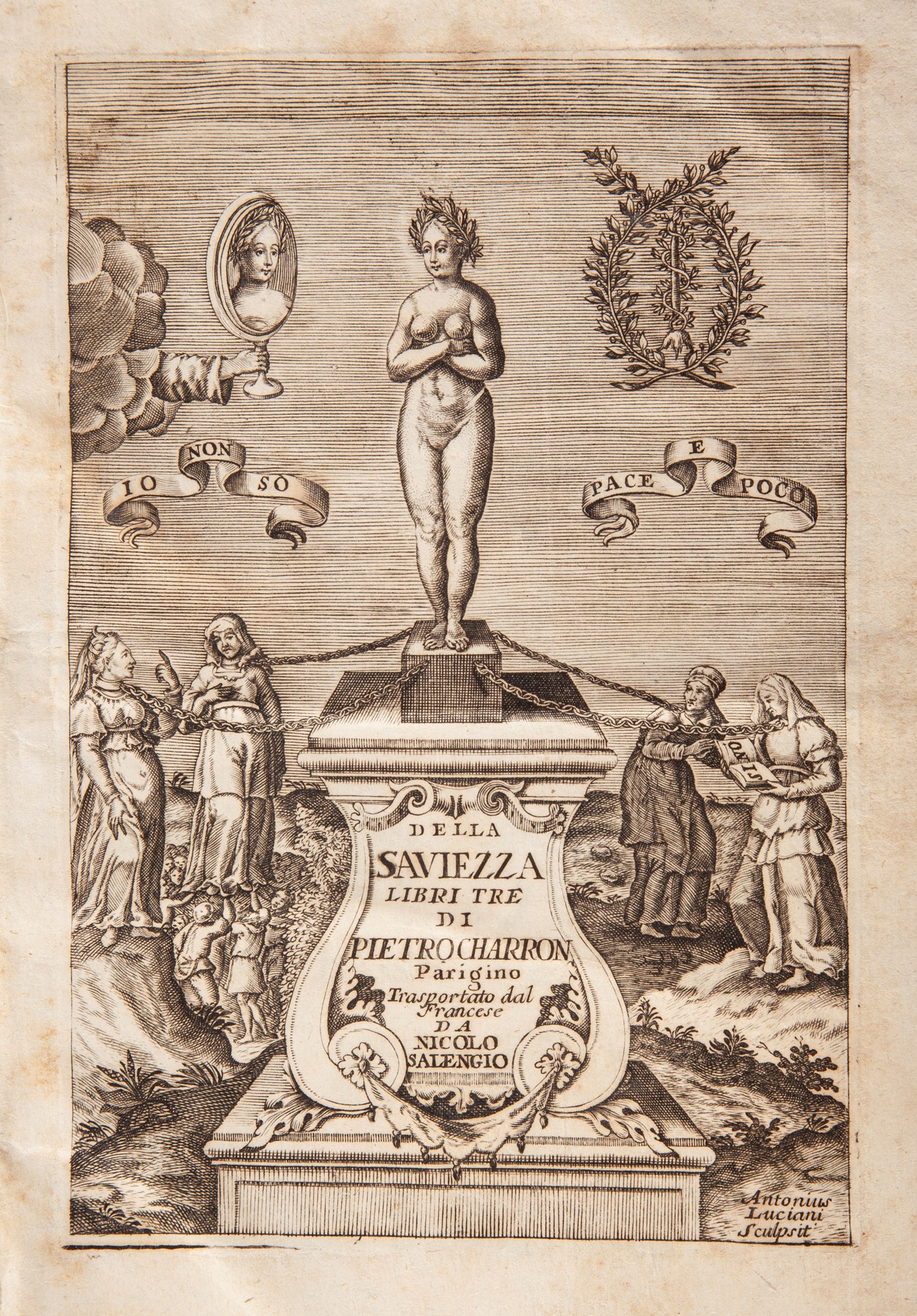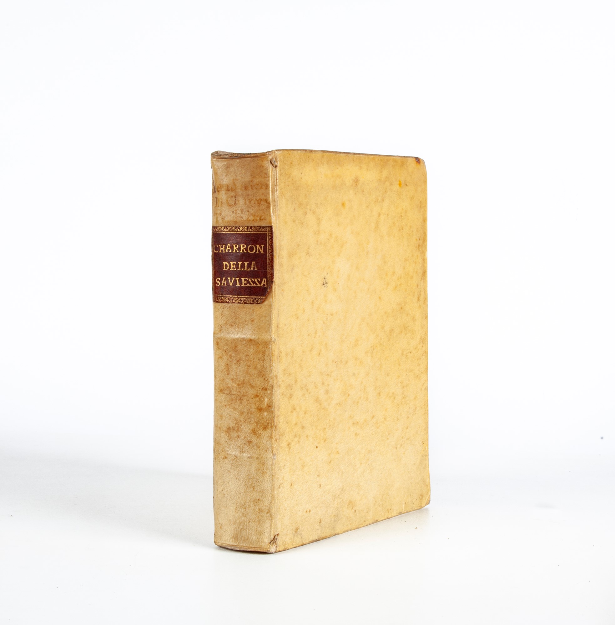 Pietro (Pierre) Charron - Della Saviezza Libri Tre. Trasportato dal Francese da Nicolò Salengio Illustrato con Antiporta figurato con un'incisione allegorica, e con una tavola raffigurante il ritratto dello Charron, ambedue di Antonio Luciani. Bella traduzione in italiano sull'originale di Bordeaux del 1601, di un libro messo all'Indice e condannato per le teorie della filosofia del dubbio, ritenute poi patrimonio dei cosiddetti spiriti forti. Amico del Montaigne (che gli morì tra le braccia), nell'intento di promuovere la tolleranza nella Parigi devastata dalle guerre confessionali scivolò nel relativismo. Legatura coeva in piena pergamena con tassello di pelle con titolo in oro al dorso. Wilhelmus Friesem, Colonia 1698 cm 24x18