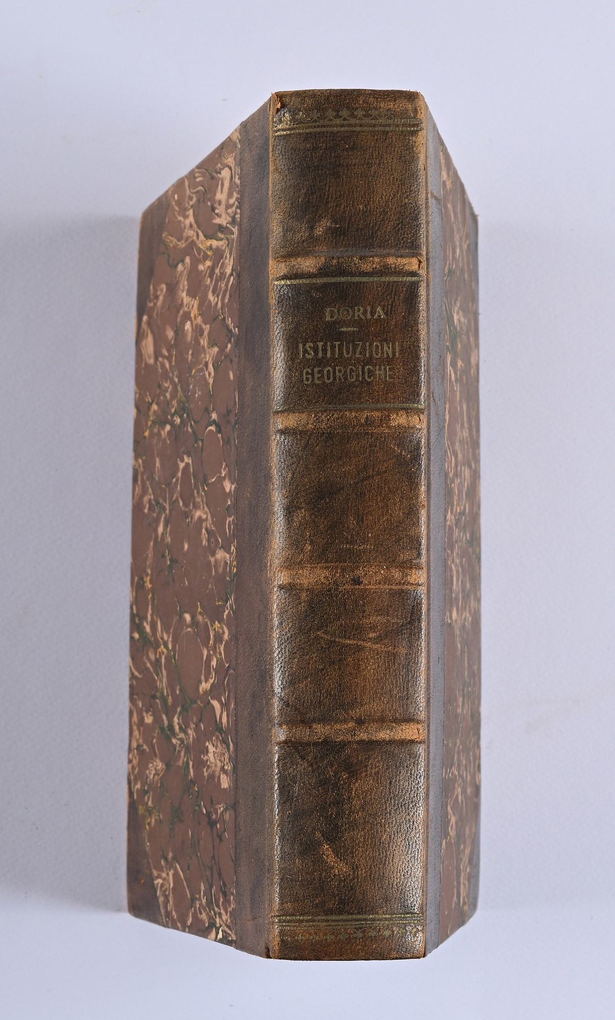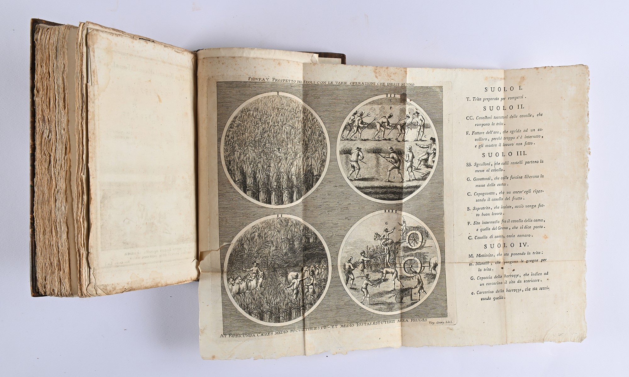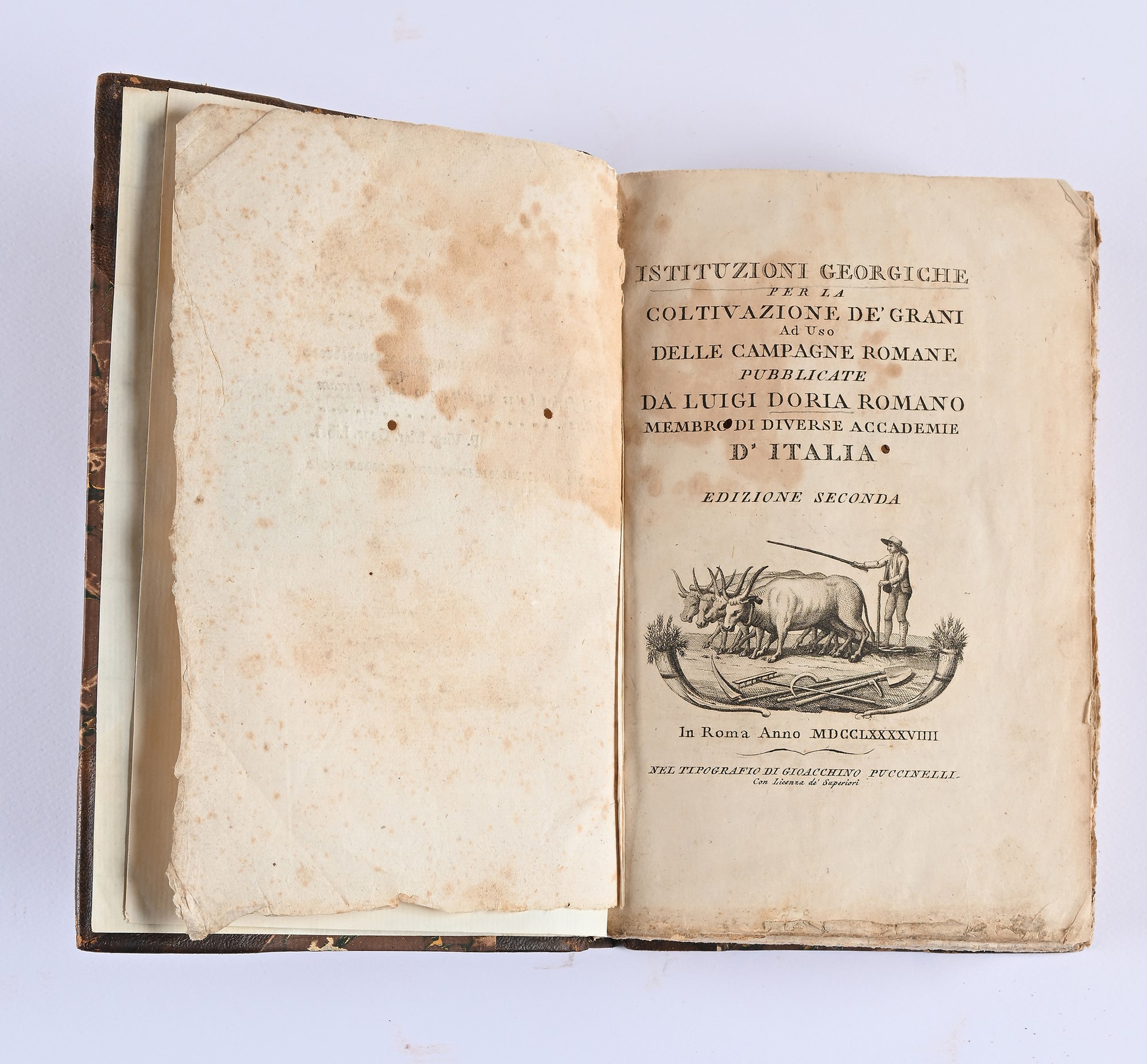 Luigi Doria - Istituzioni georgiche per la coltivazione de' grani ad uso delle campagne romane. Edizione Seconda In 8° Iliustrata con cinque tavole in rame fuori testo, ripiegate più volte, di notevole bellezza e vivacità, opera di Cosimo Zocchi. L'opera (prima edizione 1777) descrive i precetti e metodi agli agricoltori per ottenere la miglior produzione di frumento dai terreni del territorio laziale e contiene indicazioni specifiche utili alla coltivazione della campagna romana dalle strutture fondiarie peculiari. Alla fine volume si trovano la lista delle faccende, la tariffa dei salari da pagarsi e delle spese da farsi. Legatura novecentesca in mezza pelle a 4 nervi con angoli in pelle e titolo al dorso. Gioacchino Puccinelli, Roma 1799 cm 24x15,5