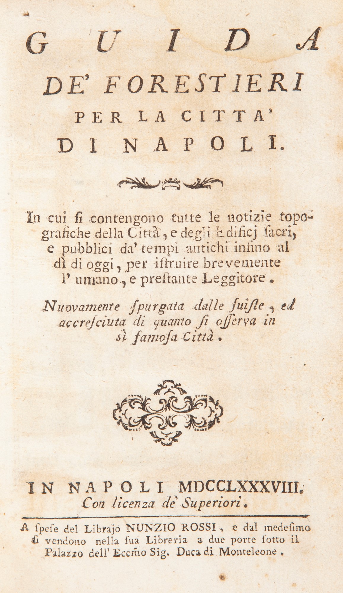 Lot 252 | Guida de' Forestieri per la città di Napoli In cui si contengono tutte le notizie topografiche della Città, e degli Edificj sacri e pubblici da tempi antichi insino al di di oggi.