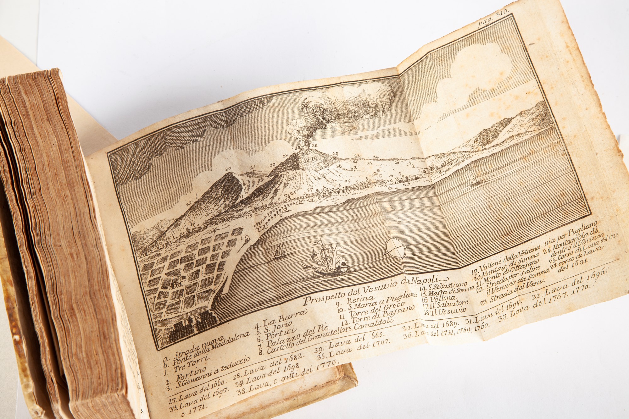 Guida de' Forestieri per la città di Napoli In cui si contengono tutte le notizie topografiche della Città, e degli Edificj sacri e pubblici da tempi antichi insino al di di oggi. 1 Pianta della città e 1 Veduta del Vesuvio ripiegate più volte e 9 tavole di cui una ripiegata più volte. Legatura coeva in piena pergamena con titolo manoscritto al dorso Nunzio Rossi, Napoli 1788 cm 15,5x10