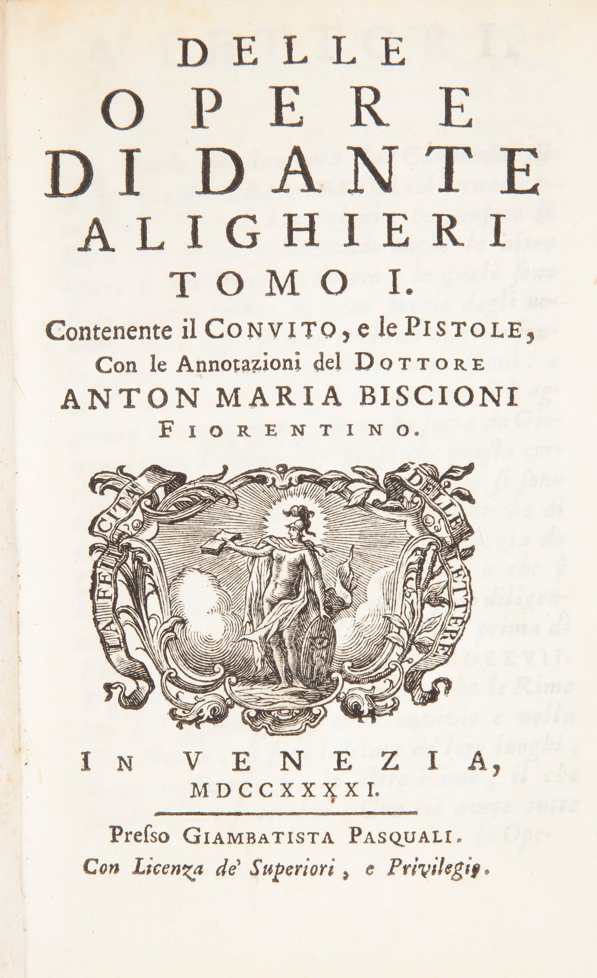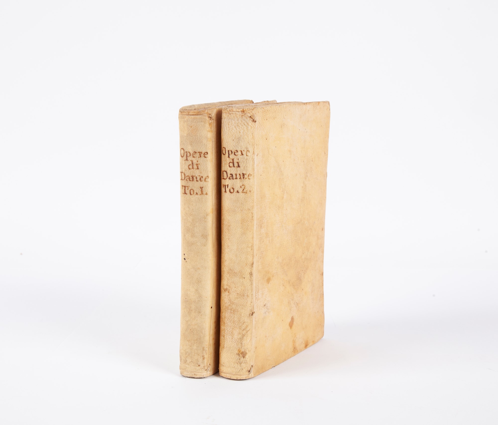 Delle opere di Dante Alighieri con le Annotazioni del Dottore Anton Maria Biscioni. Tomo I e Tomo II In 8° Contenente il Convivio, le Epistole, la Vita Nuova ed il De Vulgari Eloquentia, Prima edizione delle opere minori di Dante (escluso il De monarchia) con il commento di Anton Maria Biscioni, letterato fiorentino, bibliotecario e prefetto della Biblioteca Laurenziana. Questa edizione, certamente la più importante tra gli scritti di Biscioni, ebbe notevole successo e completa la serie di opere di Dante pubblicate da Pasquali, che nel 1739 aveva dato alle stampe la Divina commedia. Legatura coeva in piena pergamena con titoli manoscritti ai dorsi. Tagli marmorizzati. Giambattista Pasquali, Venezia 1741 cm 18x12,5