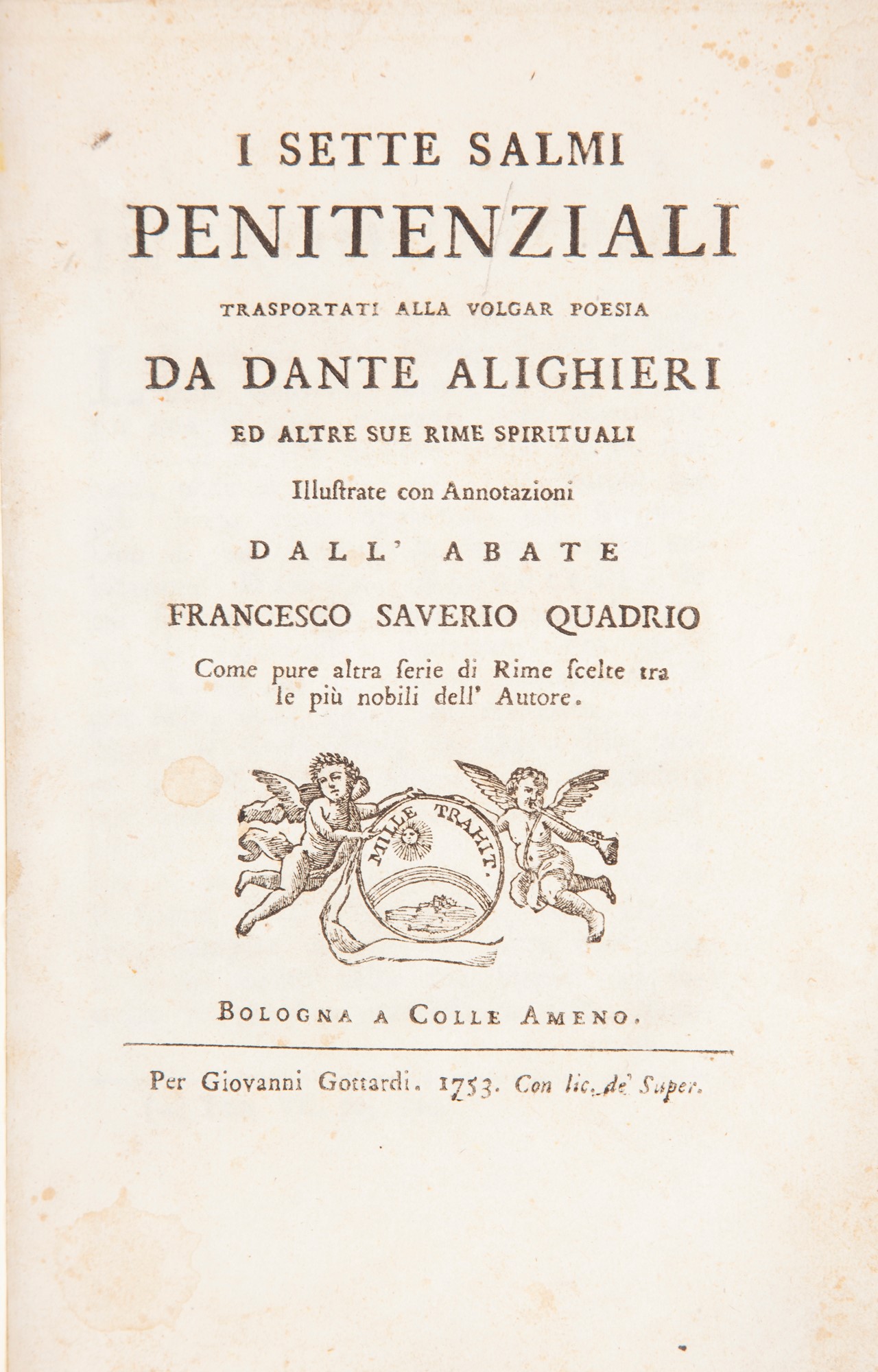 Dante Alighieri - I sette salmi penitenziali trasportati alla volgar poesia da Dante Alighieri Ed altre sue Rime Spirituali illustrate con Annotazioni dall'abate Saverio Quadrio In 8° piccolo. Una delle poche edizioni impresse nella stamperia impiantata nel complesso di villeggiatura del marchese Filippo Carlo Ghislieri a Colle Ameno vicino a Pontecchio, da cui uscirono poco più di 40 titoli nell'arco di un decennio (1753-63). P. Paci, La tipografia di Colle Ameno: "Si tratta della non comune edizione impressa con sobria eleganza di uno tra i componimenti meno noti del Poeta. Il Quadrio ha curate le annotazioni e le rime che chiudono l'opera". Entrambe mancano nell'edizione milanese di cui questa edizione, citata dalla Crusca, è una ristampa della milanese del 1752, con aggiunte in fine al volume. Esemplare mancante del ritratto del poeta di profilo inciso in antiporta, sono invece presenti le incisioni poste a piena pagina a pag. 13 e quella eseguita dallo Zanotti a pagina 191. Legatura in mezza pelle del XX secolo con titoli e fregi in oro al dorso. Giovanni Gottardi, Bologna a Colle Ameno 1753 cm 23,5x17