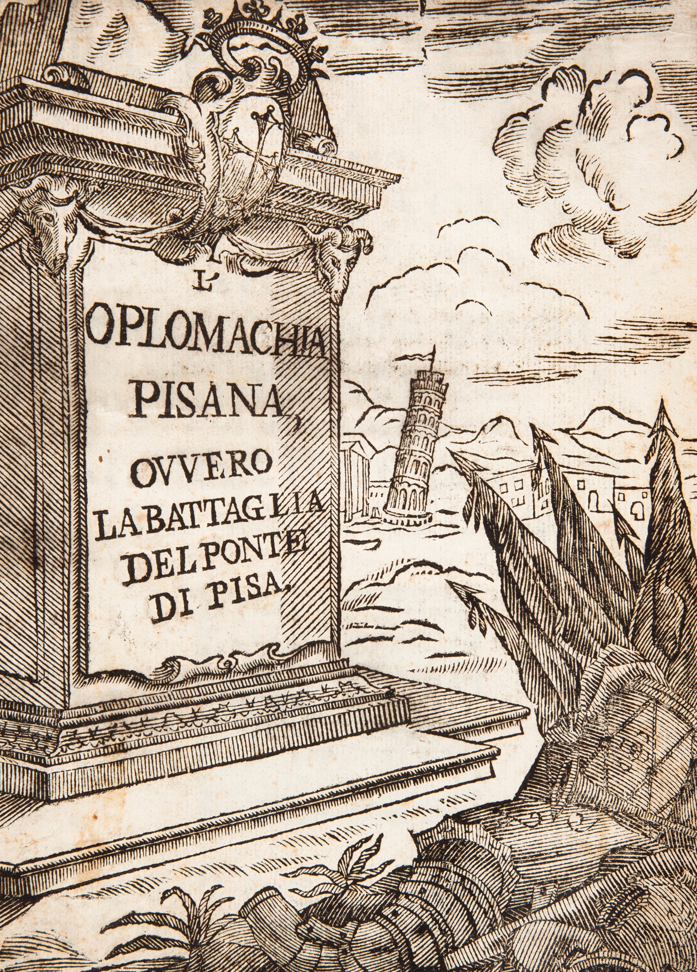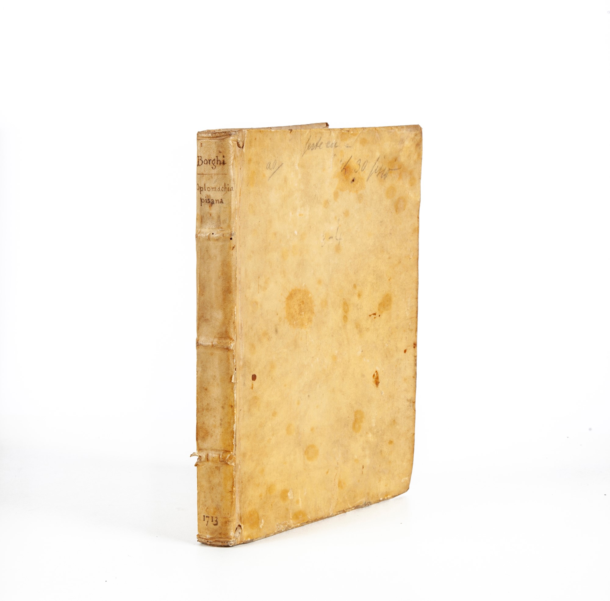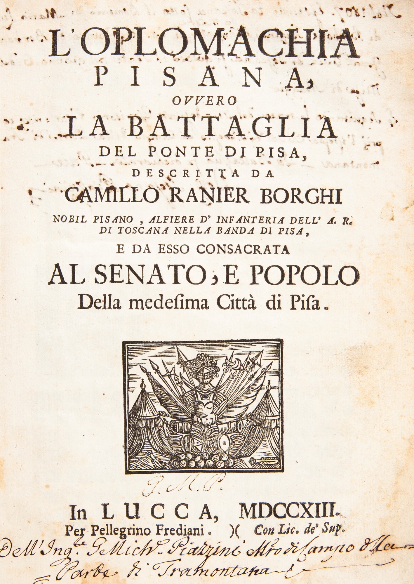 Camillo Ranieri Borghi - L'Oplomachia Pisana ovvero La Battaglia del Ponte di Pisa In 8° grande Prima edizione assai rara di quest'opera distinta in 35 quesiti, il primo dei quali è Quale sia l'origine del giuoco del Ponte. Intorno ad essa egli riporta sette opinioni diverse, alcuna delle quali ha del favoloso. Per compimento di quest'opera nel suo genere curiosa si dà una esatta descrizione delle due celebri battaglie l'una al 26 Aprile 1589 per la venuta in città di Cristina di Lorena e l'altra fatta in Firenze dai medesimi Pisani sul Ponte a Santa Trinita il 28 Ottobre 1608. Illustrata con 4 tavole incise a piena pagina fuori testo che illustrano le armature dei contendenti, il ponte e l'assetto strategico dei partecipanti alla battaglia. Legatura coeva in piena pergamena con titolo manoscritto al dorso. Pellegrino Frediani, Lucca 1713 20,5x15,5