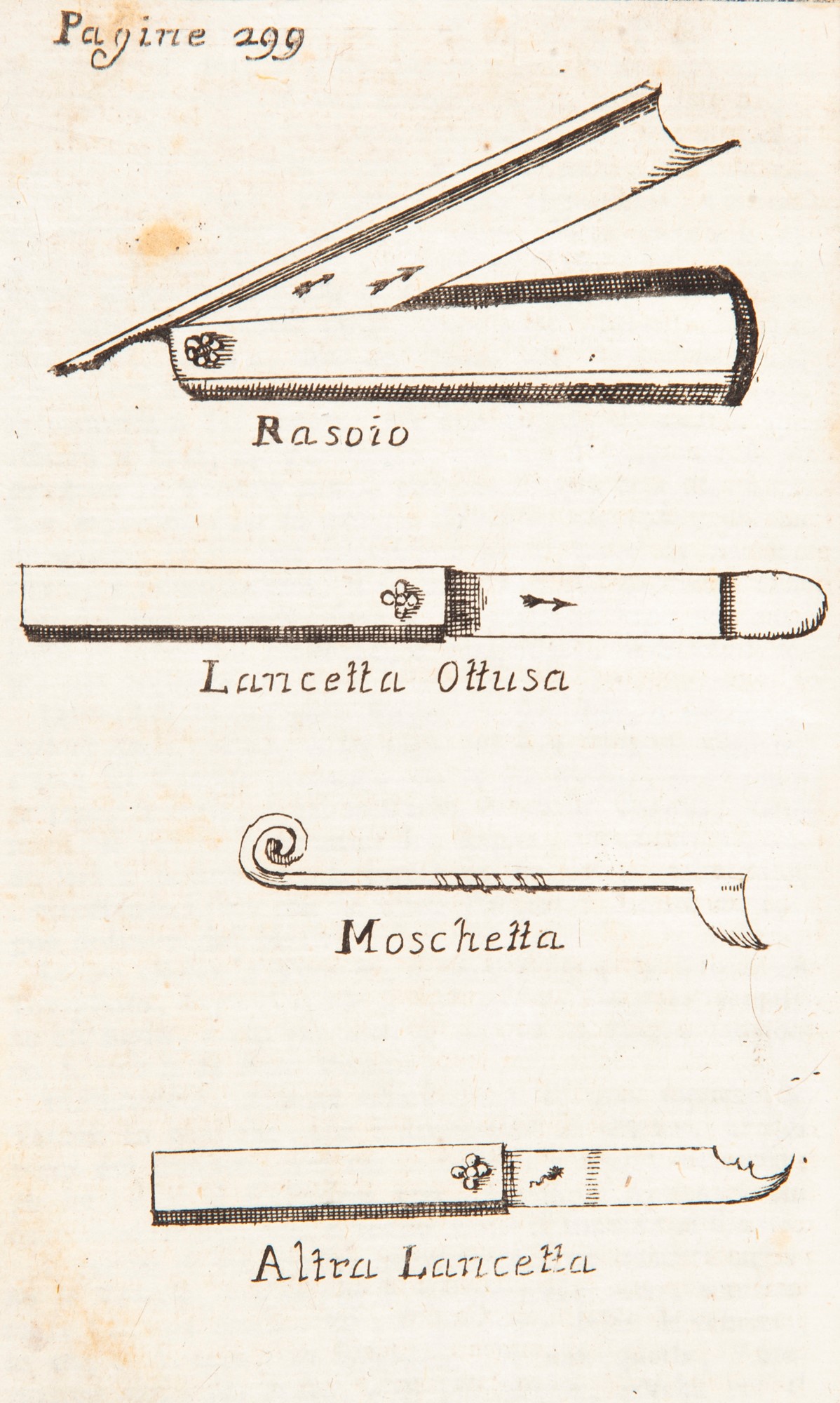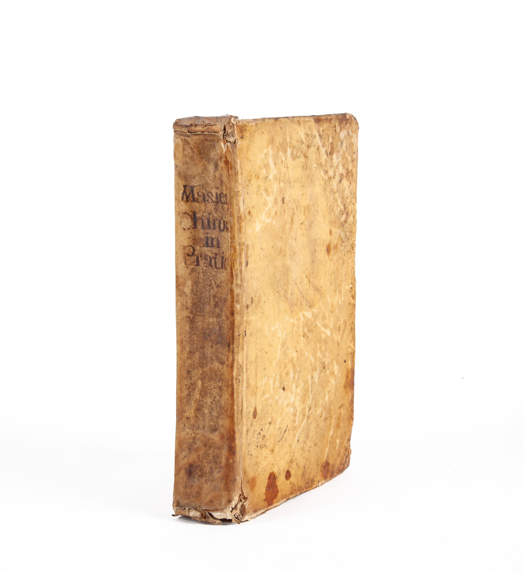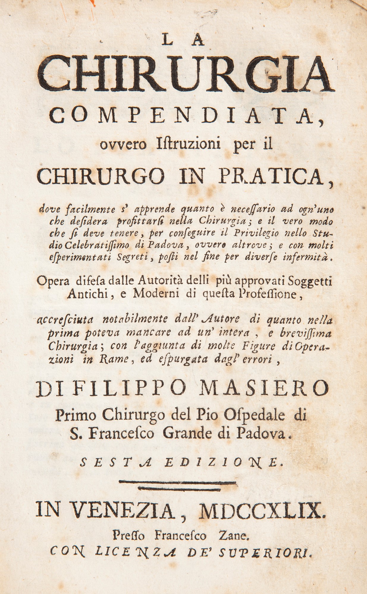 Filippo Masiero - La chirurgia compendiata, ovvero Istruzioni per il chirurgo in pratica Sesta edizione In 8°. Edizione sesta di quest'opera del medico padovano primo Chirurgo del Pio Ospitale di San Francesco Grande di Padova. Presenti numerose illustrazioni xilografiche a piena pagina che raffigurano parti anatomiche e strumenti chirurgici, tecniche pratiche per mettere dei punti di sutura, curare amputazioni, ernie, fratture. La chirurgia nasce come lavoro manuale, esercitata dal medico ippocratico e poi, a partire dal Medioevo, dal barbiere in bottega o dal cerusico sui campi di battaglia. Appresa non attraverso i libri ma per imitazione e ripetizione dei gesti, la chirurgia è via via cresciuta da quando l'esercitazione anatomica ha creato le premesse scientifiche per una operazione efficace sul corpo dei vivi. A partire dal Sei e nel Settecento numerose opere di divulgazione, tra cui questa, hanno consentito di istruire i chirurghi alla pratica della professione. Legatura in piena pergamena coeva con titolo manoscritto al dorso. Gore d'acqua e bruniture che ledono solo marginalmente il testo. Francesco Zane, Venezia 1749 cm 18x11,3