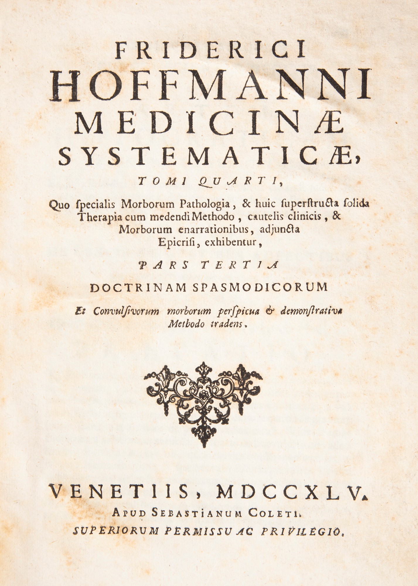 Friderici Hoffmanni Opera Omnia physico-medica denuo revisa, correcta & aucta. Editio Veneta, lugdunensi postrema emendatior & auctior In 4°. Parte I, II, III, IV.I, IV.II, IV.III, IV.IV. Legate in quattro volumi. Edizione italiana completa stampata a Venezia della monumentale opera di medicina del medico palatino Hoffmann. Legature in piena pergamena rigida coeva con titoli e fregi in oro al dorso. Sebastiano Coleti, Venezia 1738-45 cm 24x18
