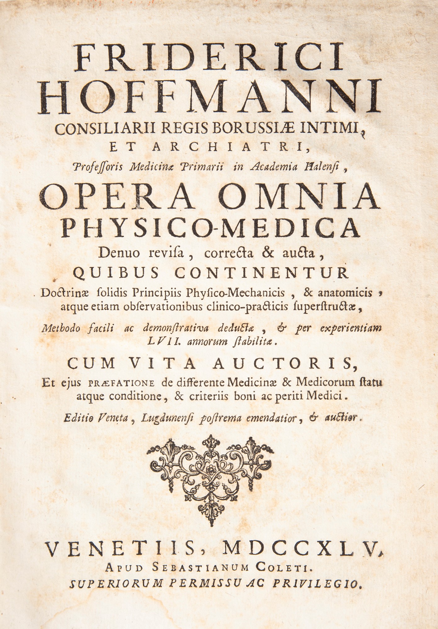 Friderici Hoffmanni Opera Omnia physico-medica denuo revisa, correcta & aucta. Editio Veneta, lugdunensi postrema emendatior & auctior