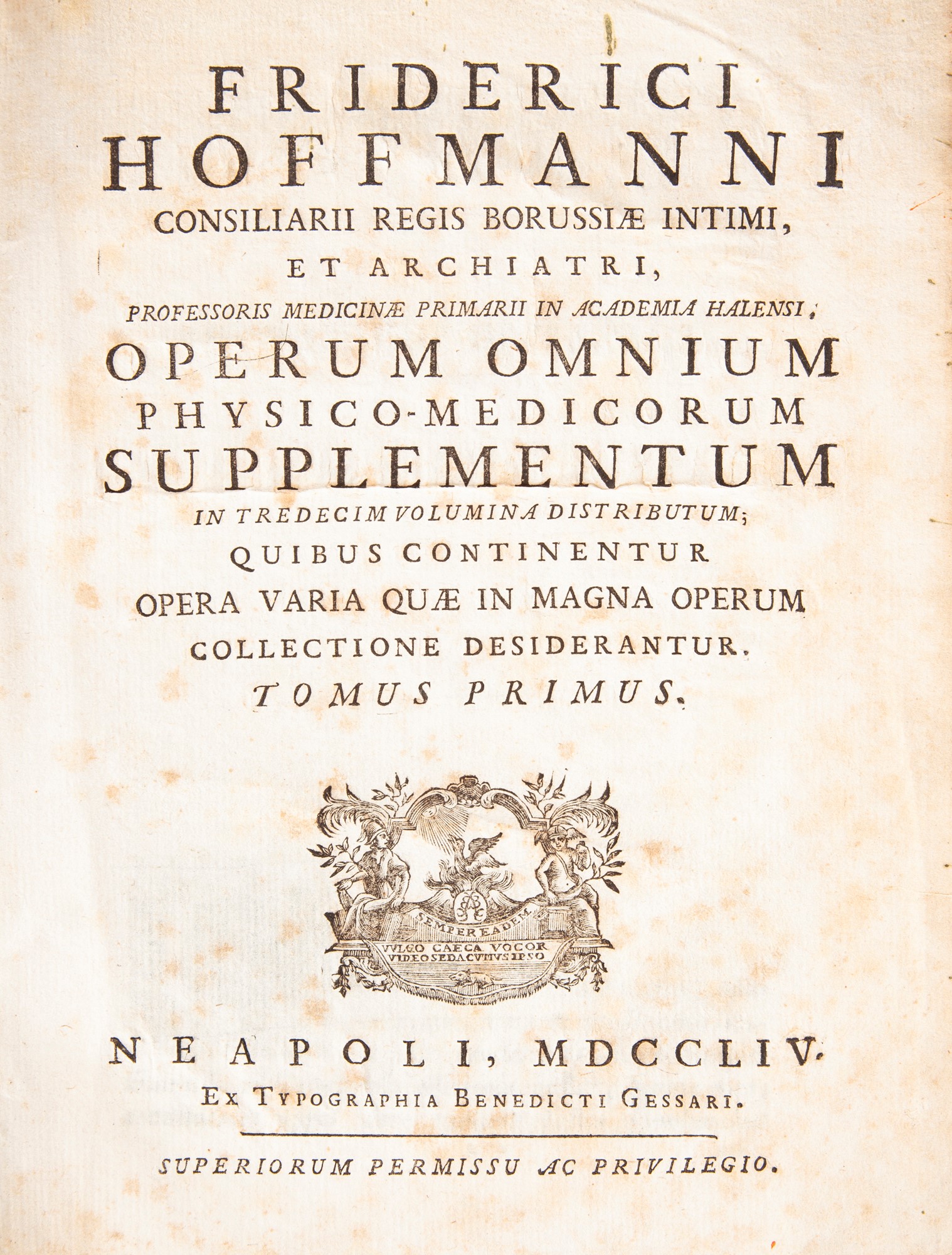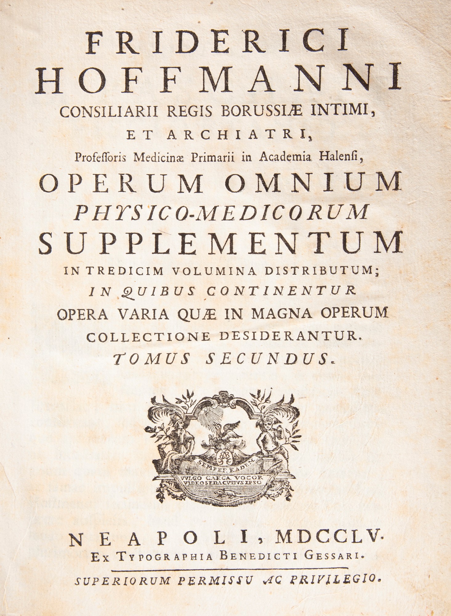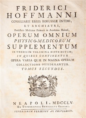 Friderici Hoffmanni - Operum omnium Physico-Medicorum Supplementum. Tomus primus Tomus secundus In 4°. 2 Volumi del Supplemento dell'edizione napoletana della monumentale opera di medicina del medico palatino Hoffmann. Legature in piena pergamena coeva con titoli entro fregi al dorso. Benedetto Gessari, Napoli 1754-55 cm 24x18