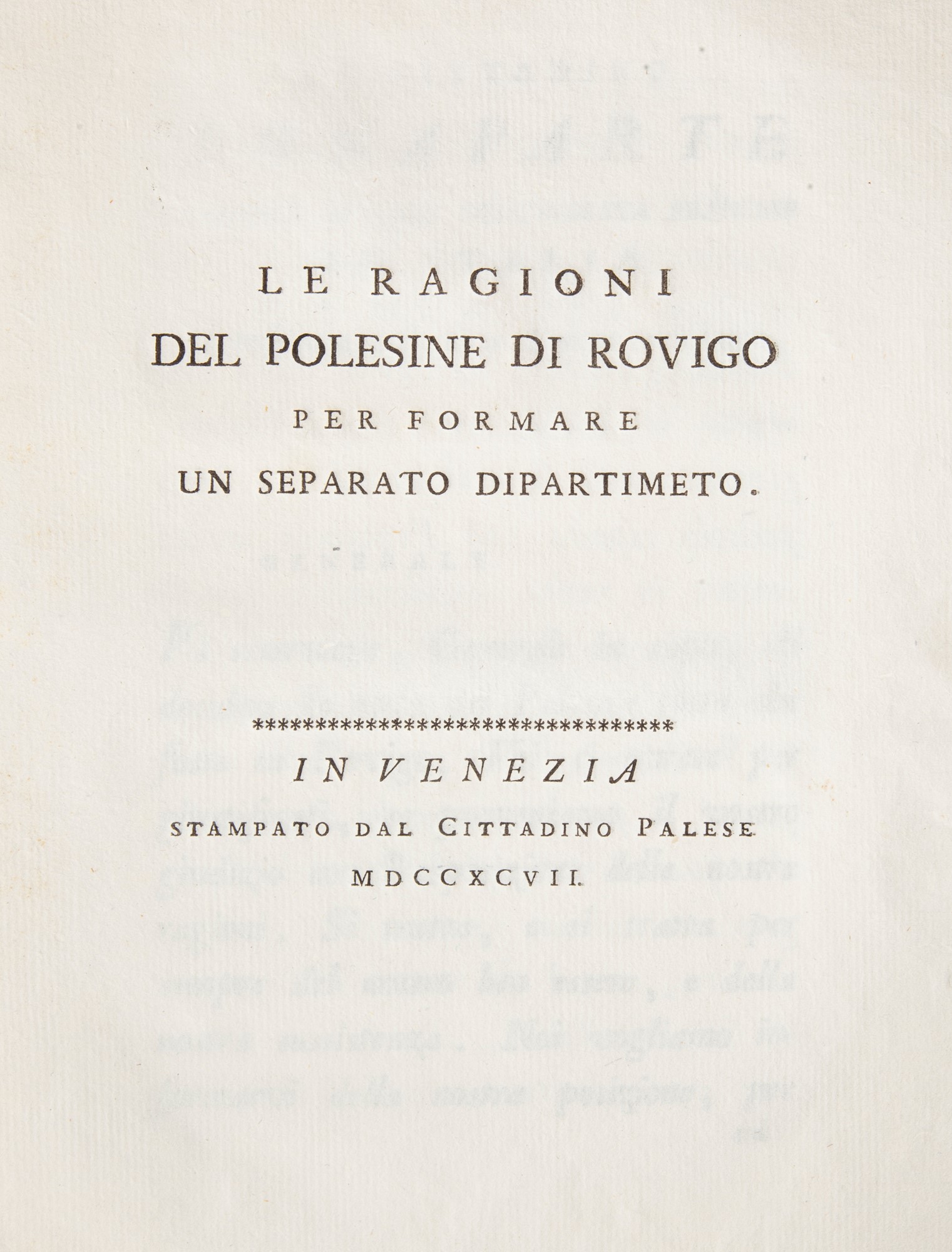 Le ragioni del Polesine di Rovigo per formare un separato dipartimento Interessante trattato dedicato a Napoleone Bonaparte, nel quale a seguito della caduta della Repubblica di Venezia vengono rivendicate le ragioni e richieste di separazione (storicamente ampiamente documentate) del Polesine dal Padovano e la creazione di un Dipartimento. Legatura coeva in carta marmorizzata. Slegato. Cittadino Palese, Venezia 1797 cm 29x21