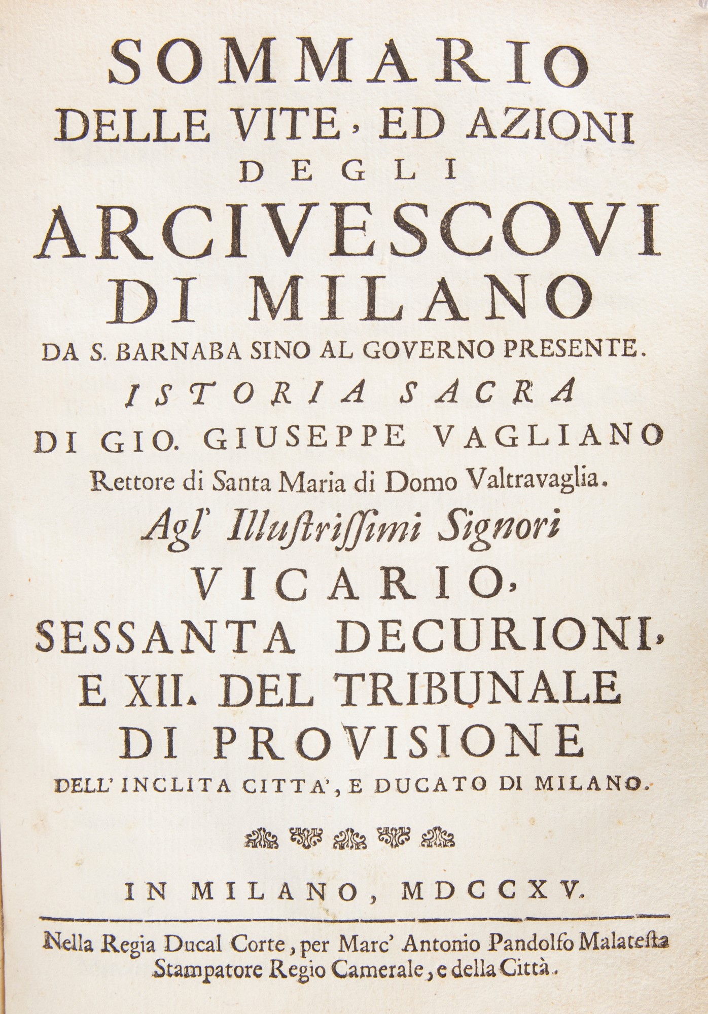 Giovanni Giuseppe Vagliano - Sommario delle Vite, ed Azioni degli Arcivescovi di Milano da S. Barnaba sino al governo presente. Istoria sacra