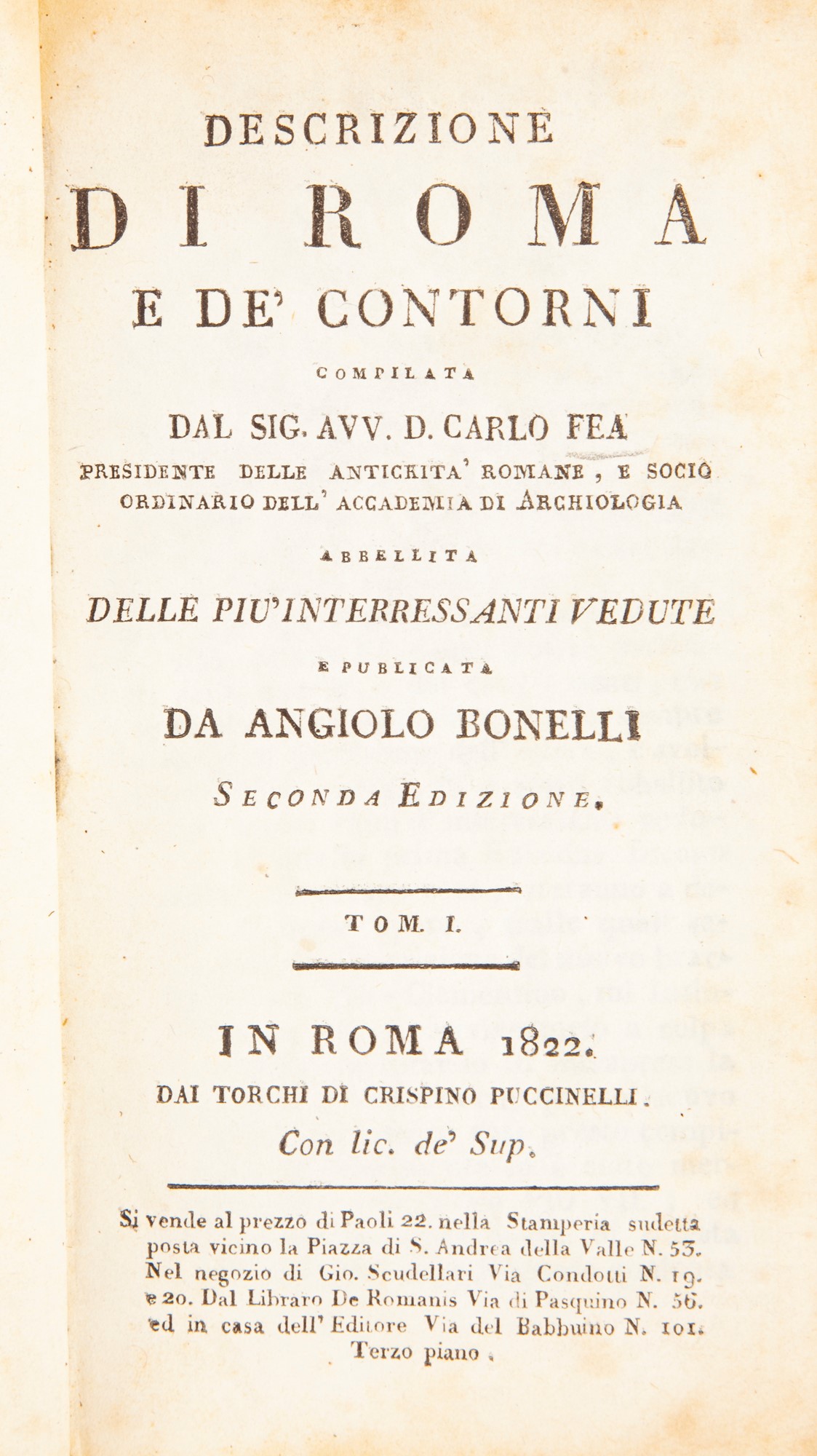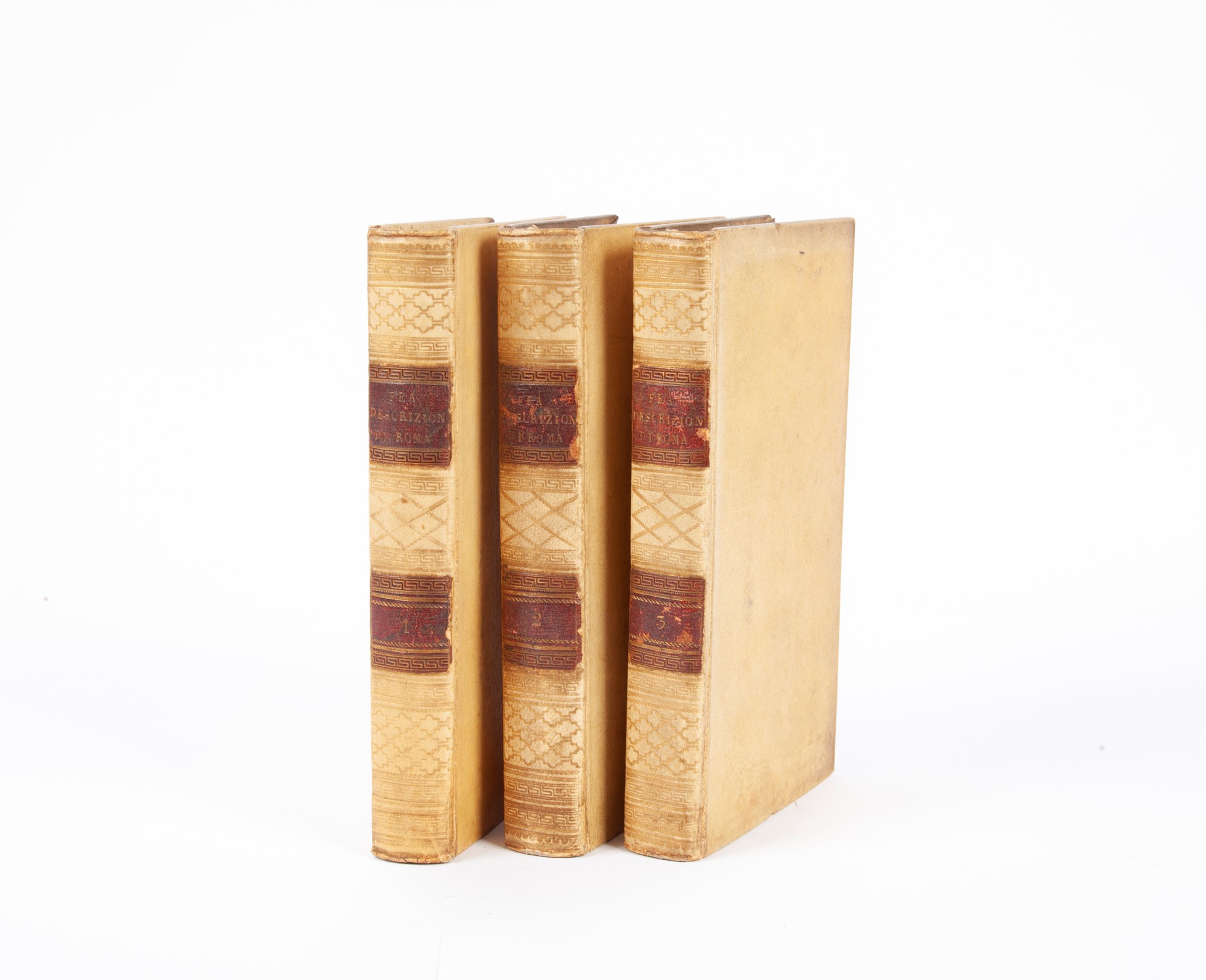 Carlo Fea - Descrizione di Roma e de' contorni Abbellita delle più interessanti vedute e pubblicata da Angiolo Bonelli Seconda edizione Tomi I-II-III (Illustrato del XIX secolo) In 16° Celebre guida di Roma e dintorni a cura dell'archeologo Carlo Fea (Pigna 1753 - Roma 1836). La prima edizione apparve nel 1819, questa seconda edizione fu pubblicata dal banchiere Angiolo Bonelli. Il primo volume è illustrato con 5 tavole incise in rame e una mappa piegata più volte di Roma del 1821 dedicata da Bonelli alla duchessa di Devonshire. Il secondo volume è illustrato con 24 tavole (23 di monumenti a piena pagina e una pianta di Roma antica ripiegata in fine), il terzo ha solo 14 tavole su 15 (manca il Ponte Lucano). Legature coeve in piena pergamena con titoli su tasselli in pelle e fregi in oro ai dorsi. Crispino Puccinelli, Roma 1822 cm 19x11