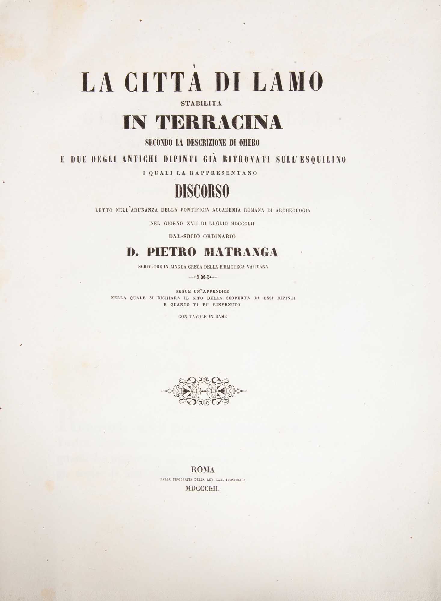 Pietro Matranga - La città di Lamo stabilita in Terracina. Secondo la descrizione di Omero e due degli antichi dipinti già ritrovati sull'Esquilino i quali la rappresentano. Discorso. Segue un'Appendice nella quale si dichiara il sito della scoperta di essi dipinti e quanto vi fu rinvenuto. Con tavole in rame 11 Tavole doppie fuori testo disegnate da GIACONIA e COTTAFAVI, incise da Francesco MOCHETTI; tra le quali 2 vedute con il Pisco Montano, il monte Liano di Terracina; una bella veduta della Porta di Teodorico scoperta nel 1852 nel giardino Venditti, dell'Ing. MOLLARI incisa dal CICCONETTI; le altre tavole con dettagli di reperti e scavi in via Graziosa e di alcune lapidi di Terracina. Legatura in brossura di un altro volume. Intonso. Tipografia Rev. Camera Apostolica, Roma 1852 cm 33x25