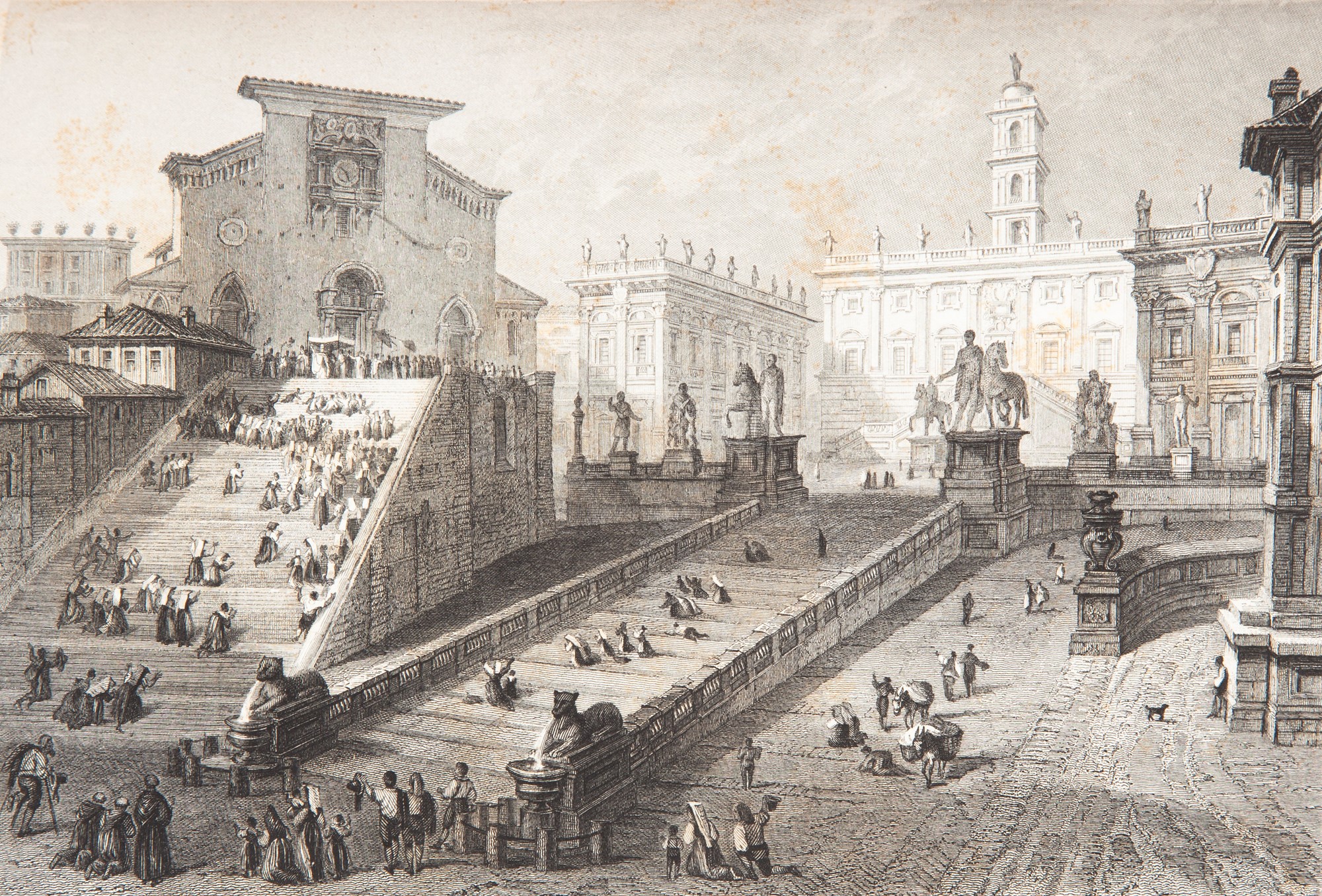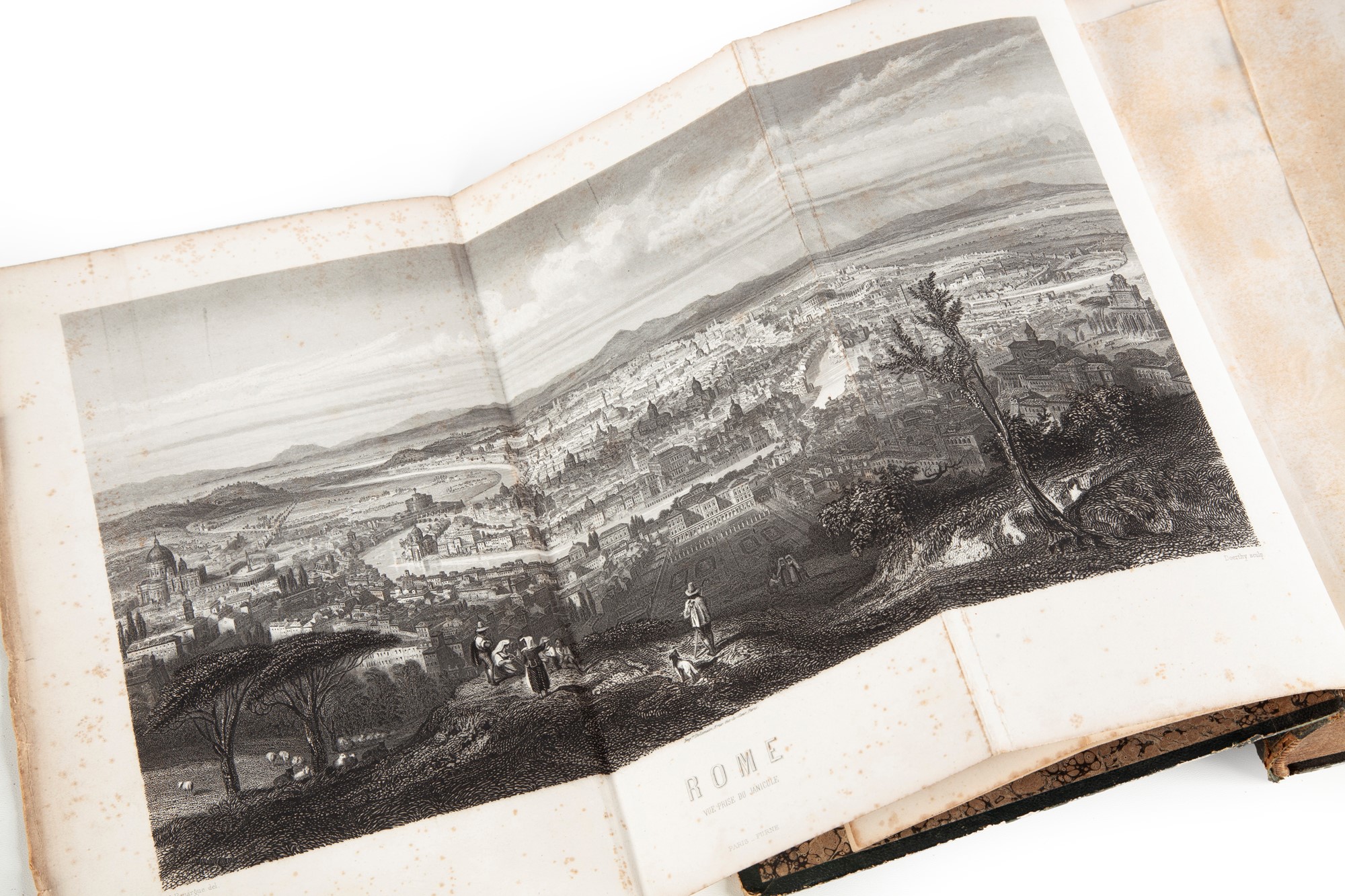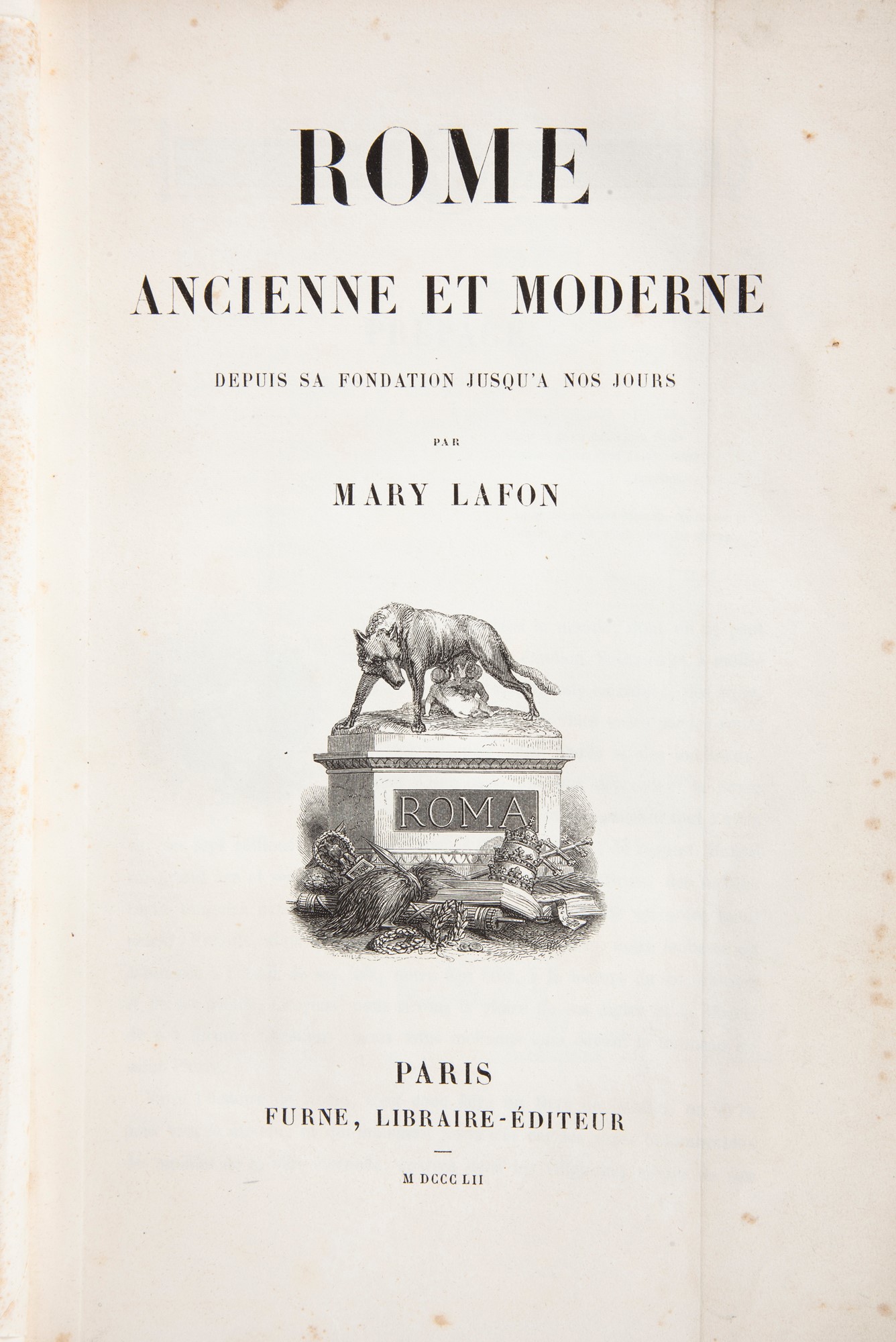 Mary Lafon - Rome Ancienne et Moderne Depuis sa fondation jusqu'a nos Jours In 4° Con 26 tavole finemente incise su acciaio di cui 2 ripiegate (Roma vista dal Gianicolo e la Pianta della città). Prima edizione. Opera di grande interesse con un apparato iconografico davvero rilevante. Legatura editoriale in percalina verde con 4 nervi e titolo e fregi in oro al dorso. Furne, Parigi 1852 cm 27,5x19