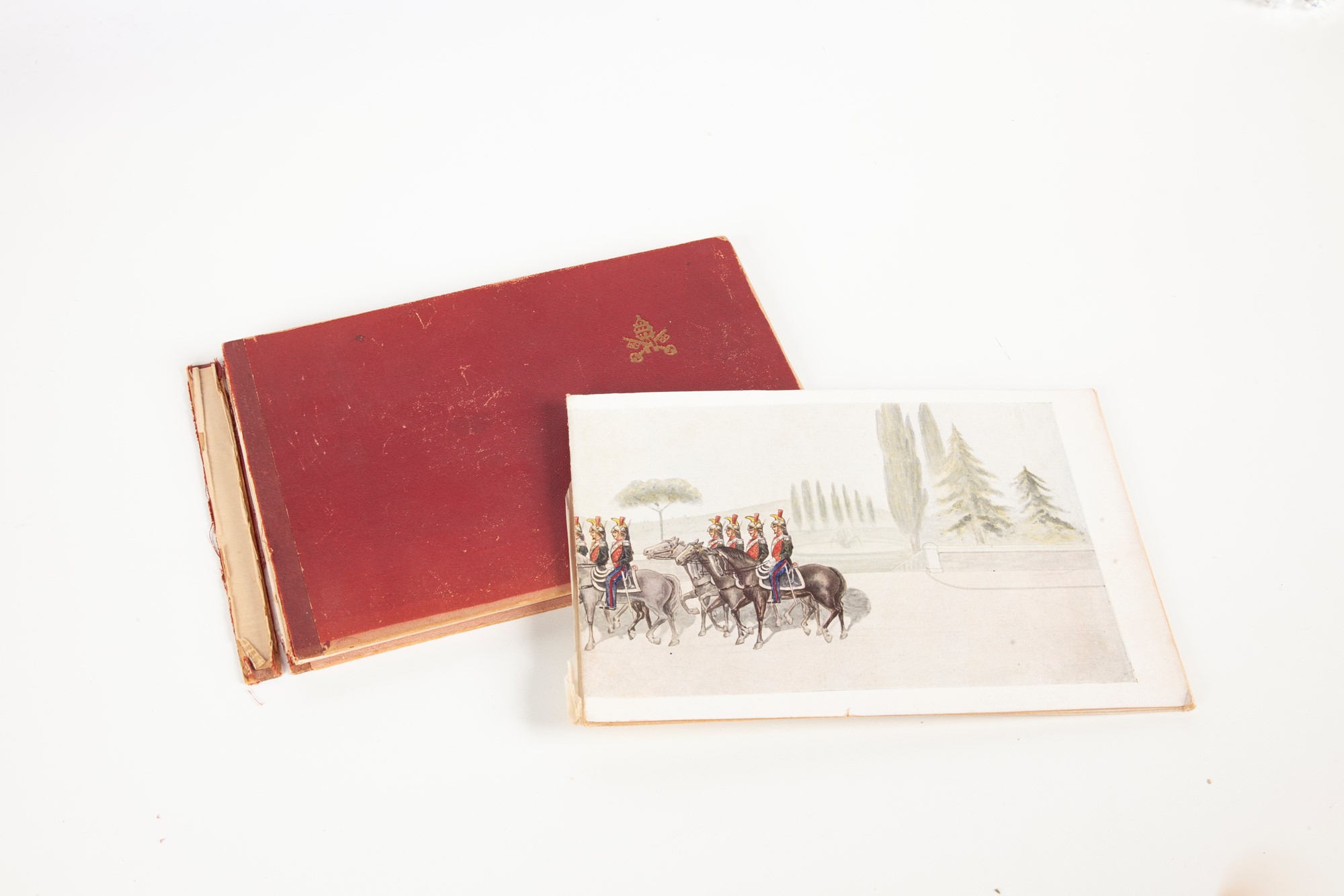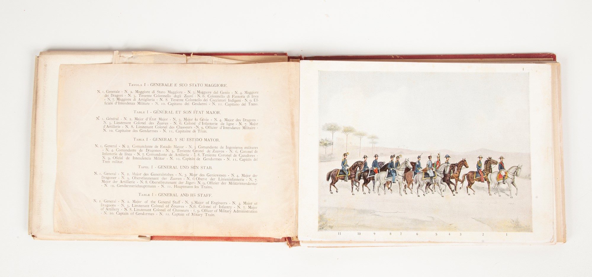 Album con XX tavole a piena pagina all'acquaforte a più colori raffiguranti l'Esercito pontificio, più un tavola ripiegata più volte raffigurante il corteo di papa Pio IX Album originale in mezza tela e percallina rossa con stemma pontificio in oro. Rottura del dorso. Le tavole sono accompagnate da veline esplicative delle raffigurazioni in 5 lingue (italiano, francese, spagnolo, tedesco ed inglese). 1846-1878 cm 19x25 Formato oblungo