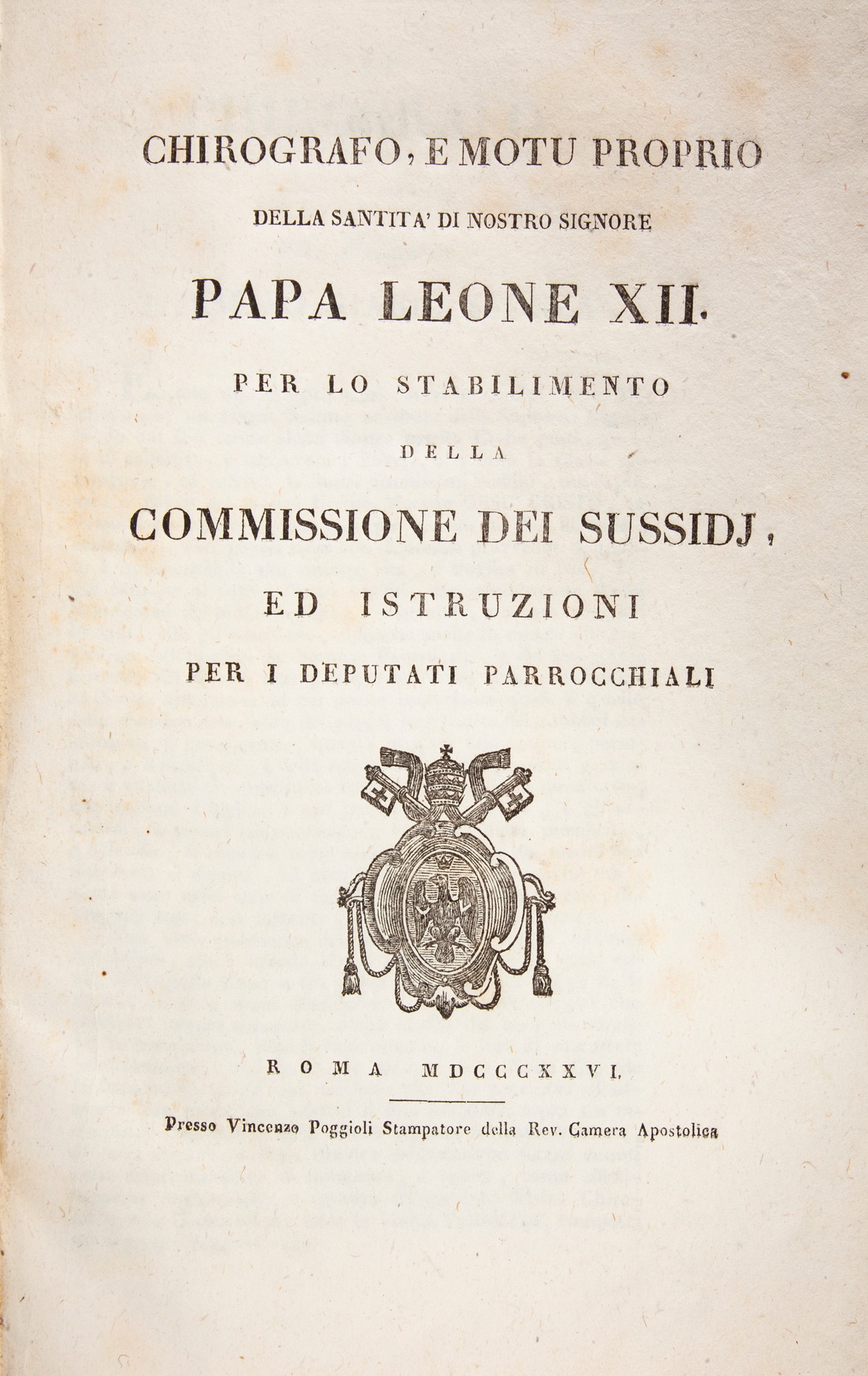 Chirografo e motu proprio della Santità di Nostro Signore papa Leone XII per lo stabilimento della commissione dei sussidj ed istruzioni per i deputati parrocchiali In folio. Legatura in cartonato coevo Vincenzo Poggioli, Roma 1826 cm 35x22