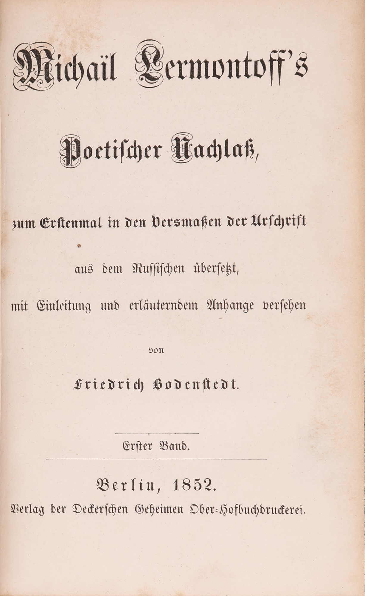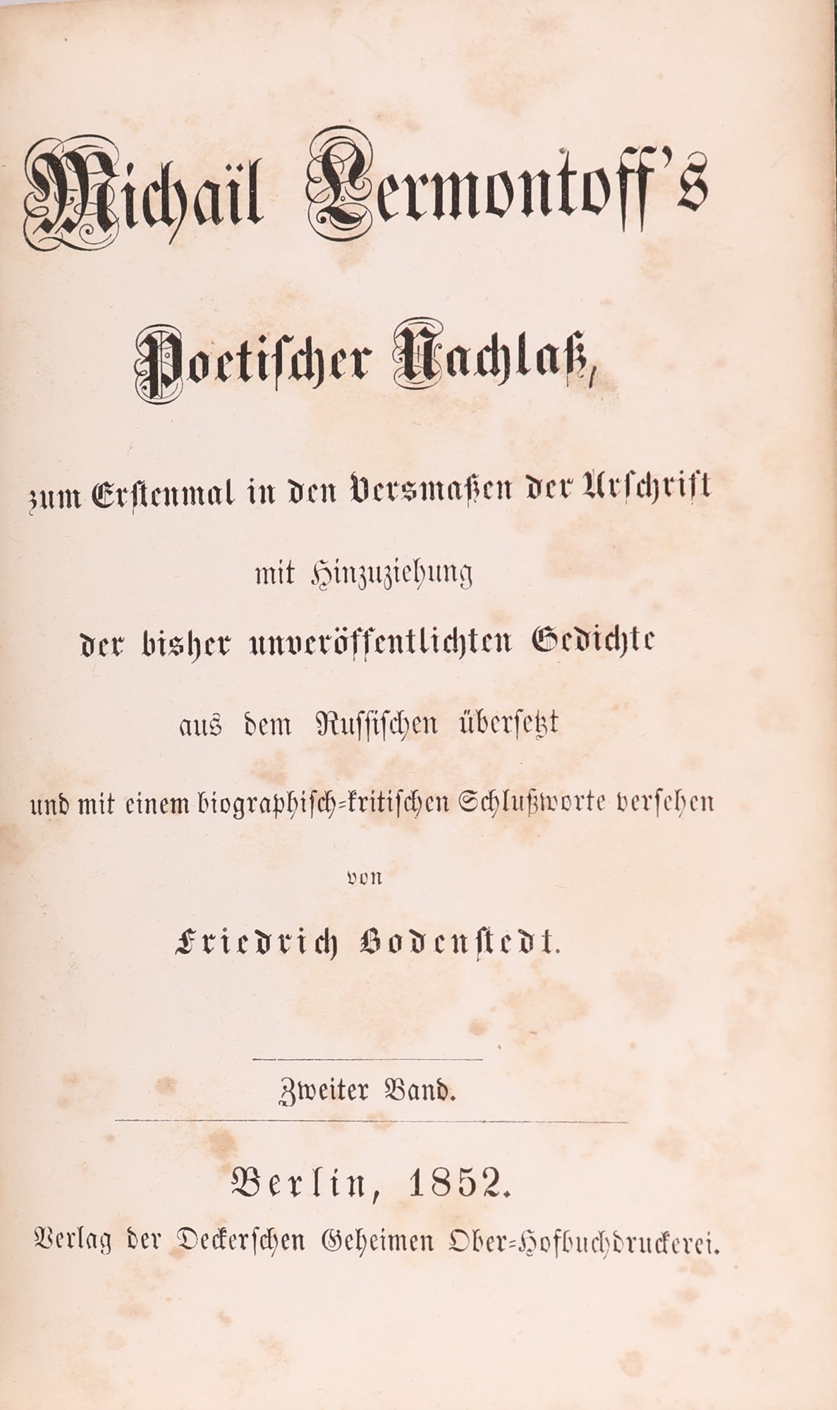 Mikhail Iurevich Lermontov. Poetischer Nachlass In 12°. Due volumi. Opera poetica di una delle figure di spicco del Romanticismo e tra i maggiori scrittori del XIX secolo, contenente la Prima edizione della più famosa delle poesie di Lermontov "La morte del poeta" qui pubblicata col titolo "Lamento sulla tomba di Alexander Pushkin". Considerate sediziose le sue poesie portarono all'arresto del poeta, che venne esiliato. Edizione tedesca curata da F. M. Von Bodenstedt. Bella legatura editoriale in percallina verde con fregi dorati ai piatti, titoli e fregi ai dorsi, tagli dorati. Verlag der Deckerschen, Berlino 1852 cm 14,8x10