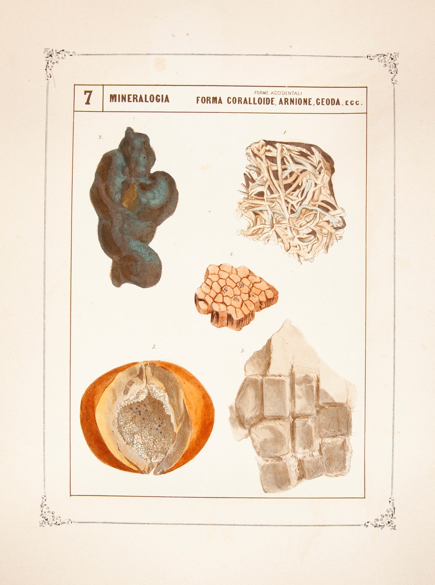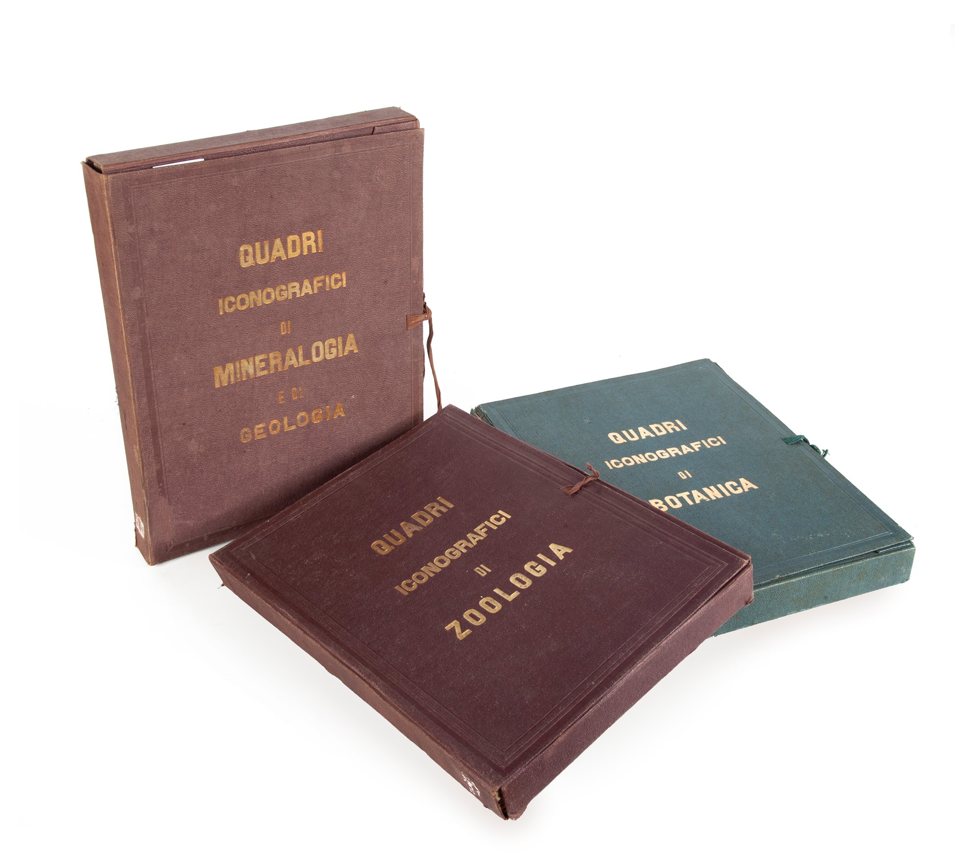 3 libri illustrati con tavole del XIX secolo: Luigi Bellardi - Quadri iconografici di Zoologia, Paravia Torino-Milano 1863; - Quadri iconografici di Botanica, Paravia Torino-Milano 1863; - Quadri iconografici di Mineralogia e di Geologia, Paravia Firenze-Torino-Milano 1868 Con centinaia di tavole a colori. Entro contenitori coevi in tela con titoli in oro al piatto, leggermente sciupati. cm 36,5x28