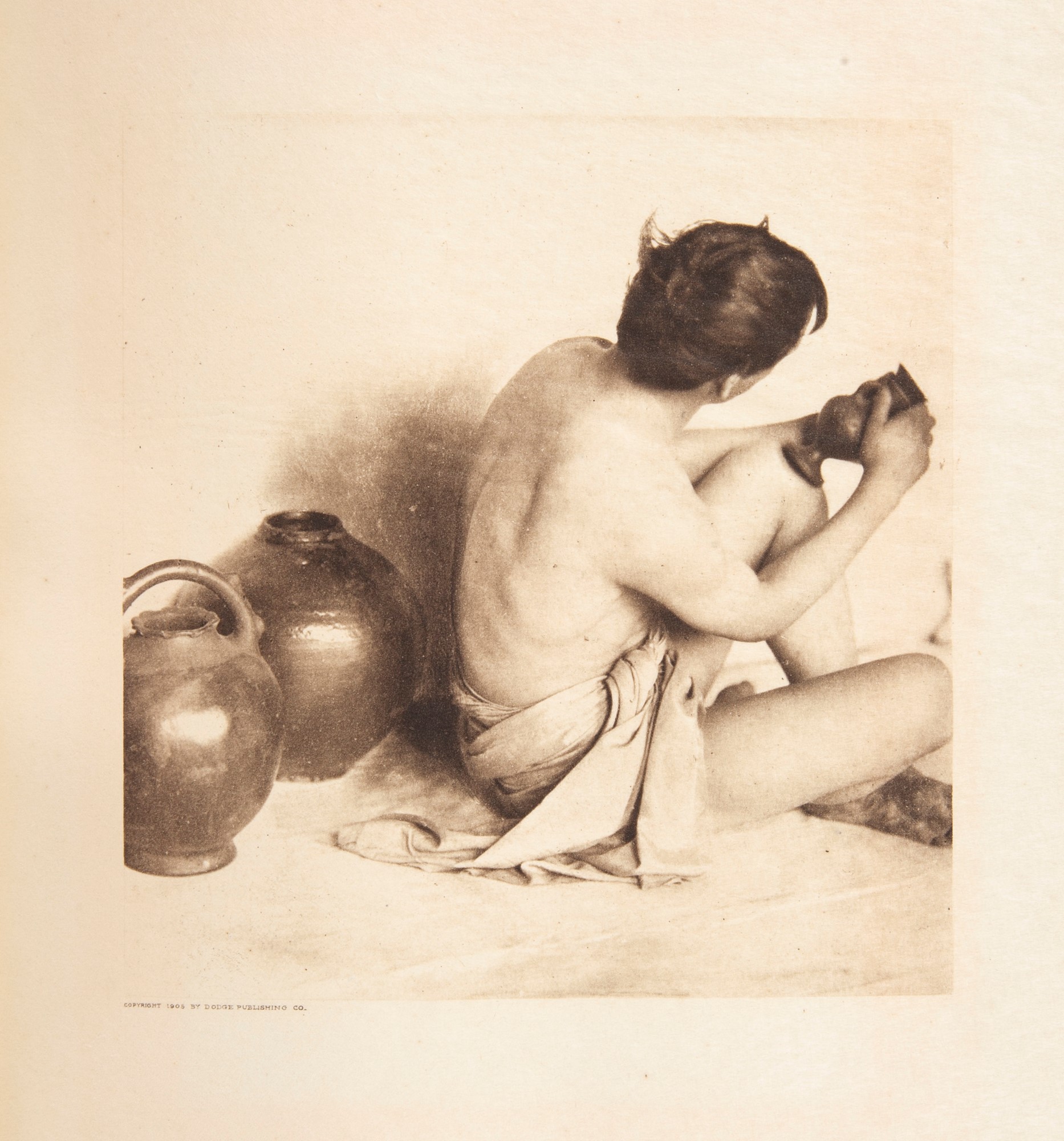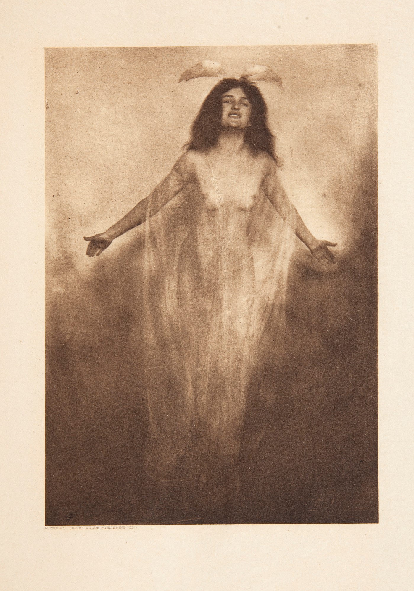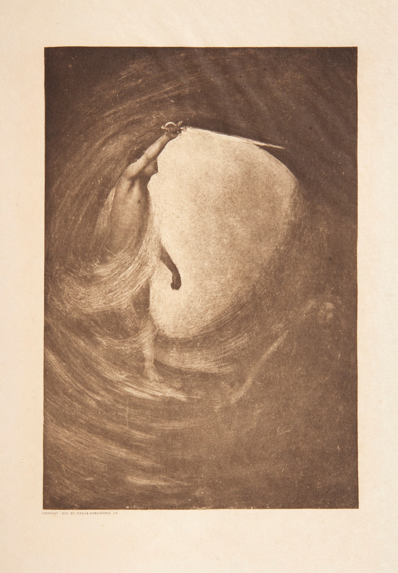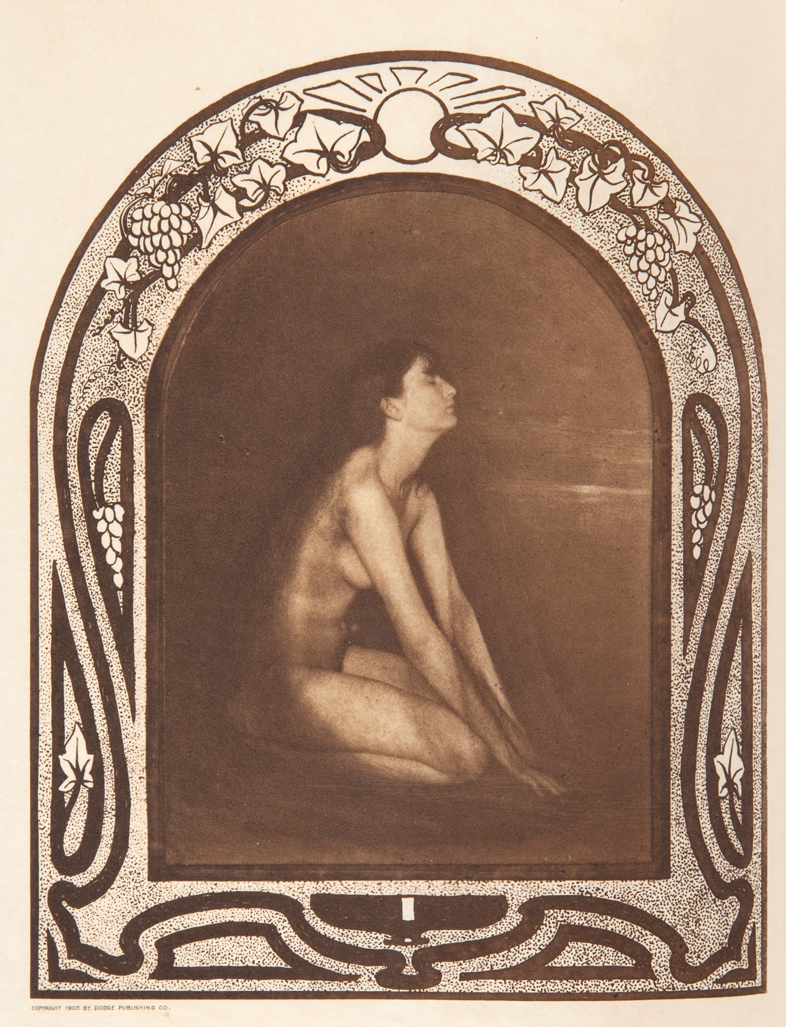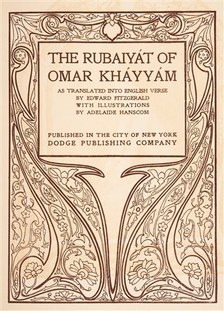 The Rubaiyat of Omar Khayyam As translated into english verse by Edward Fitzgerald with illustrations by Adelaide Hanscom In 4° piccolo. Senza impaginazione. Prima edizione che presenta le rivoluzionarie illustrazioni fotografiche della fotografa pittorialista californiana Adelaide Hanscom: 28 fotoincisioni color seppia stampate direttamente su carta velina. Le illustrazioni delle edizioni successive sono attribuite anche a Blanche Cumming. Opera il cui titolo venne dato da Edward Fitzgerald alla sua traduzione dal persiano all'inglese del 1859 di una selezione di quartine (rubāʿiyāt) attribuite a Omar Khayyam (1048–1131), soprannominato "l'astronomo-poeta della Persia". All'inizio non ebbe un gran successo commerciale, ma il lavoro di Fitzgerald venne reso popolare dal 1861 in poi da Whitley Stokes, al punto da essere molto ammirato dai preraffaelliti in Inghilterra. Il libro divenne estremamente popolare in tutto il mondo anglofono al punto che si formarono numerosi "club Omar Khayyam" e si creò un vero e proprio culto di fin de siècle. Legatura coeva in mezza pelle con angoli in pelle e con titoli e fregi in oro al dorso. In parte ancora intonso. Dodge Publishing Company, New York 1905 cm 26x20,5