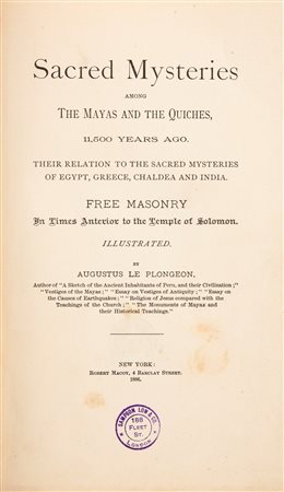 Lot 339 | Augustus Le Plongeon - Sacred Mysteries among the Mayas and the Quiches 11,500 Years Ago Their Relation to the Sacred Mysteries of Egypt, Greece, Chaldea and India Free Masonry