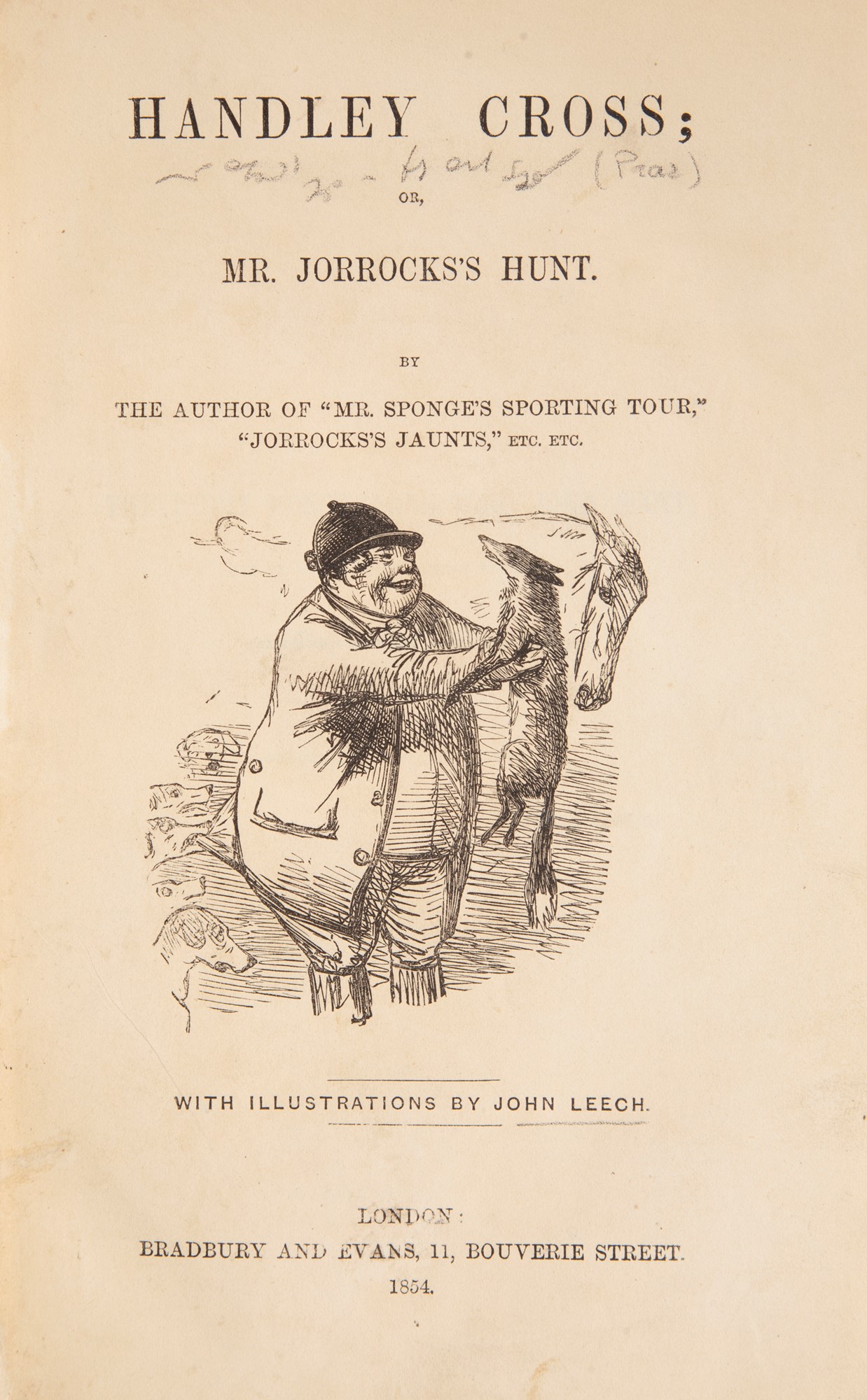 [Robert Smith Surtees] - Handley Cross or Mr. Jorrocks's Hunt. By the author of "Mr. Sponge's sporting tour", "Ask Mamma" etc. With illustrations by John Leech.