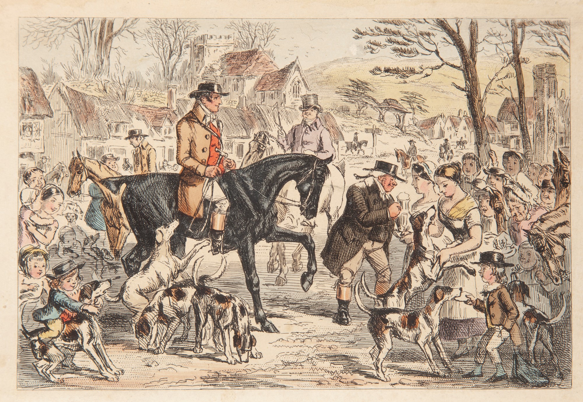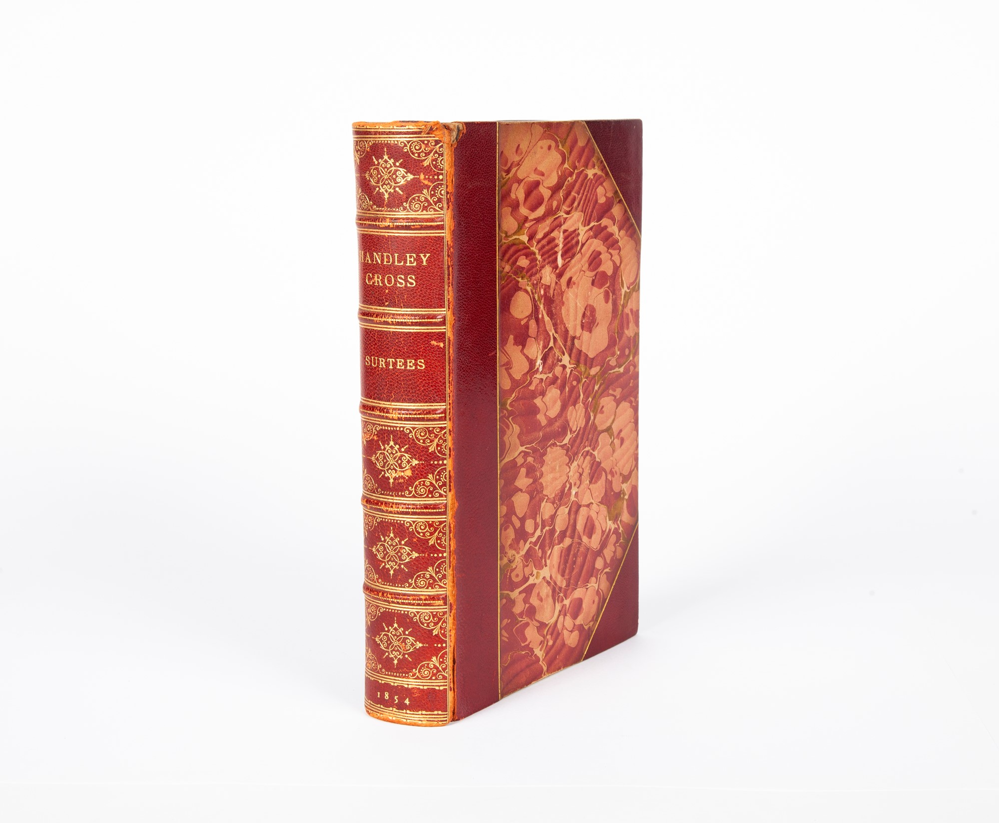 [Robert Smith Surtees] - Handley Cross or Mr. Jorrocks's Hunt. By the author of "Mr. Sponge's sporting tour", "Ask Mamma" etc. With illustrations by John Leech. In 8°. Splendida edizione illustrata con 17 tavole a piena pagina colorate a mano e numerose incisioni nel testo di John Leech, di una celebre opera del romanziere e scrittore sportivo inglese che tratta in modo satirico della caccia alla volpe. Legatura mezza pelle coeva, con titoli e fregi dorati al dorso. Taglio dorato. Bradbury and Evans, Londra, 1854 cm 22,5x15