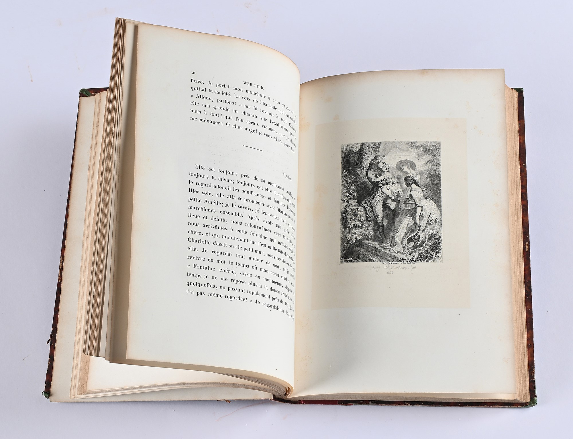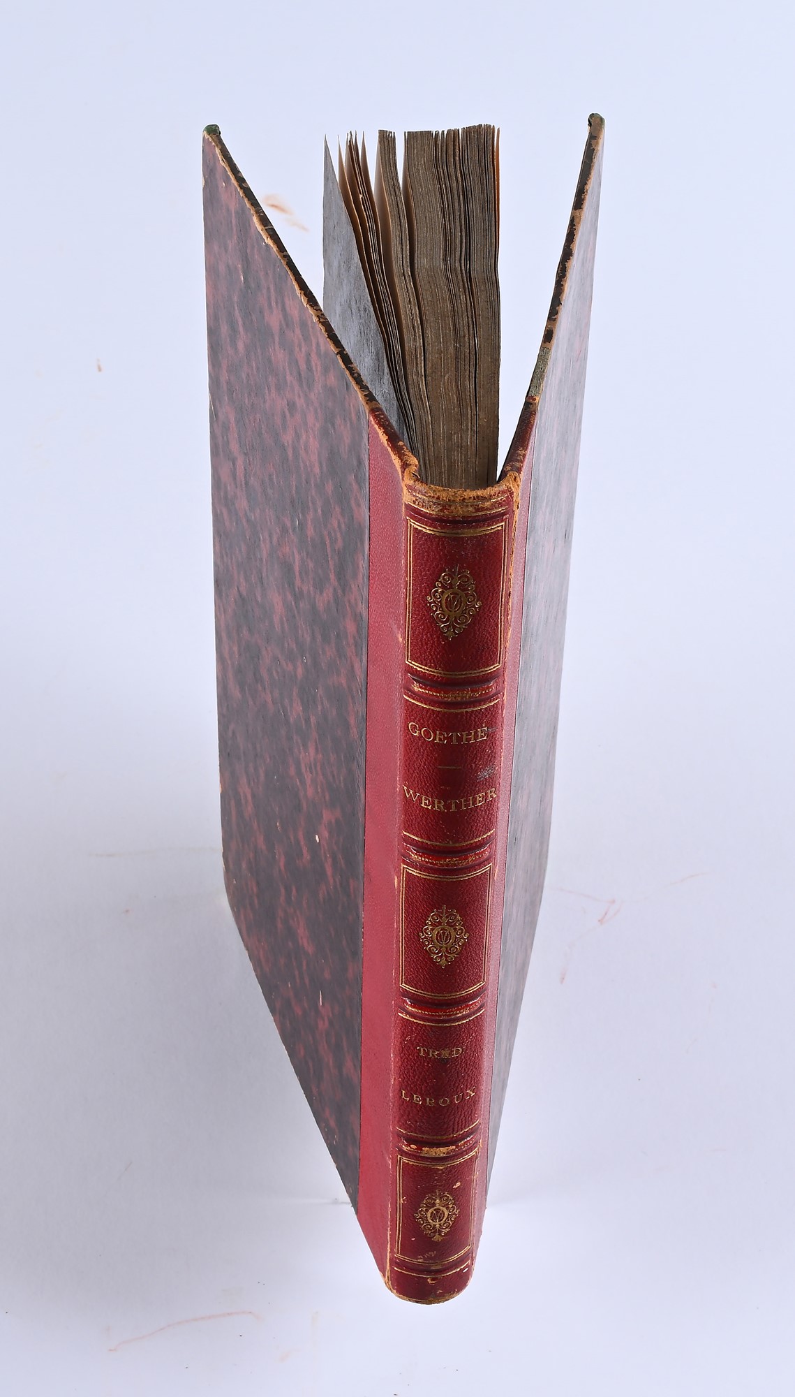 In 4°. Traduzione in francese illustrata con dieci acquaforti di Jeannot del capolavoro dello Sturm und Drang. Legatura in mezza pelle a 4 nervi con titoli e fregi in oro al dorso. Prime pagine con antiporta slegate.