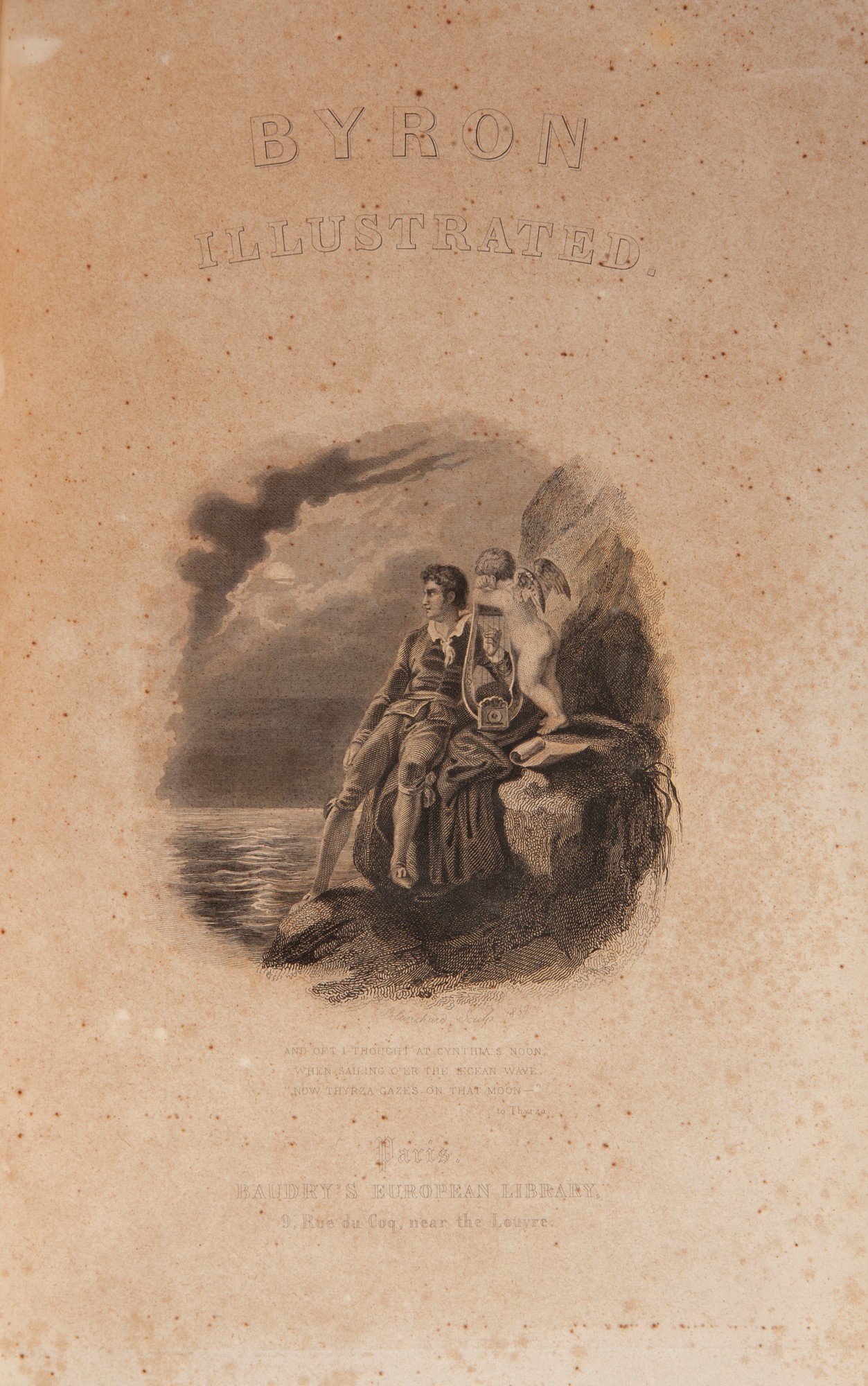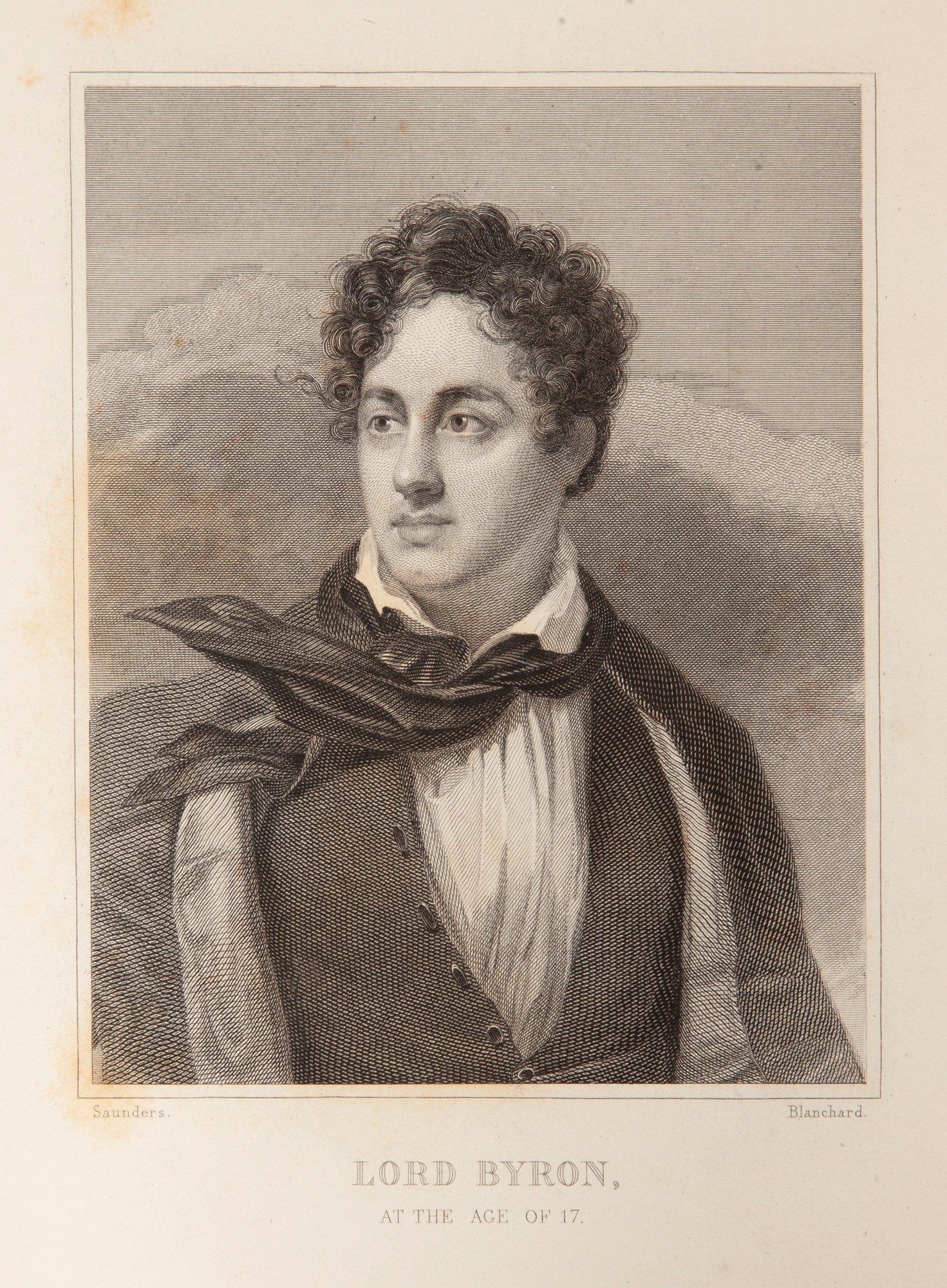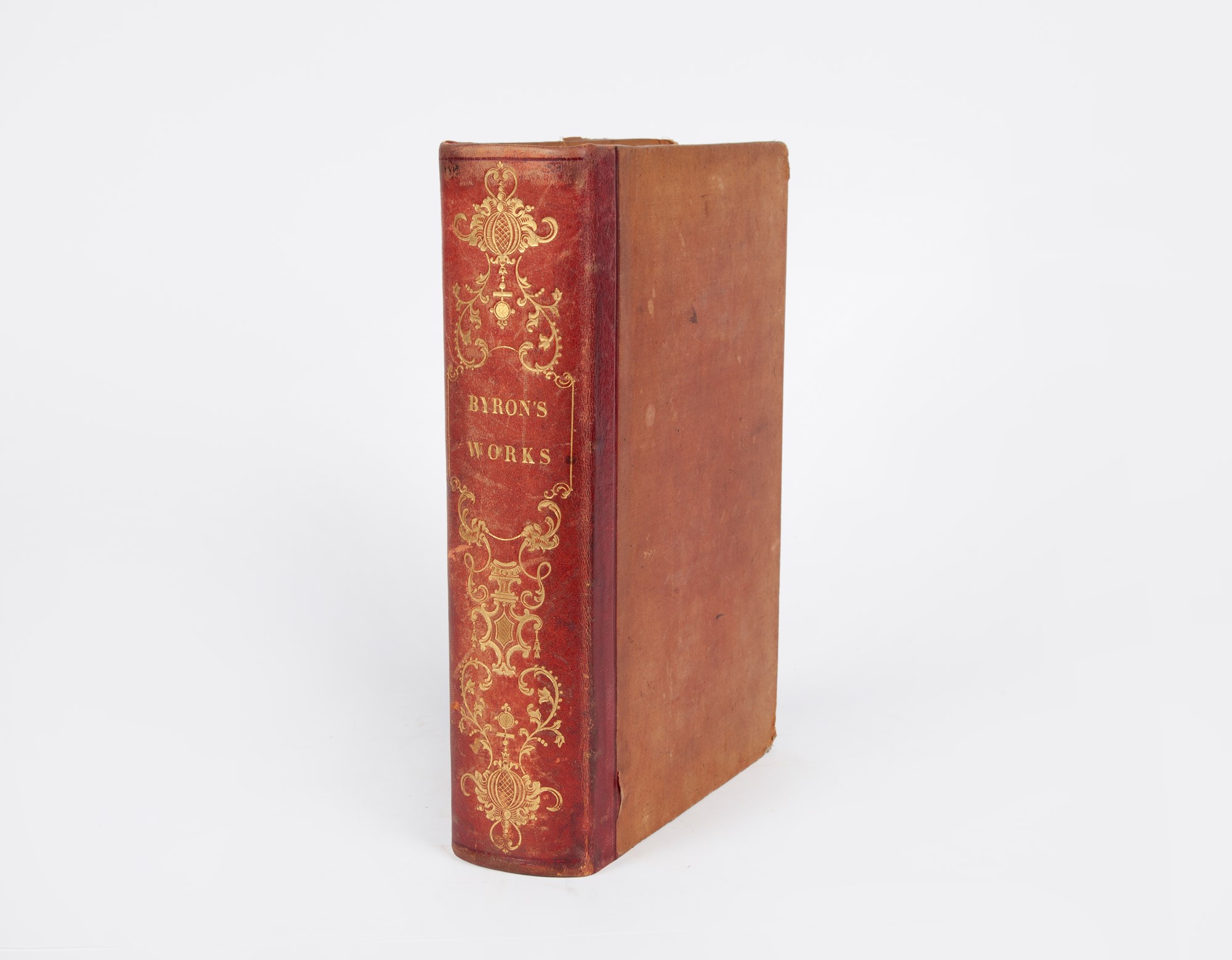 Lord Byron - The complete Works. From the Last London Edition, Collected and Arranged, and Illustrated with All the Notes by John Gast, Esq. in One Volume In 4° Illustrato con una tavola in antiporta con il ritratto inciso di Byron e 2 tavole fuori testo, oltre a riproduzioni di facsimili di scrittura. Contiene le opere di Byron precedute dalla sua vita scritta da John Galt. Legatura coeva in mezza pelle con titolo e fregi in oro al dorso. Baudry, Parigi 1837 cm 27,5x18