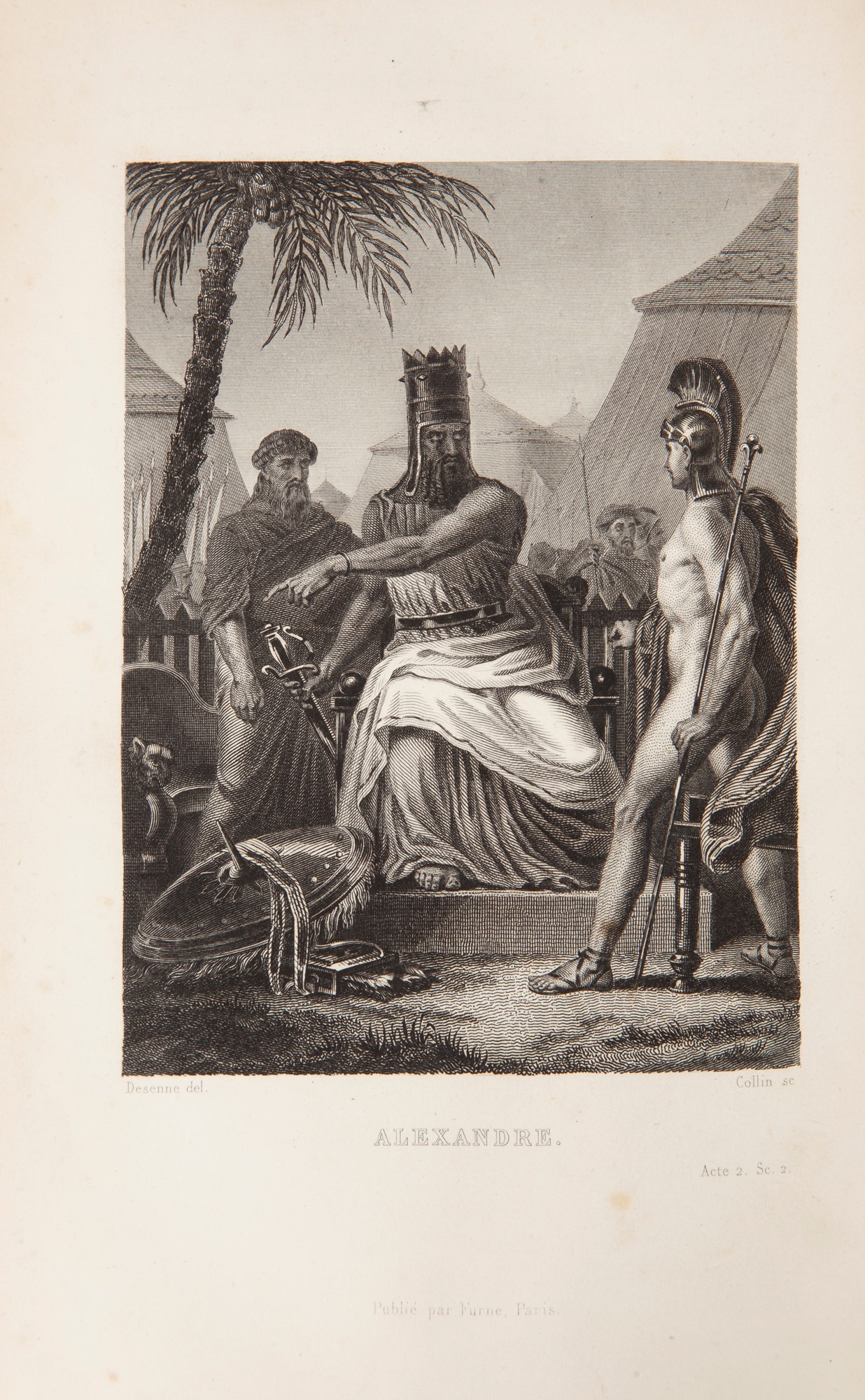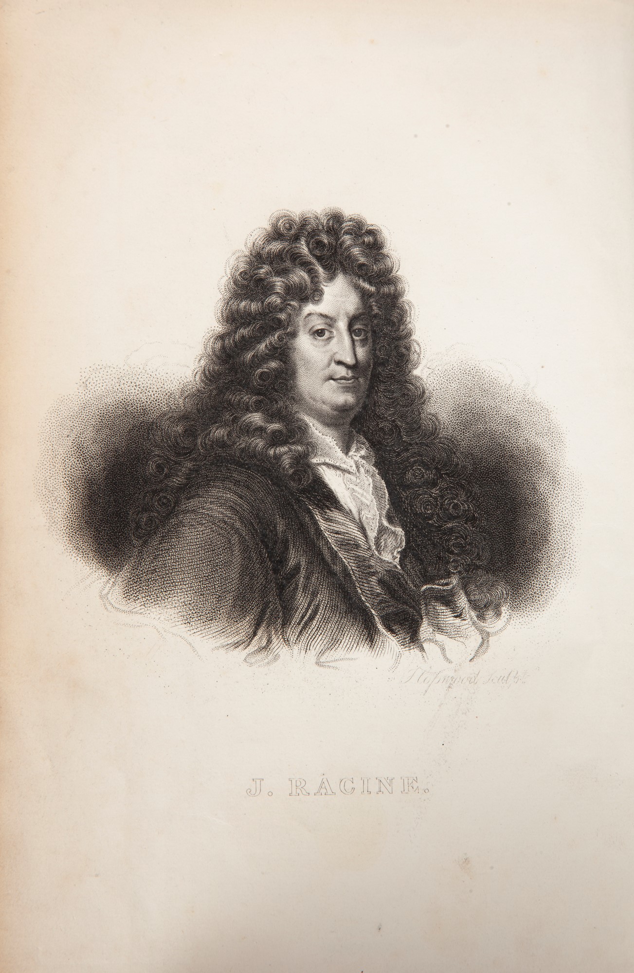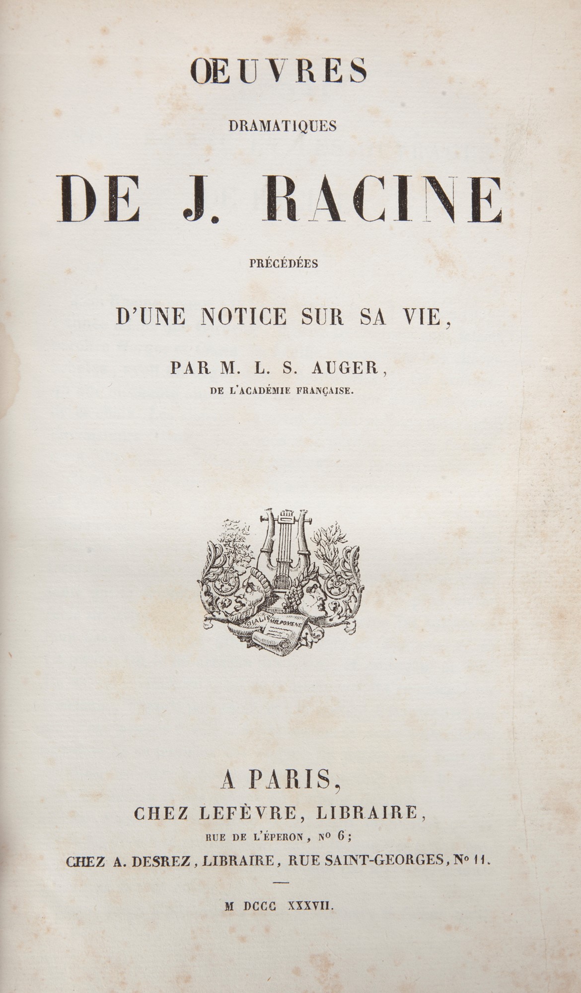 Jean Racine - Oeuvres Dramatiques Précédées d'une notice sur sa vie, par L. S. Auger In 8°. Edizione illustrata con 12 incisioni (una per ogni opera di cui raffigurano una scena) a piena pagina fuori testo, protette da veline, e con il ritratto dell'autore in antiporta. Legatura coeva in mezza pelle con titolo e fregi in oro al dorso. Chez Lefevre, Parigi 1837 cm 22,5x14