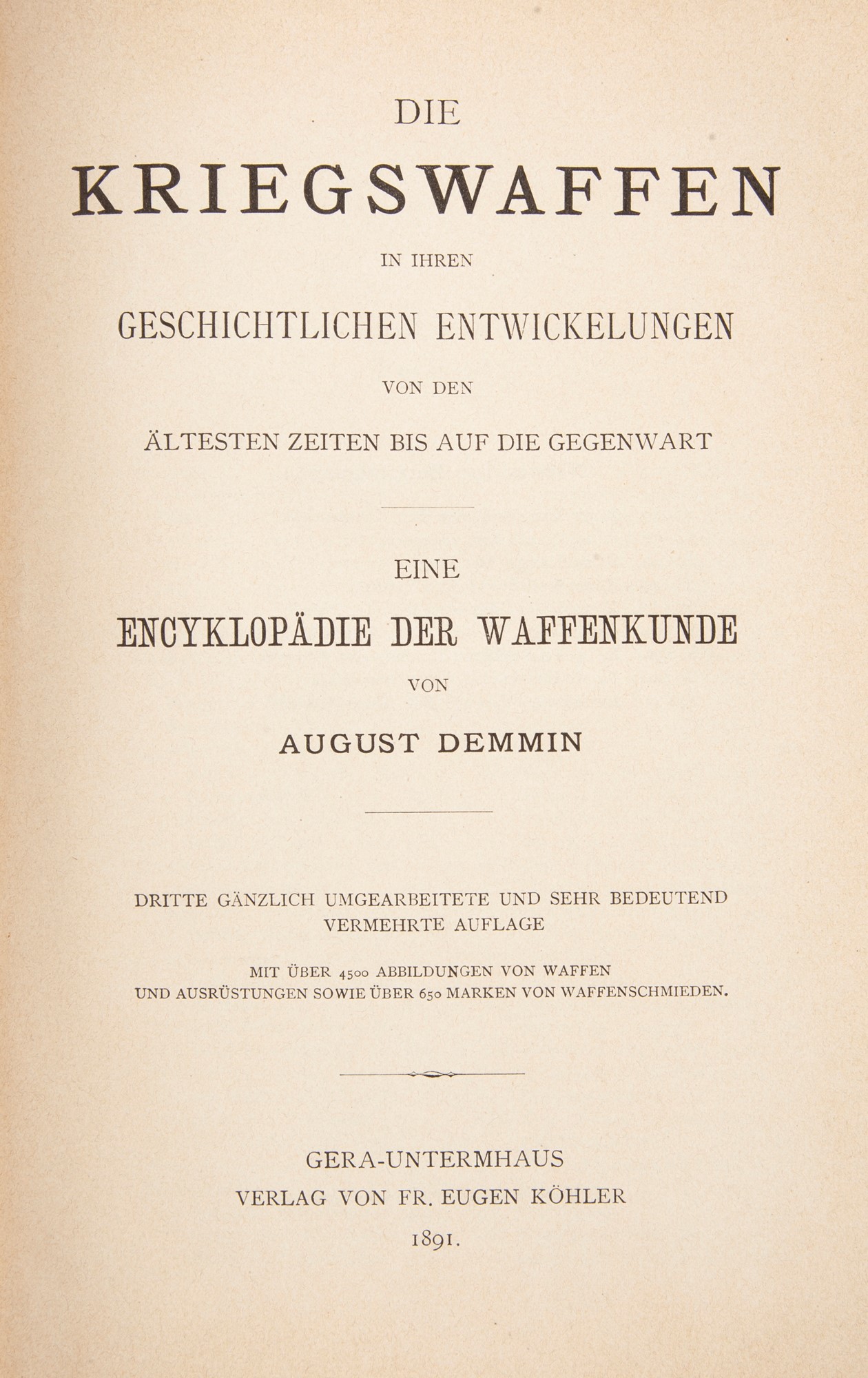 August Demmin - Die Kriegswaffen in ihren Geschichtlichen Entwickelungen Illustrato con 4.500 immagini di armi e 650 marchi. Legatura editoriale originale illustrata in oro sul dorso e sul piatto. Insieme nel lotto: Max Jahns - Entwicklungsgeschichte der Alten Trutzwaffen. Mit einem anhange uber die Feurwaffen, Mittler und Sohn, Berlino 1899. Kohler, Gera Untermhaus 1891 cm 23x17