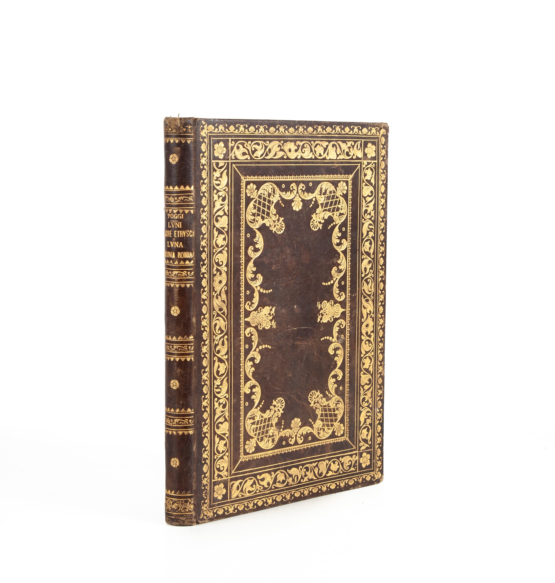 Gaetano Poggi - Luni ligure-etrusca e Luna colonia romana Illustrata con 4 Tavole a piena pagina e più volte ripiegate e con numerose figure nel testo. Splendida legatura artistica coeva in piena pelle con fregi in oro ai piatti e al dorso della Legatoria Antinori di Roma. Titolo in oro al dorso Beuf, Genova 1904 cm 25x17,5
