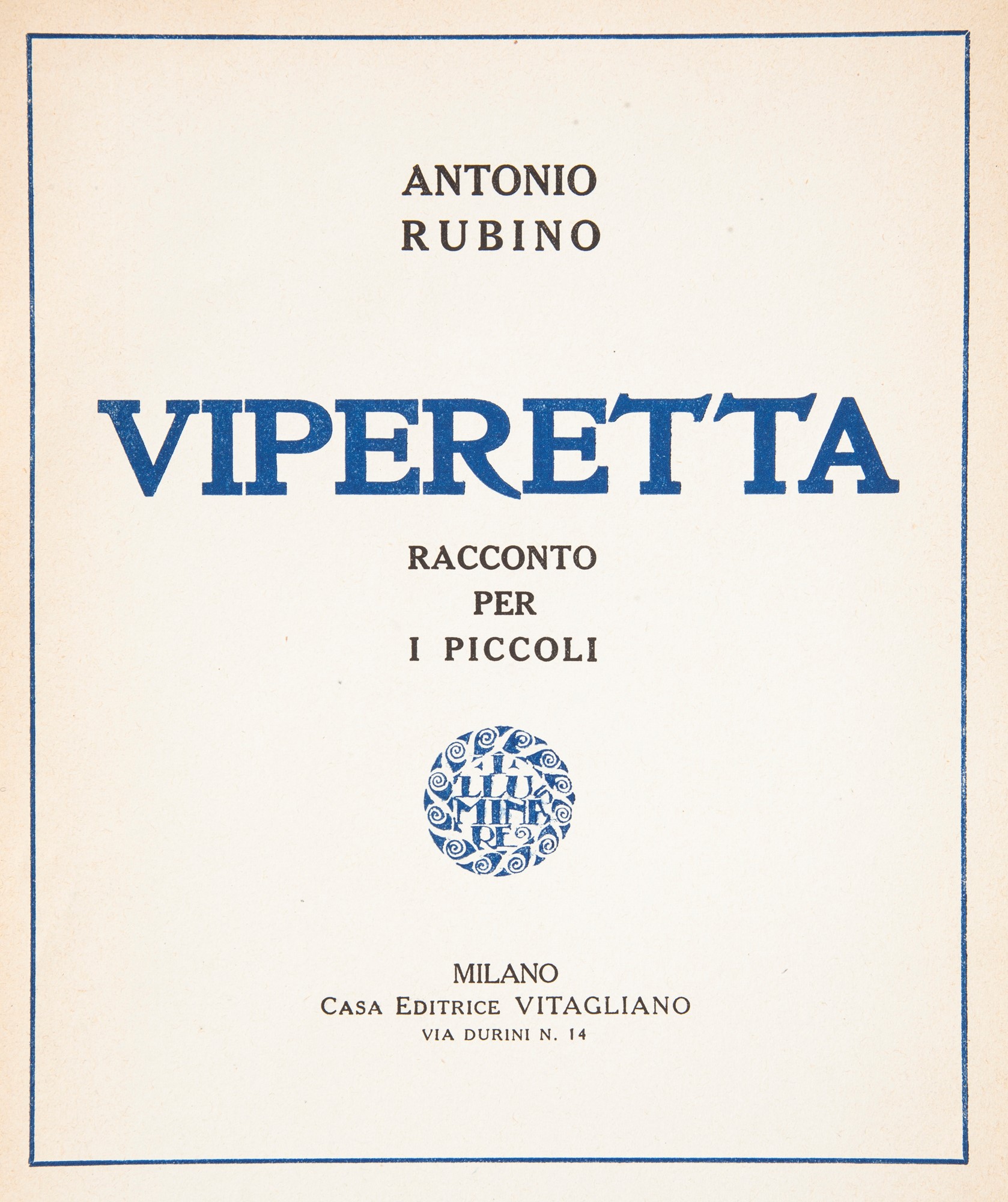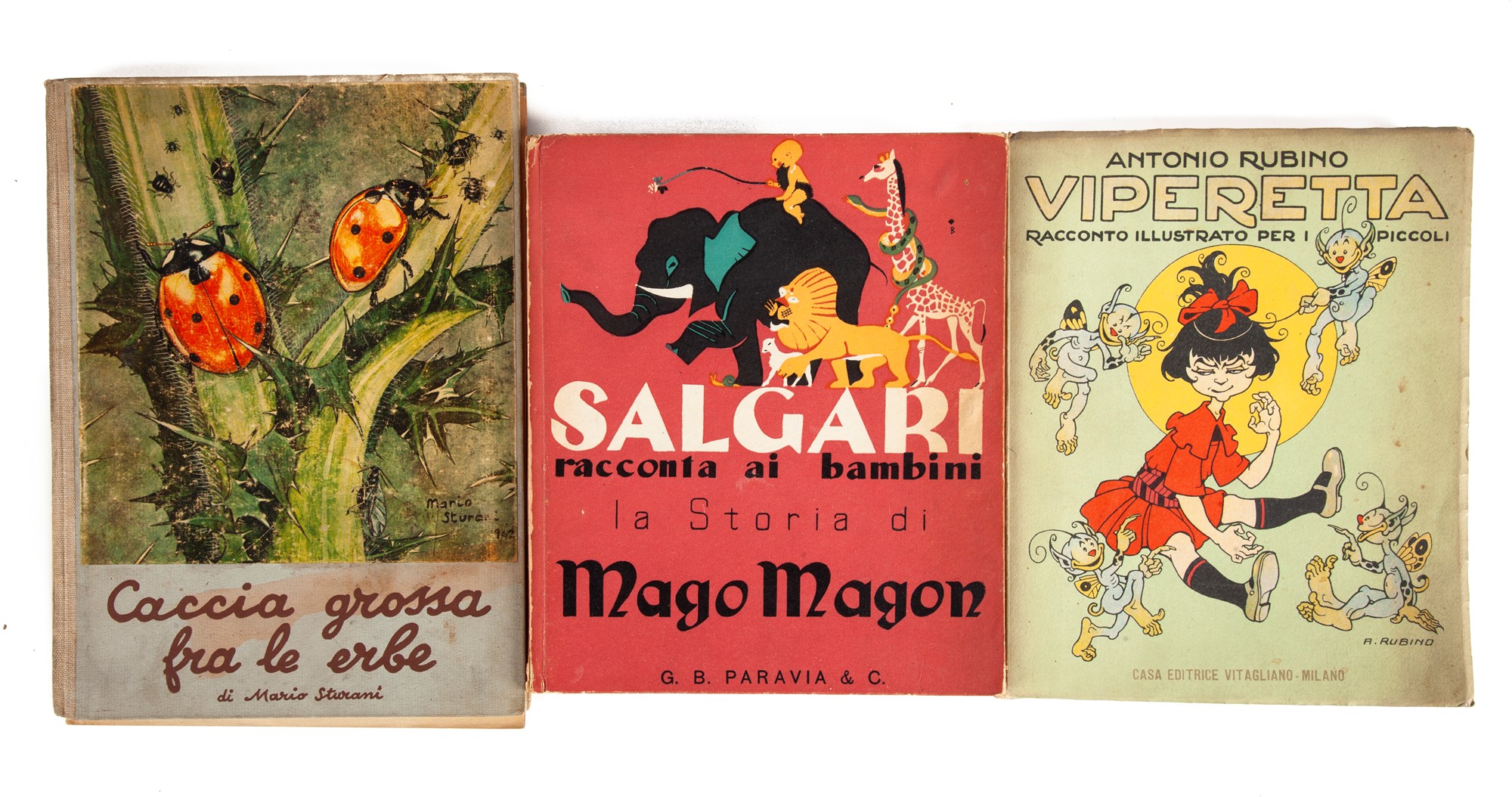 3 Libri per ragazzi: Antonio Rubino - Viperetta. Racconto per i piccoli. Prima edizione Casa editrice Vitagliano Milano 1919; Emilio Salgari - La Storia di Mago Magon, Paravia Torino 1938; Mario Sturani - Caccia Grossa fra le erbe, Einaudi Torino 1942.
