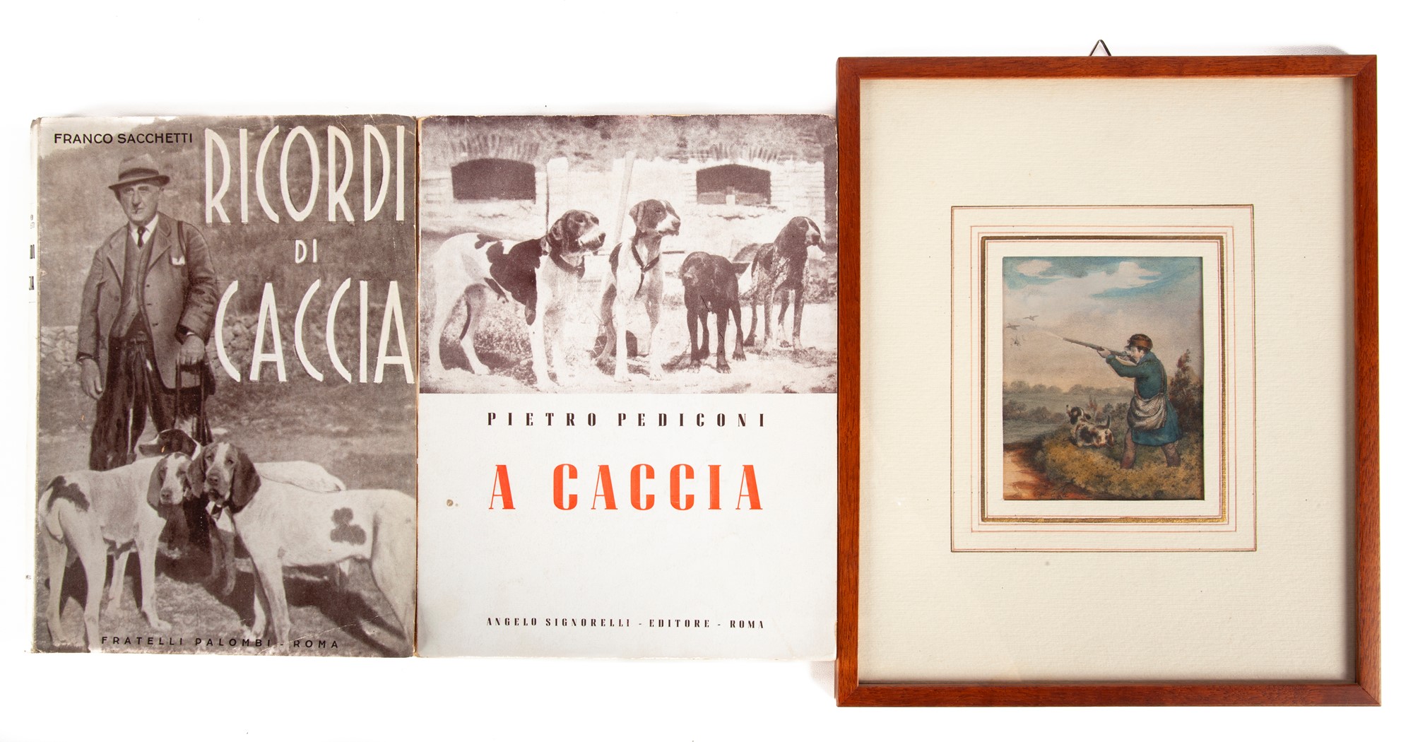 5 libri sulla caccia: Franco Sacchetti - Ricordi di Caccia, F.lli Palombi Roma s.d.; Arturo Mengoni - Coppiole e Padelle. Vita di caccia in Maremma. Prefazione di Yambo. Illustrazioni di P.Monni, Bemporad & Figlio Firenze 1921; Pietro Pediconi - A Caccia. Ricordi di vita vissuta. Con 60 illustrazioni, Signorelli Roma 1944; Tito Pagliari - Vecchi Cacciatori, Colombo Roma 1952 (2 esemplari); Incisione acquerellata con cacciatore che spara alle anatre Copertine e sovraccoperte originali illustrate. Ricordi di caccia slegato. L'incisione montata entro cornice con vetro cm 11x10