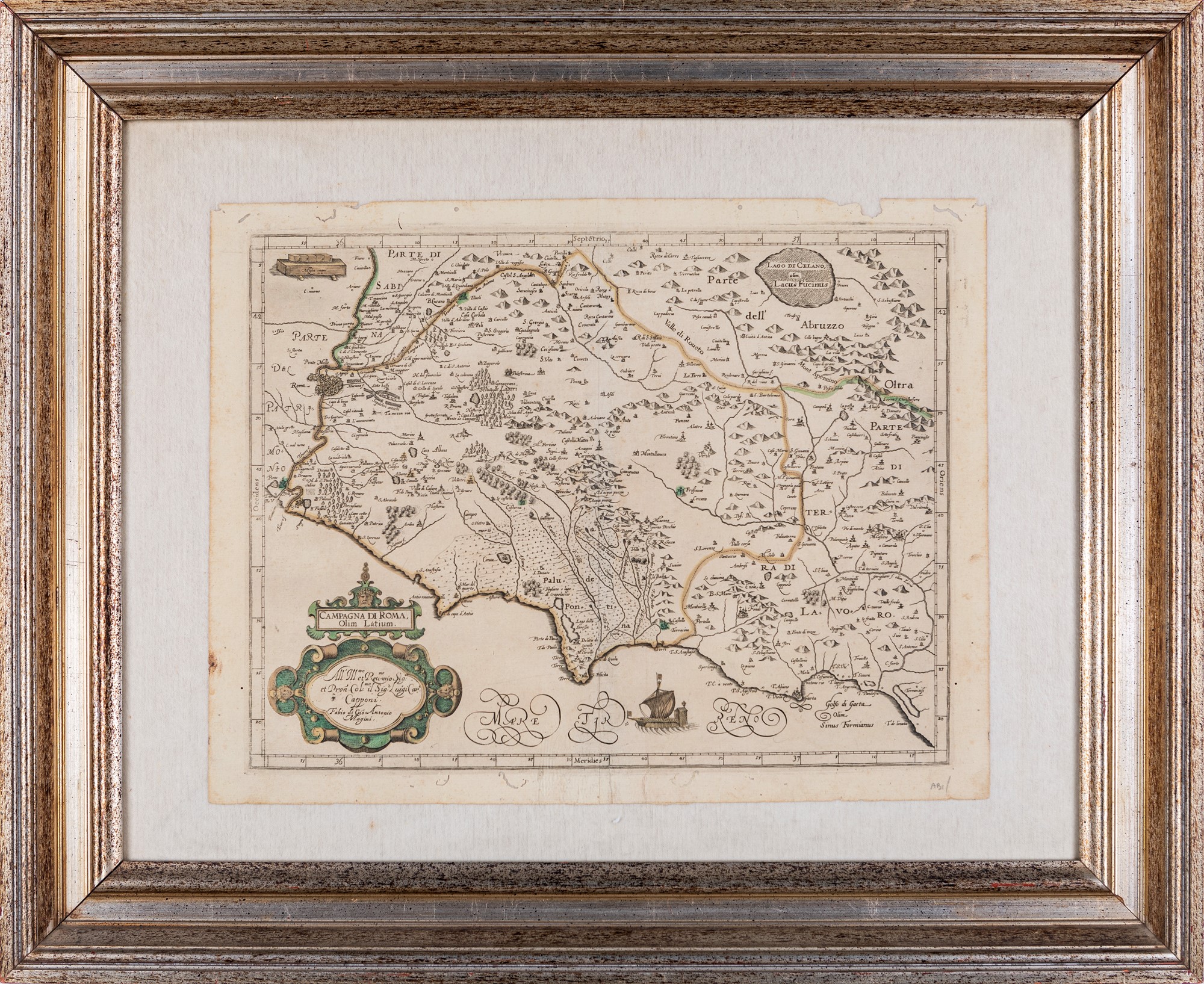 Giovanni Antonio Magini - Benjamin Wright - Campagna di Roma olim Latium Carta geografica del basso Lazio con Roma, colorata d'epoca, tratta da "L'Italia" stampata in veste definitiva a Bologna nel 1620 da Fabio Magini alla morte del padre, celebre geografo, cartografo, astronomo e matematico padovano la cui opera costituisce il primo atlante italiano, il cui incipit è costituito dalla carta di Bologna del 1594-5. Diviso per la prima volta coi confini del Tevere e dell'Aniene la carta del Lazio iniziata nel 1607 circa trae spunto da quelle cinquecentesche del Buonsignori, del Danti, del Bellarmato e finanche di quella di Eufrosino della Volpaia. Il Magini si avvalse di due dei maggiori incisori del tempo, Benjamin Wright ed Arnoldo Arnoldi. Entro cornice moderna di legno argentato cm 67x81 Incisione acquerellata su carta Fabio Magini, Bologna 1620 cm 37x47