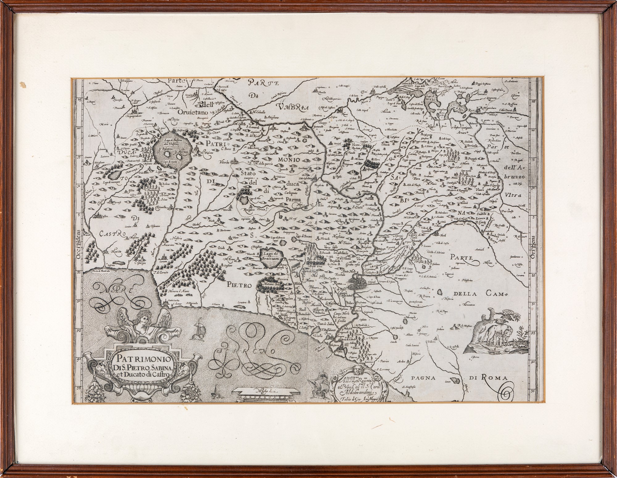 Giovanni Antonio Magini - Benjamin Wright - Patrimonio di S. Pietro Sabina et Ducato di Castro Carta geografica dell'alto Lazio tratta da "L'Italia" stampata in veste definitiva a Bologna nel 1620 da Fabio Magini alla morte del padre, celebre geografo, cartografo, astronomo e matematico padovano la cui opera costituisce il primo atlante italiano, il cui incipit è costituito dalla carta di Bologna del 1594-5. Diviso per la prima volta coi confini del Tevere e dell'Aniene la carta del Lazio iniziata nel 1606 circa, trae spunto da quelle cinquecentesche del Buonsignori, del Danti, del Bellarmato e finanche di quella di Eufrosino della Volpaia. Il Magini si avvalse di due dei maggiori incisori del tempo, Benjamin Wright ed Arnoldo Arnoldi. Entro cornice moderna di legno color noce cm 49x62. Incisione su carta Fabio Magini, Bologna 1620 cm 36x47