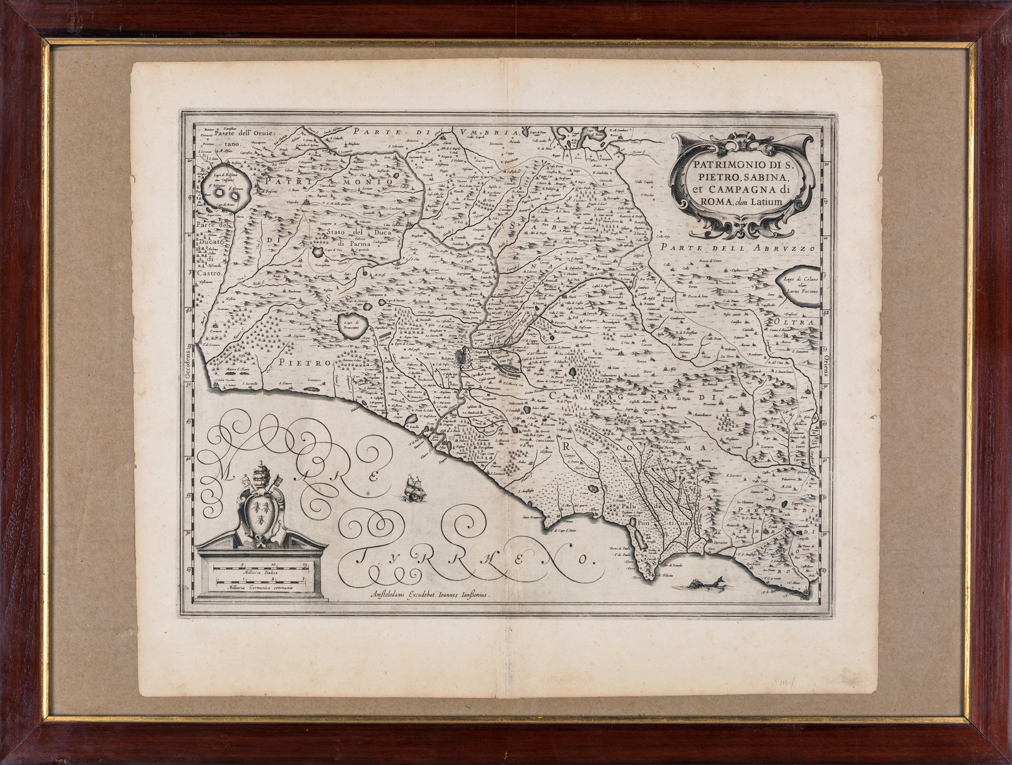 Johannes Janssonius - Patrimonio di S. Pietro Sabina, et Campagna di Roma, olim Latium Rara prima edizione della carta, senza testo al verso, pubblicata da Hondius e Jansonius in "Theatrum Italiae", la terza parte di un atlante sperimentale in via di realizzazione contenente carte di entrambi gli autori: "This third volume was published by Henricus Hondius, but it contains almost as many maps by Jansssonius as by Hondius. Here find for the first time 39 new maps of Italy". Entro cornice di legno color noce cm 61x81 Incisione su carta Johannes Janssonius, Amsterdam 1636 cm 40x52