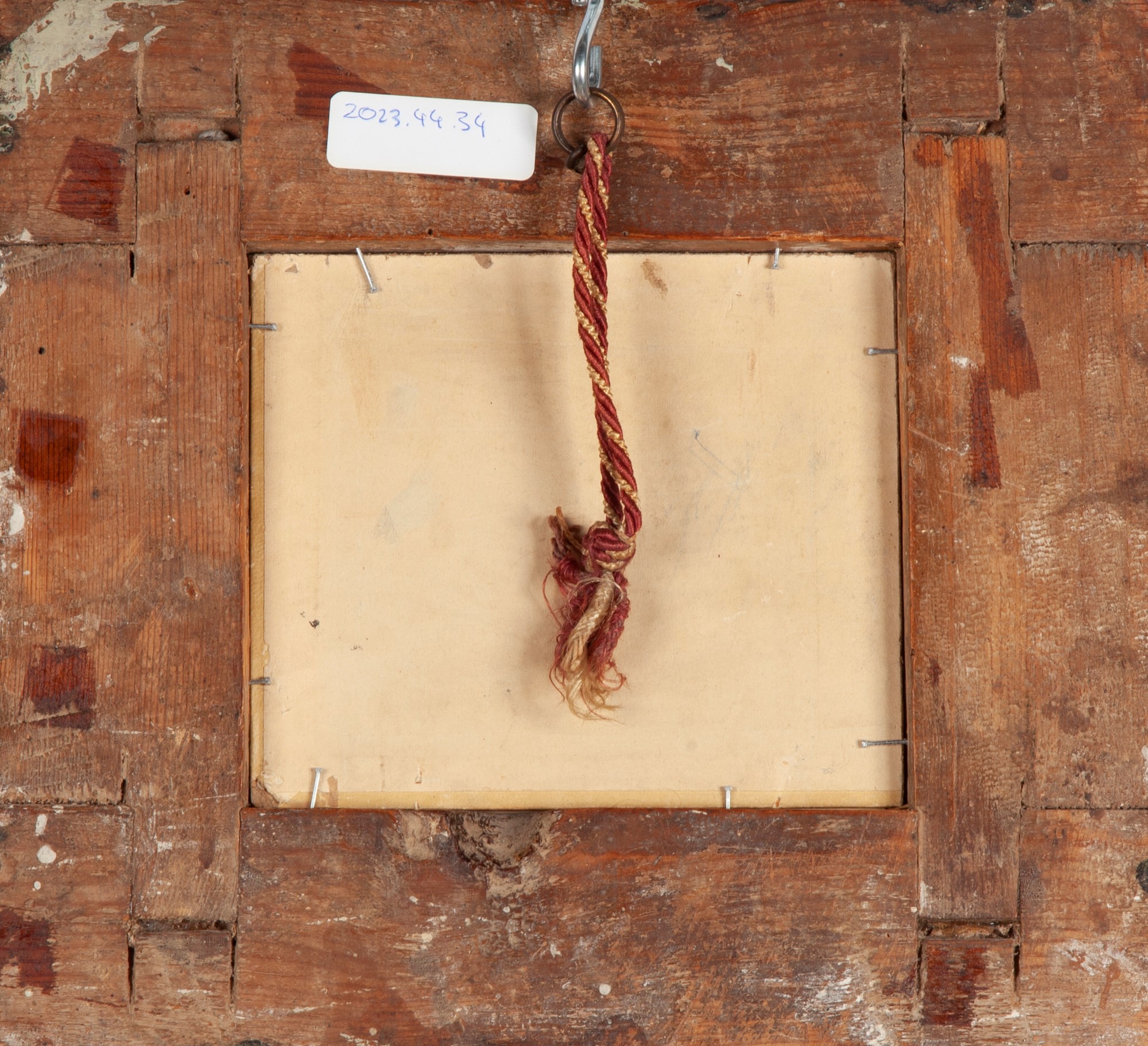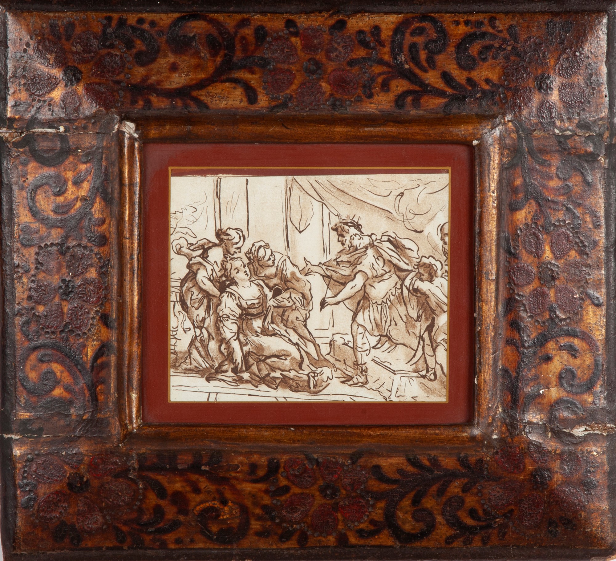 Anton Domenico Gabbiani Inv. et Del. - Antonio Chiocchi Sc. - La regina Ester davanti ad Assuero Incisione rifilata con perdita del testo tratta da: Raccolta di cento Pensieri diversi di Anton Domenico Gabbiani, Stamperia Mouckiana Firenze 1762. Opera del pittore fiorentino tardobarocco, accademico e maestro di Benedetto Luti. Entro antica cornice del XVII secolo in legno dipinto e dorato (luce cm 12,8x15; ingombro cm 26x28,5). Vetro con passepartout dipinto. Incisione su carta 1762 cm 10,8x13,8
