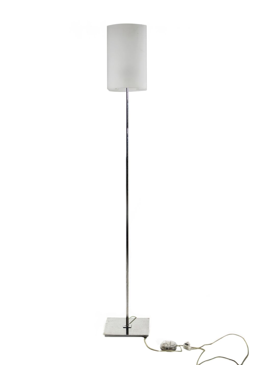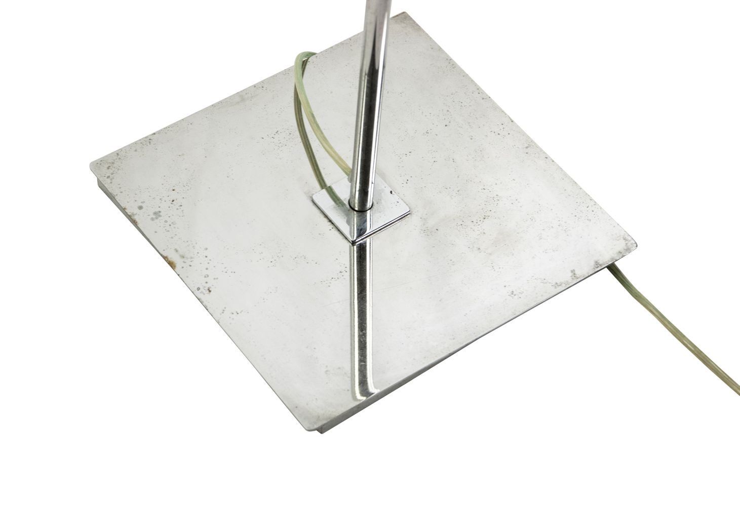 Lampada da terra vintage Favel cromata con base quadrata in acciaio cromato.