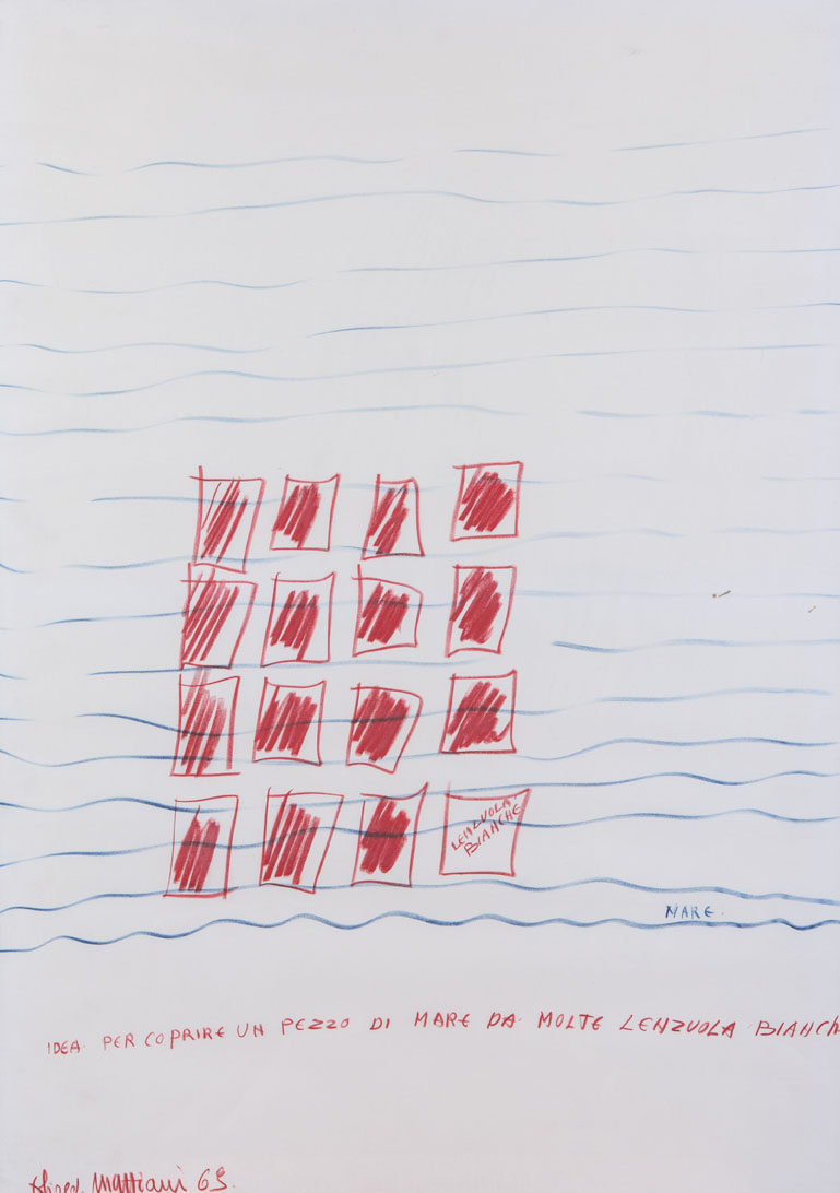 Idea per coprire un pezzo di mare da molte lenzuola bianche (Idea for covering a bit of the sea with lots of white sheets), 1969, mixed media on paper