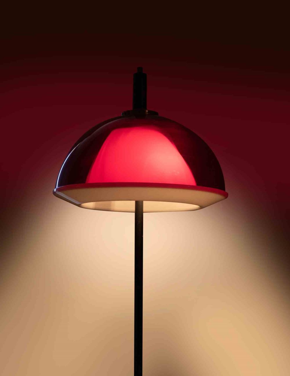 Una bella lampada vintage con base rotonda in marmo e paralume in plexiglass rosso.