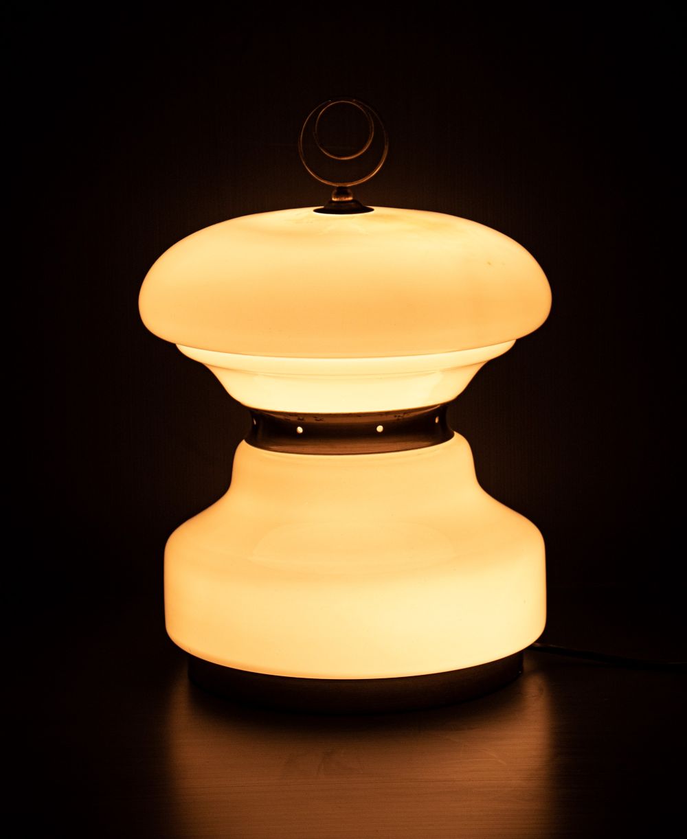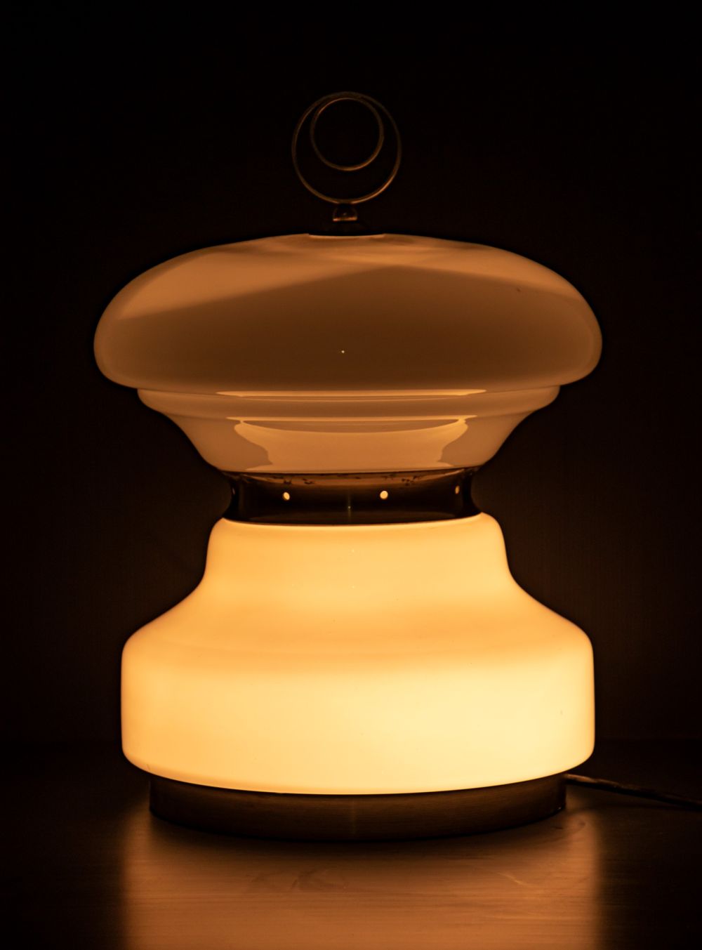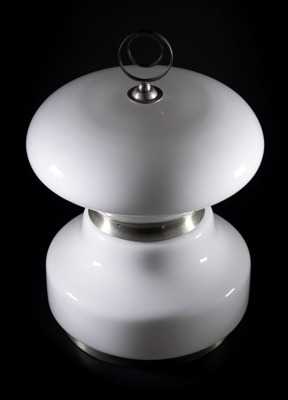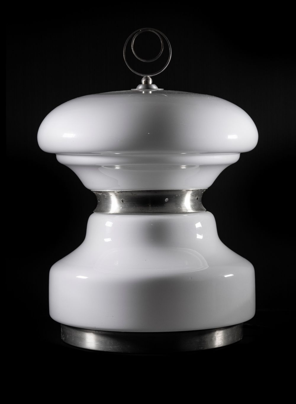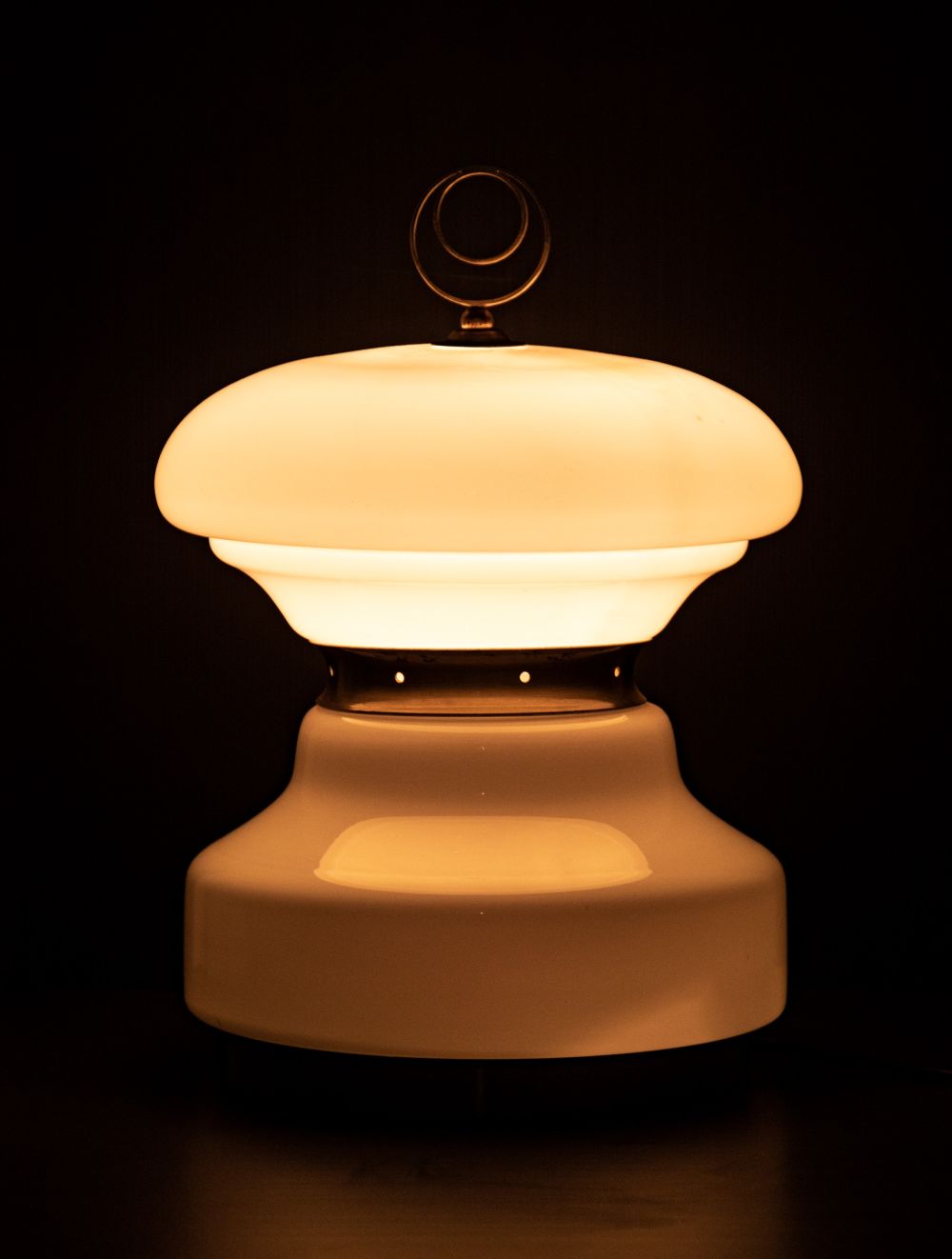 Una bella lampada vintage composta da due moduli che possono essere accesi insieme o singolarmente, realizzata in vetro bianco.