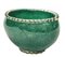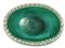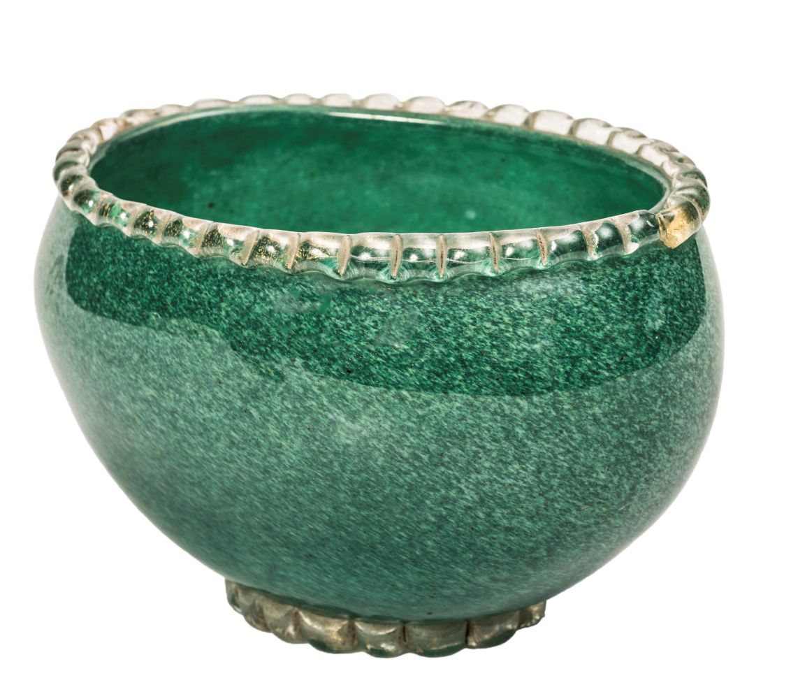 Colore verde, tecnica pulegoso. Nastri di vetro e avventurina applicati a caldo sulla fascia superiore e sulla base.